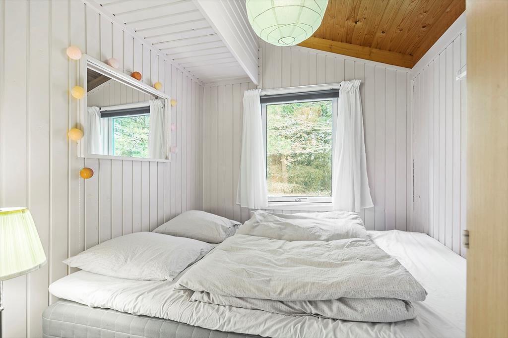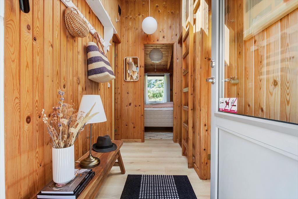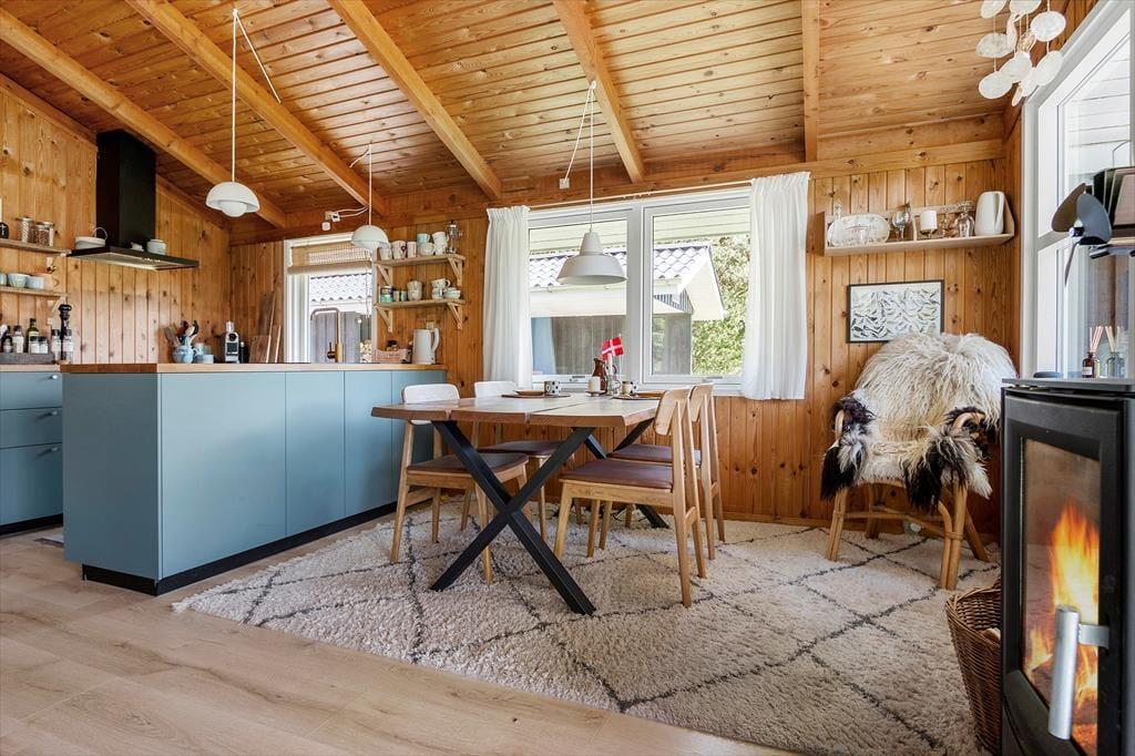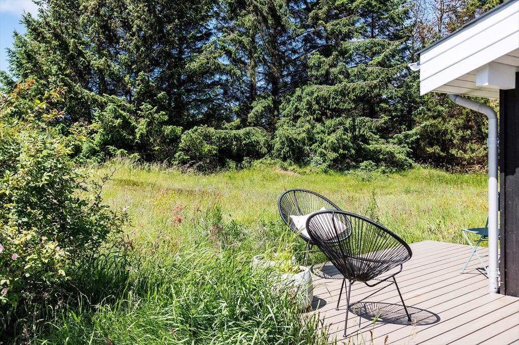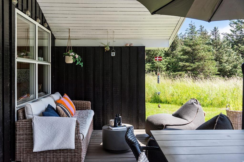 Det sortmalede træsommerhus har ligget her på Oddervej siden 1986, og det er tydeligt at se på den velholdte facade, at det er blevet passet og plejet med årene. Samme indtryk får man inden døre, hvor huset blandt andet er blevet opdateret med et flot køkken, en god brændeovn og en fladskærm i stuen. Rummets rustikke trævægge og hyggelige møblement er med til at skabe den helt rette sommerhusstemning, og det har selvfølgelig også betydning for feriefornemmelsen, at I har udsigt til naturgrundens viltre beplantning. Planløsningen byder for øvrigt på et badeværelse med bruser, og endelig er der to soveværelser.