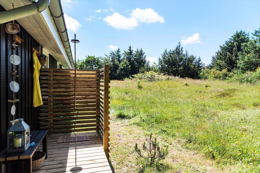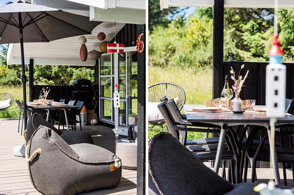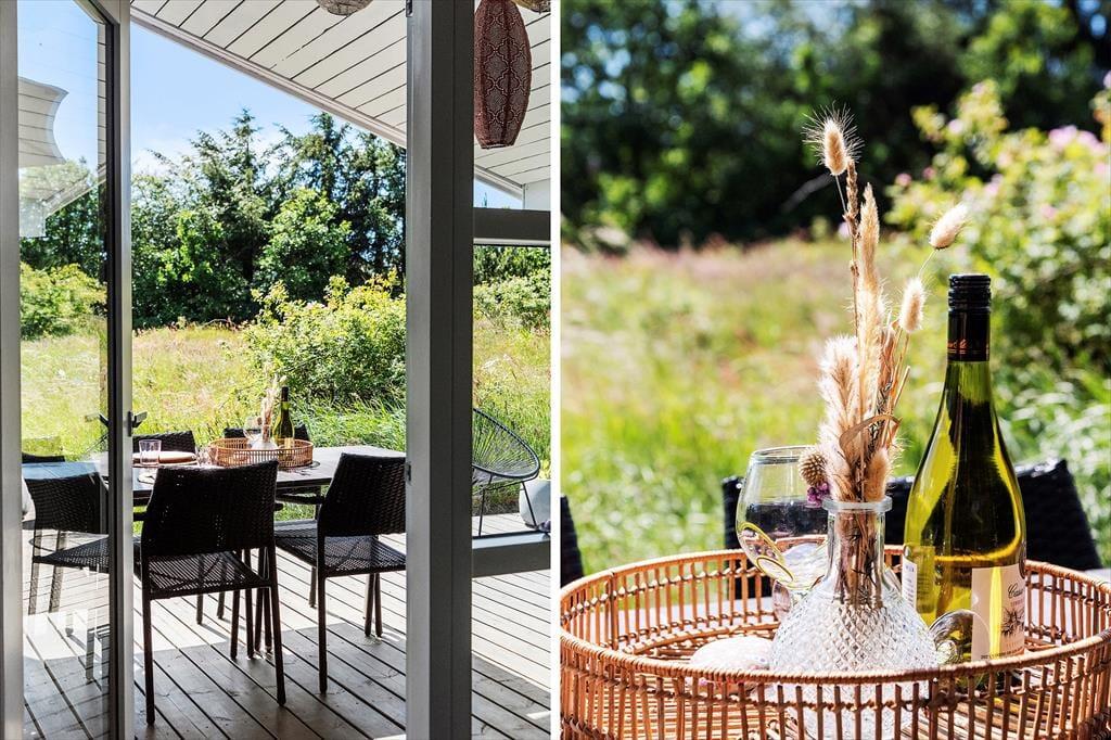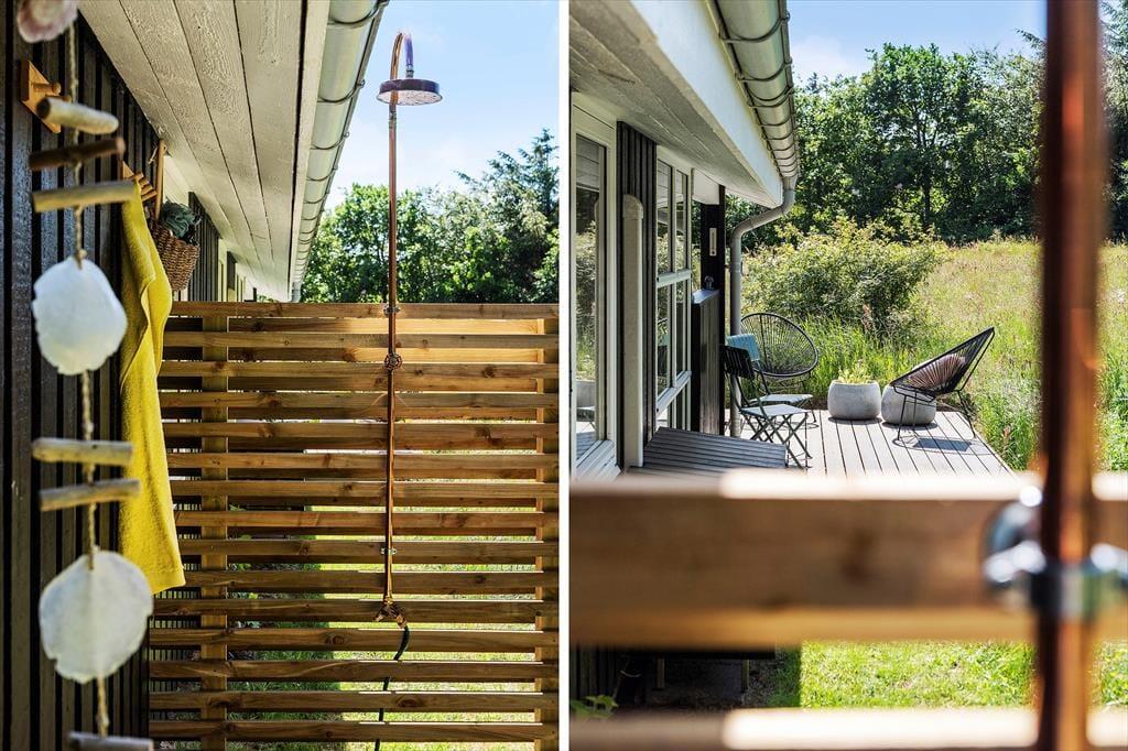 Hvis solskinnet og den naturskønne udsigt giver jer lyst til at rykke driverlivet ud i det fri, kan det nemt lade sig gøre. Der er nemlig to gode træterrasser lige ved huset: Den ene er stor og delvist overdækket, og den anden ligger lige i smørhullet mellem huset og carporten, så de er begge dejlige opholdspladser. Med så stor en naturgrund er der for øvrigt god afstand til nabohusene, så I kan se frem til at lege og slappe af i ugenerede og rolige omgivelser. Derudover byder dette skønne fristed på en udendørs bruser med varmt vand.