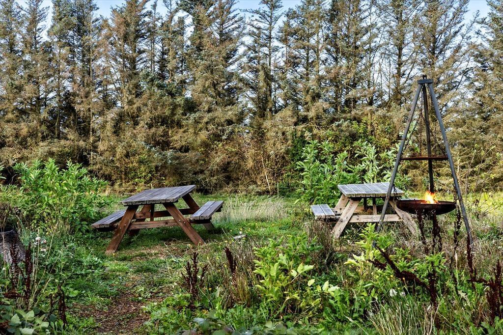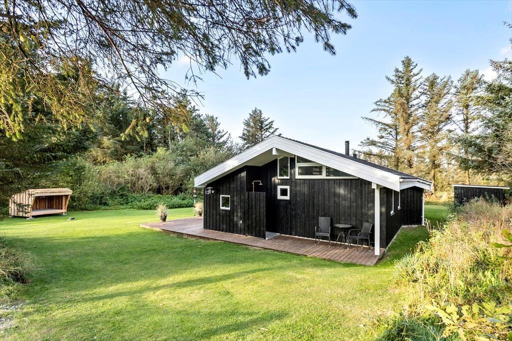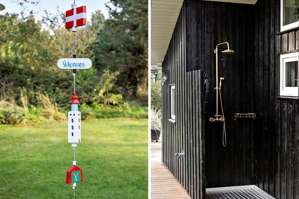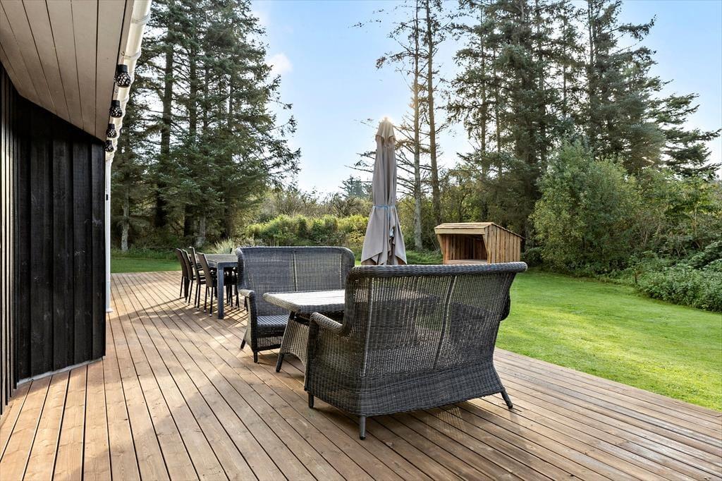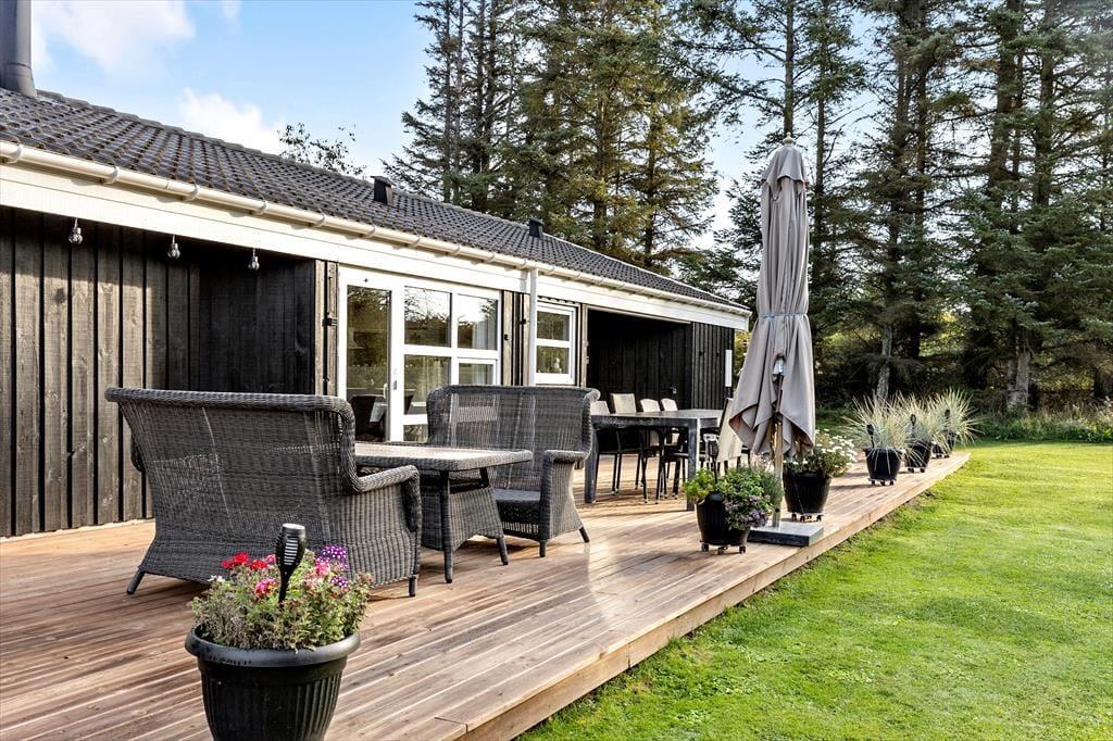 Fra stuen har I direkte adgang til en stor træterrasse, så driverlivet kan nemt flyttes ud i det fri, når vejret er til det. Solforholdene er gode, og der er havemøbler, liggestole, parasol og en grill til rådighed, så I har et glimrende udgangspunkt for at slappe af og nyde ferien under åben himmel. På grunden er der for øvrigt en god græsplæne at lege på, og randbeplantningen skærmer hele herligheden godt af.