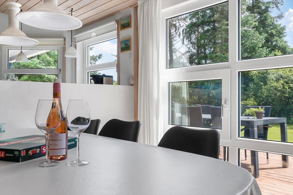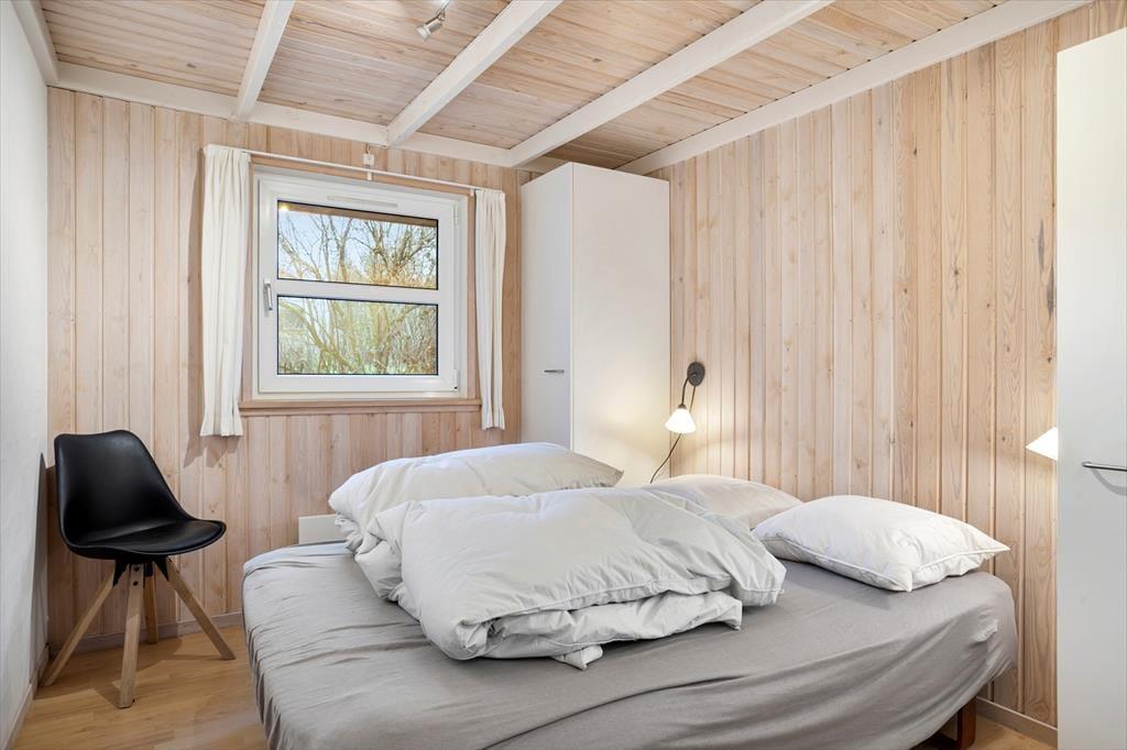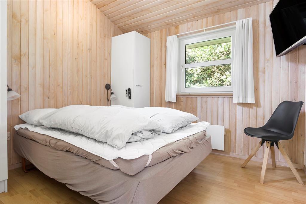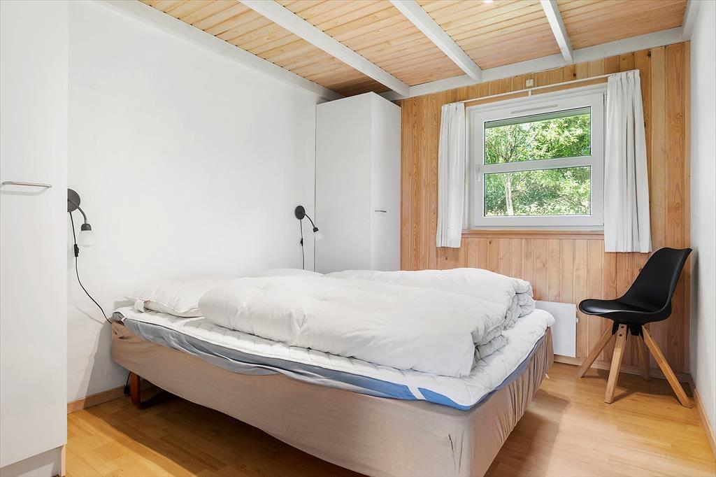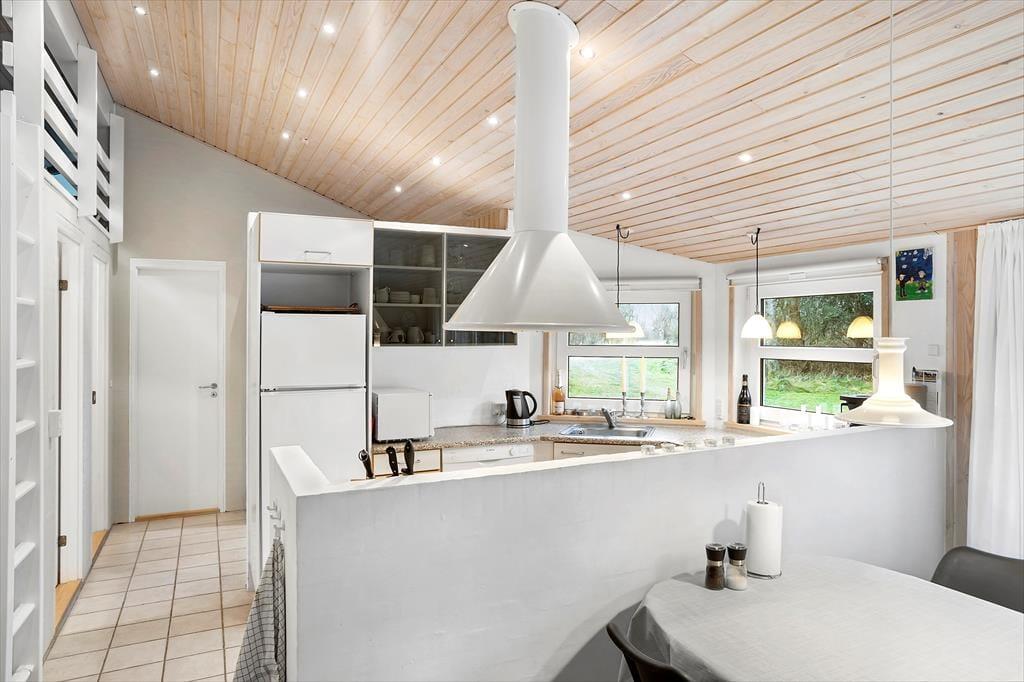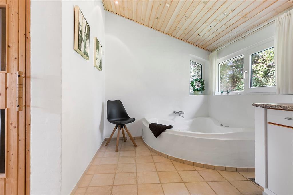 Det 95 m2 store sommerhus har en glimrende planløsning til seks personer. Stue og køkken er forbundne, så I kan nyde samværet hen over halvmuren, mens en del af selskabet laver mad og resten hygger sig med kortspil eller krydsogtværser ved spisebordet. Måske kravler de yngste op for at lege på hemsen, og der er også rig mulighed for at slænge sig med en god bog i stuens sofaafdeling. Der er tre gode soveværelser, og på det største af de to badeværelser er der ikke bare bruser, men også spabad og sauna til livsnyderne.