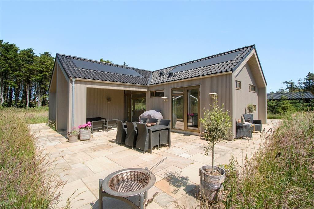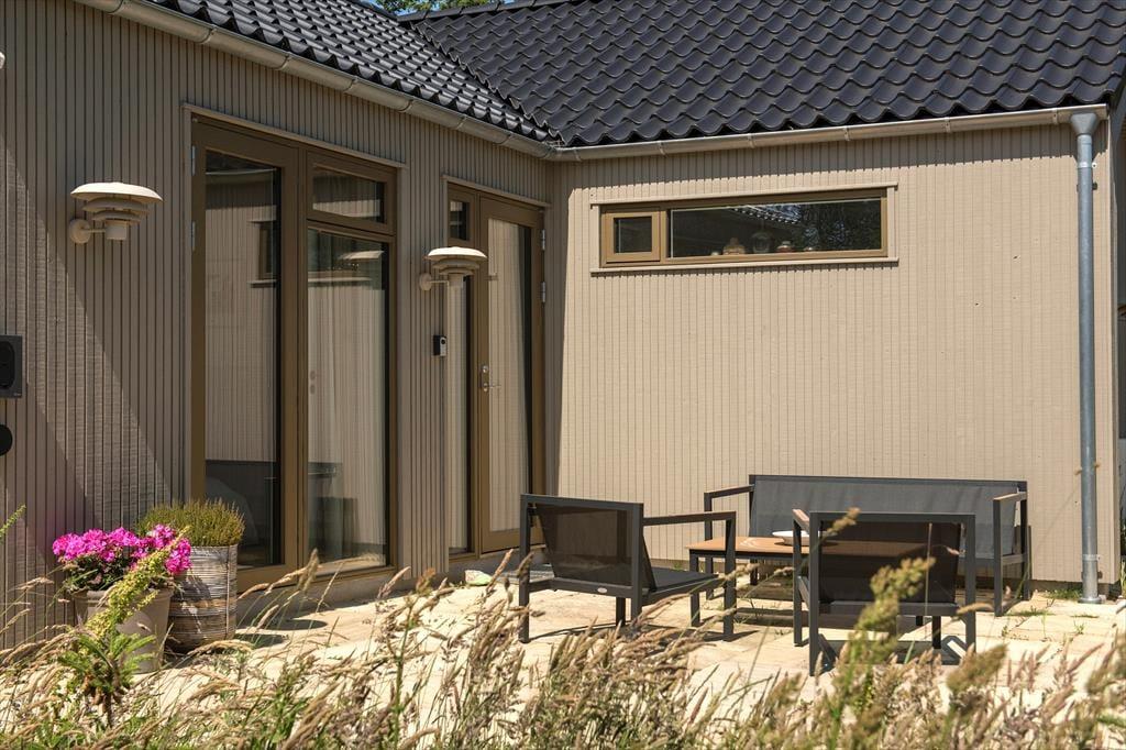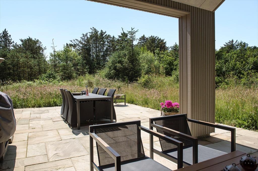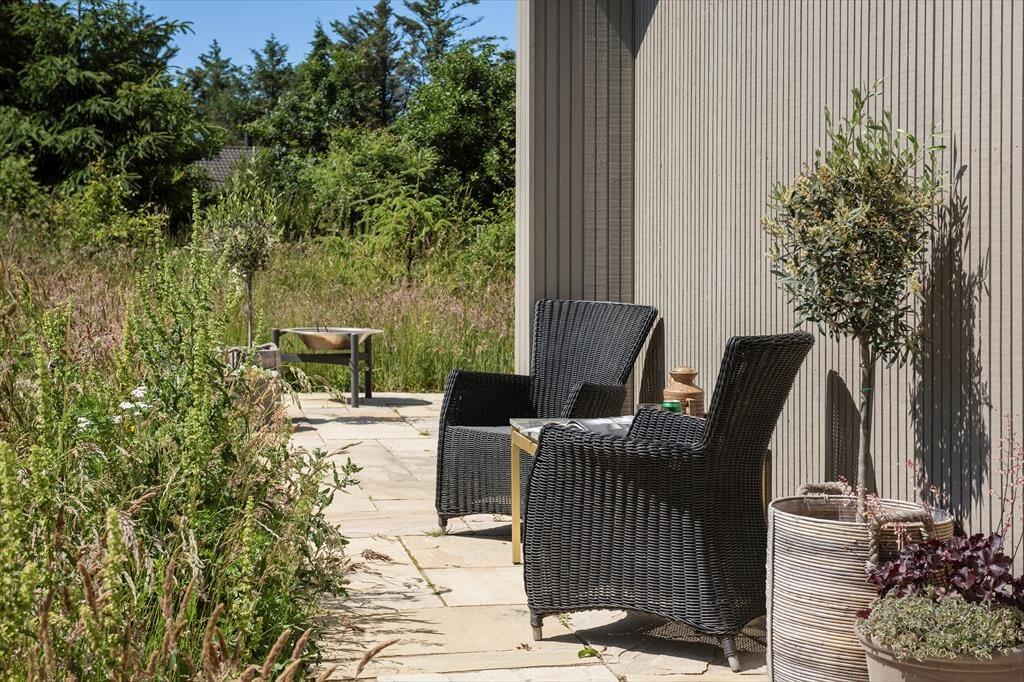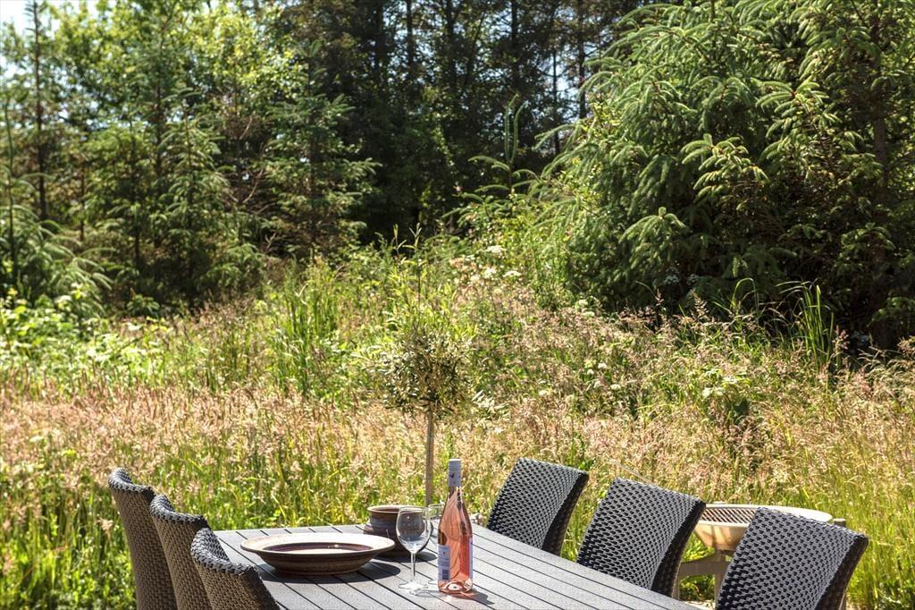 Den solrige terrasse indbyder til afslapning. Nyd din morgenkaffe her eller grill en lækker middag om aftenen. Der er terrasse hele vejen rundt om huset, så det er altid muligt at finde en plads i solen eller i læ for Vestenvinden. Huset ligger i skoven tæt ved havet. Grunden er med naturlig vegetation og er omgivet af graner og buske, der giver privatliv og ro.