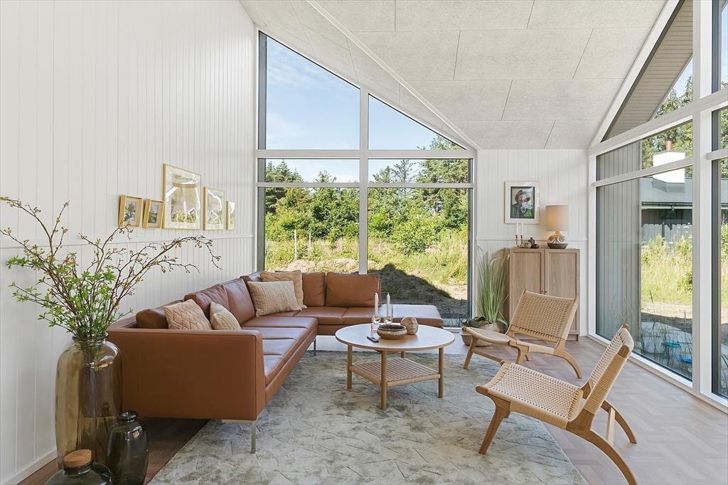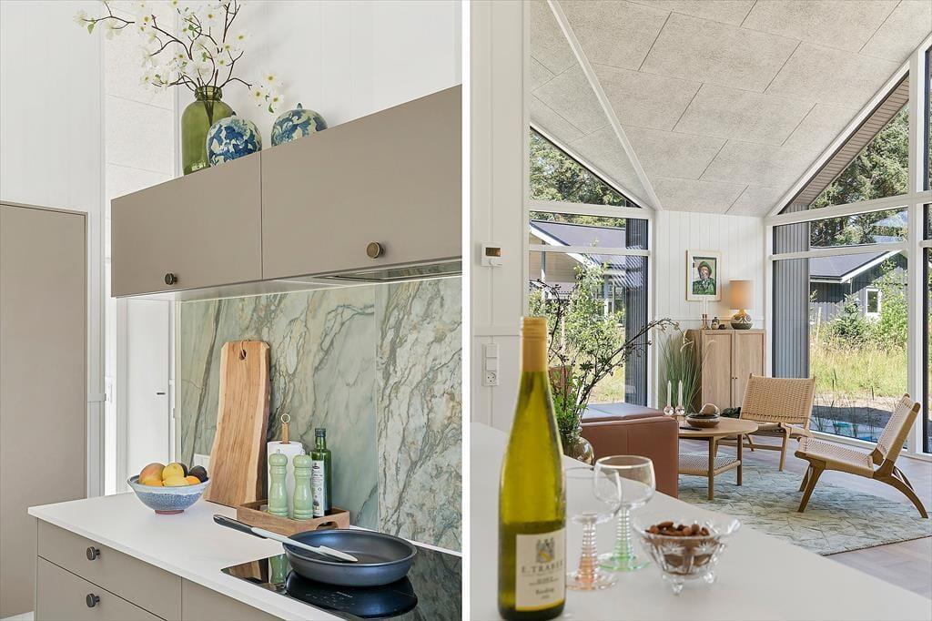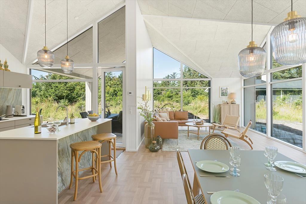 Træd ind i den lyse stue, hvor store vinduer giver dig udsigt til den omkringliggende natur. Slå dig ned i de komfortable møbler eller tag et brætspil for hele familien ved det store spisebord. Køkkenet er moderne og veludstyret med alt, hvad du behøver til madlavning. Den åbne planløsning gør det nemt at samles omkring spisebordet.