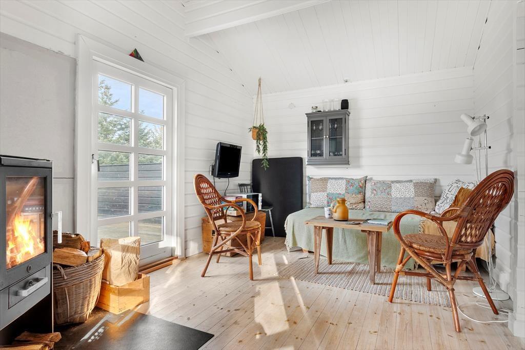 Når du træder indenfor i dette charmerende sommerhus, bliver du mødt af et dejligt lysindfald, som straks får rummet til at føles åbent og indbydende. Den hyggelige stue er centrum for samværet, hvor brændeovnen sætter den perfekte ramme for lune og hyggelige aftener. Loftet er højt og åben, hvilket skaber en følelse af rummelighed og frihed. Sommerhuset byder på to gode soveværelser, som indbyder til afslapning efter en lang dag ude i naturen. Der er lagt op til ro og idyl – perfekt til både stille stunder og hyggelige samvær.