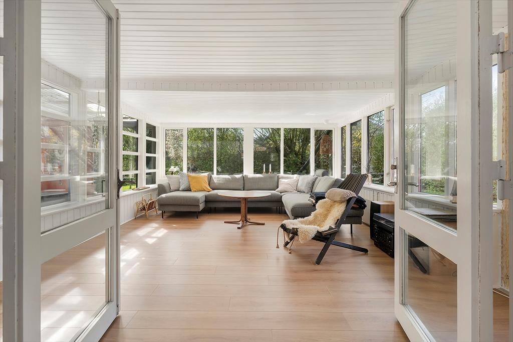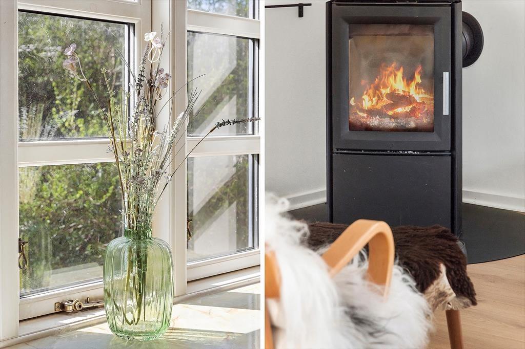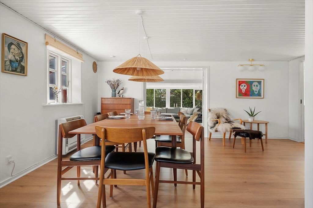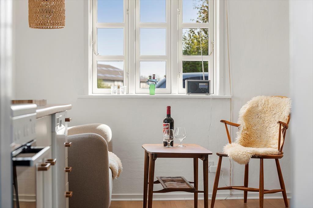 Det hyggelige stråtækte hus, der er opført helt tilbage i år 1900 og nænsomt renoveret i 2025, byder velkommen med en lys og hjemlig atmosfære. Huset kombinerer sin originale charme med moderne komfort – og det mærkes, allerede når du træder ind. Indretningen er skandinavisk og varm med lyse overflader, rustikke detaljer og møbler, der indbyder til afslapning. Det åbne opholdsrum skaber en naturlig ramme for fællesskabet, hvor køkken og stue smelter sammen, så samtalerne kan fortsætte fra madlavning til sofahygge. Det store lysindfald og udsigten til de grønne omgivelser gør rummet til et naturligt samlingspunkt, og her kan du virkelig mærke, at ferien er i gang.