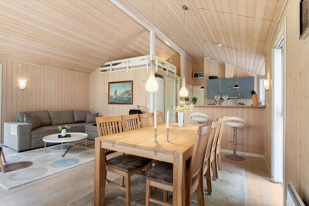 Sommerhuset er indrettet i en moderne og stilren stil med varme materialer og masser af lys, der strømmer ind gennem de store vinduespartier. Det åbne opholdsrum forener køkken og stue, så ferien kan nydes i selskab med hinanden – også mens du laver mad. Her er det nemt at forestille sig lange samtaler over spisebordet, mens brændeovnen knitrer i baggrunden og skaber en hyggelig varme på kølige aftener. Huset rummer tre indbydende soveværelser og en hems med ekstra sovepladser – perfekt til børn eller teenagere, der gerne vil have deres egen hyggekrog. Begge badeværelser er smagfuldt indrettede, og det største af dem byder på både spa og sauna – den ultimative luksus efter en lang dag i naturen eller ved havet. Her er alle rammer sat for en ferie i roens og samværets tegn.