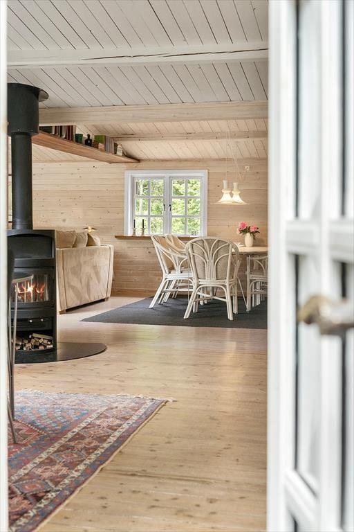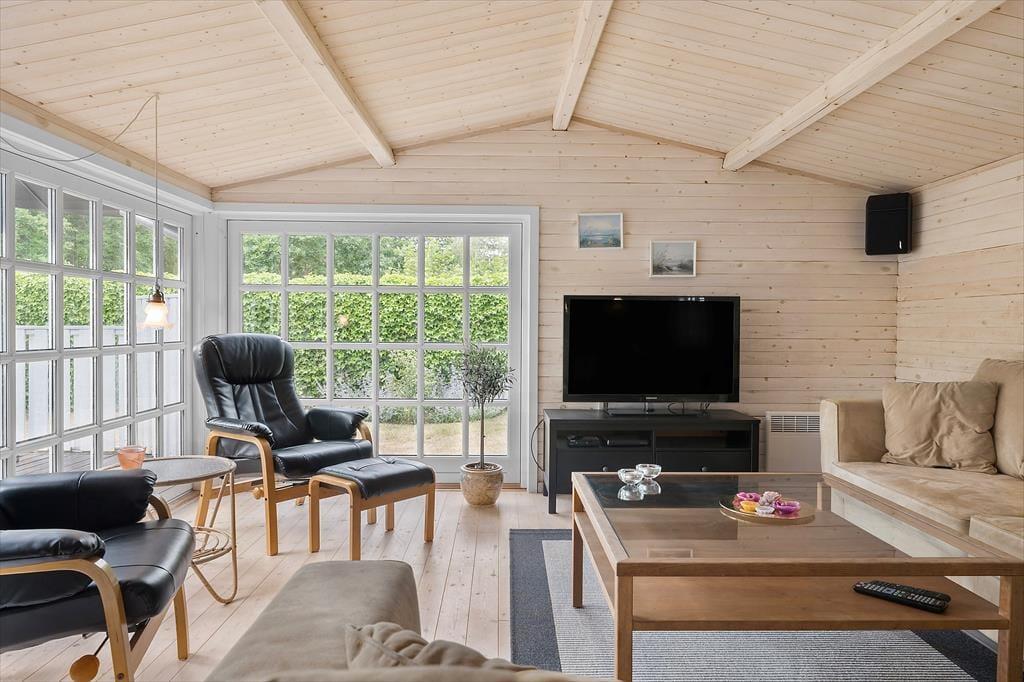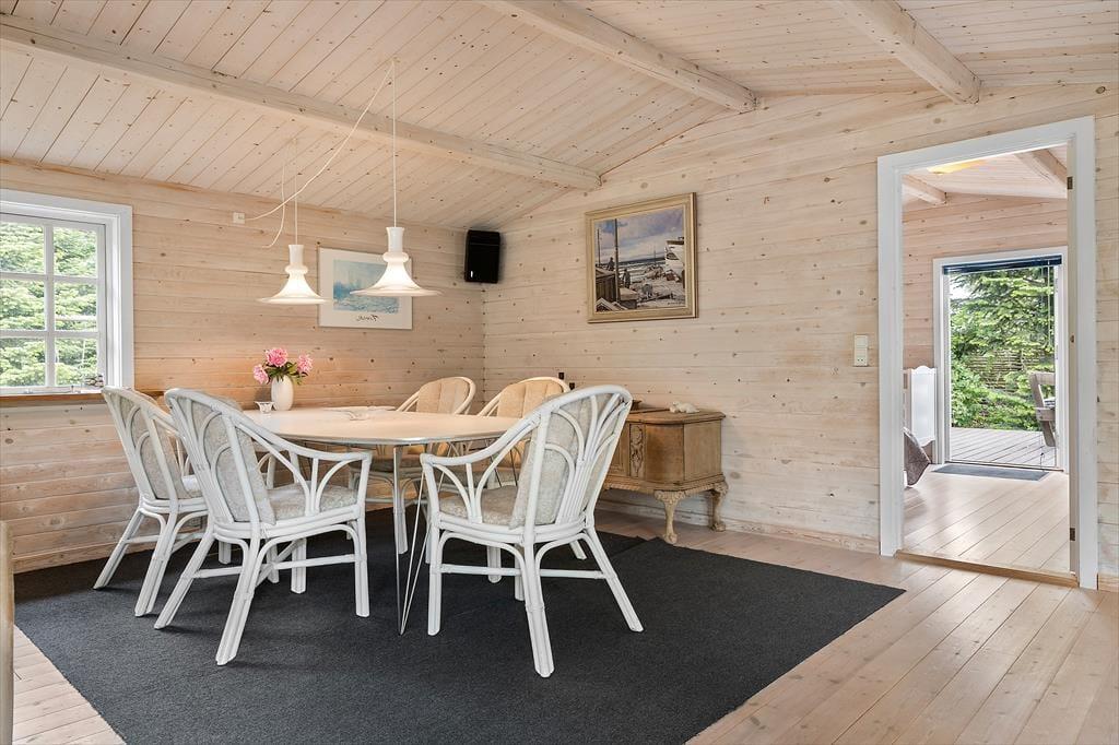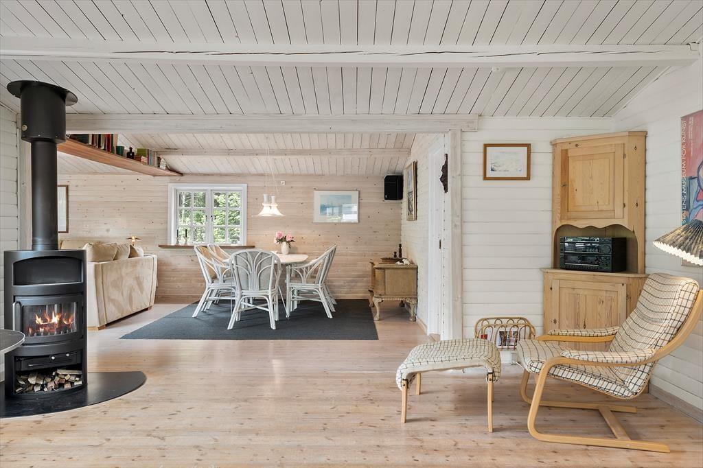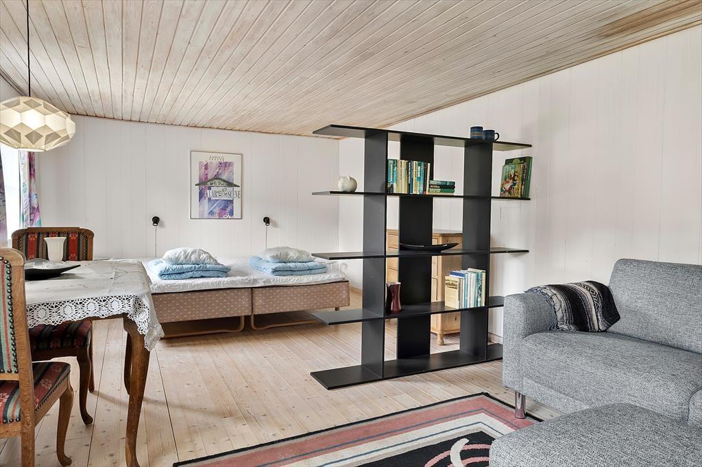I den ene del af stuen er et godt lysindfald fra de store vinduespartier og rigeligt med plads til at I kan nyde gode stunder sammen i sofaarrangementet, uanset om I vil se en film eller spille et spil. I den anden del af stuen, er spiseplads og tværgående loftsbjælker, som giver en god sommerhusfornemmelse og en loftshøjde på 1,90.