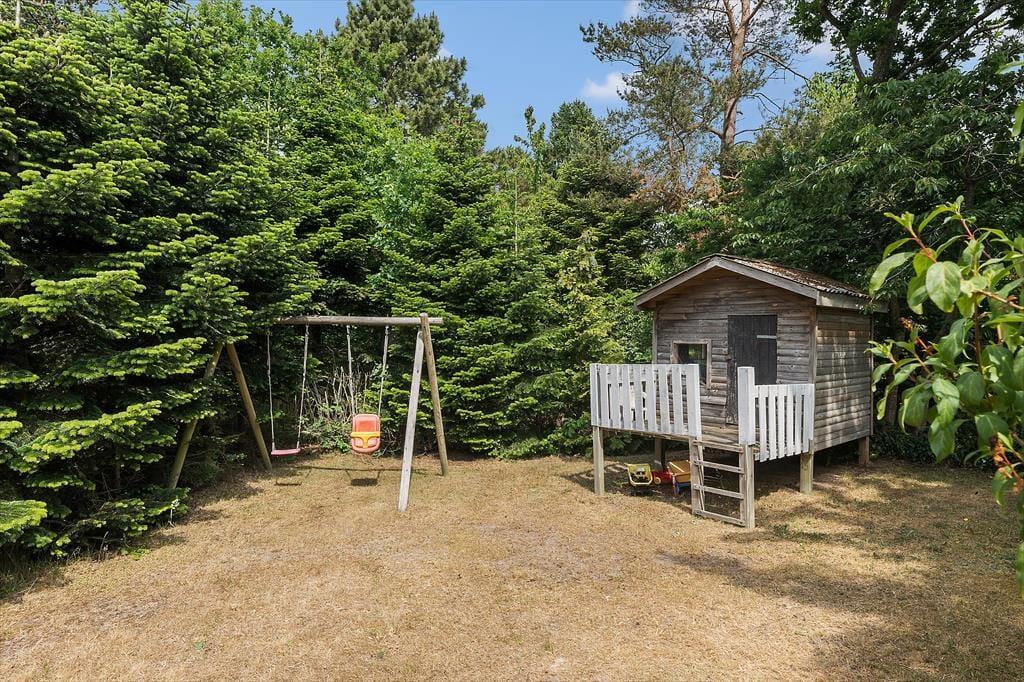 Børnene kan have det sjovt på gyngestativet, i sandkassen eller i legehuset, mens de voksne slapper af på terrassen.