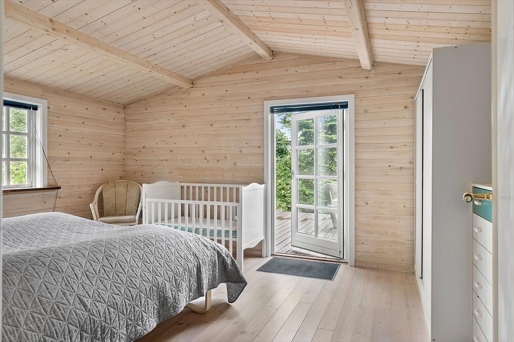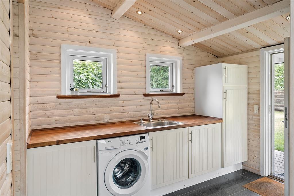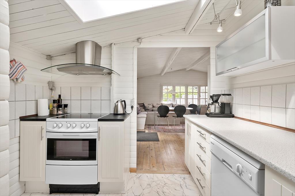 Køkkenet har alt hvad I behøver for at skabe et godt måltid og er i den ene side lavloftet, hvilket giver en charmerende og rustik stemning. Sommerhuset byder også på et praktisk bryggers, et lyst badeværelse, to gode soveværelser, hvor det ene har en komfortabel dobbeltseng, og det andet er indrettet med køjeseng, perfekt til børnene.
