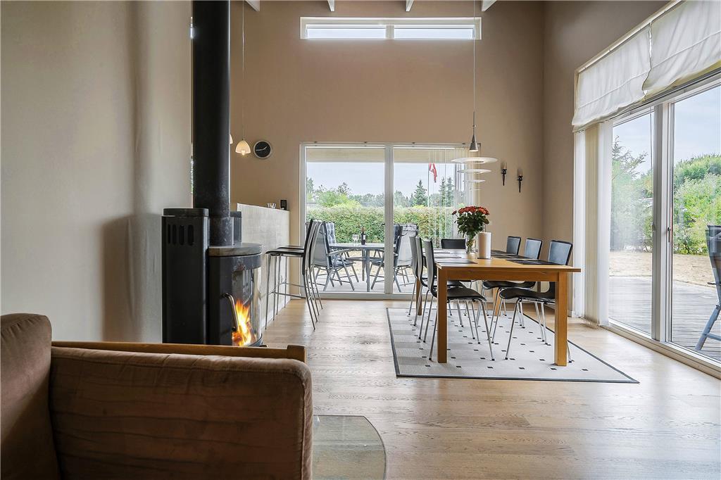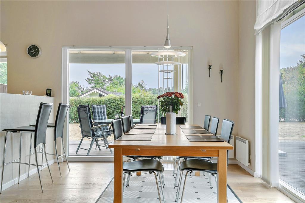 Udelivet er en vigtig del af ferien, og her er sommerhusets store træterrasse det oplagte sted at tilbringe dagen. Den har både en åben og en overdækket del, så du kan nyde solen fra morgenstunden eller finde skygge midt på dagen. På terrassen kan du dække op til grillaftener, læne dig tilbage i en liggestol eller blot nyde en stille stund med udsigten til haven. For børnene er der sandkasse og gynge, så de trygt kan lege, mens de voksne slapper af. Den udendørs bruser er perfekt efter en tur i havet, og de grønne omgivelser giver plads til både leg, afslapning og hyggelige stunder i det fri.