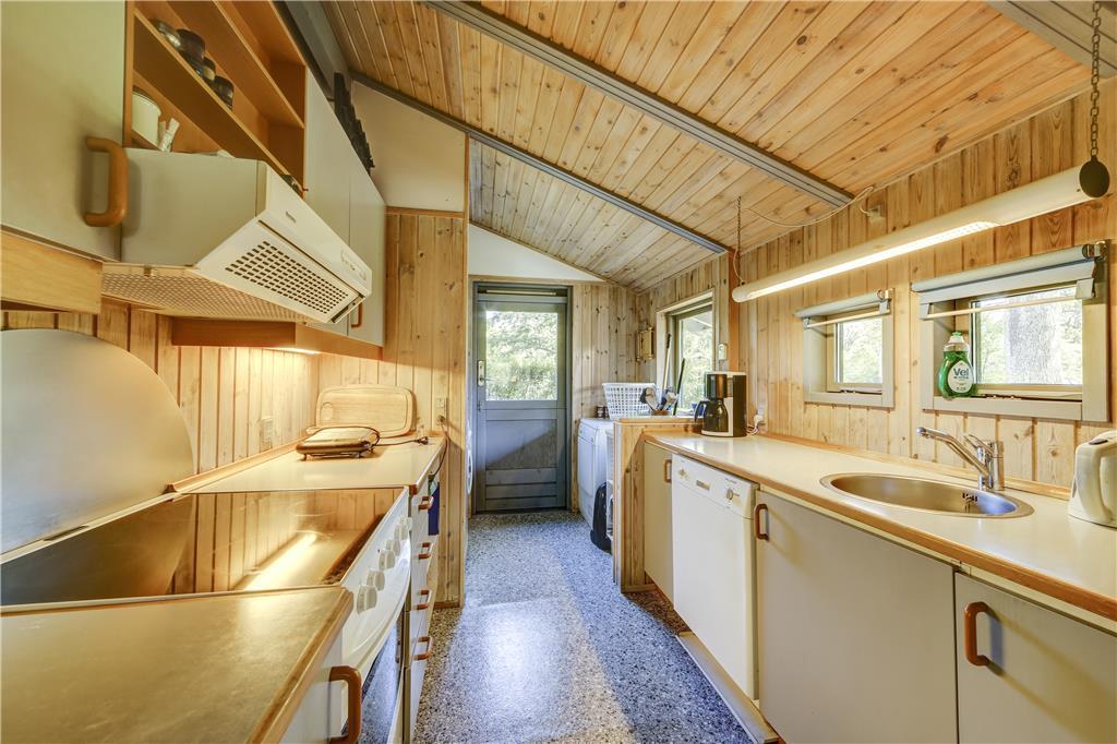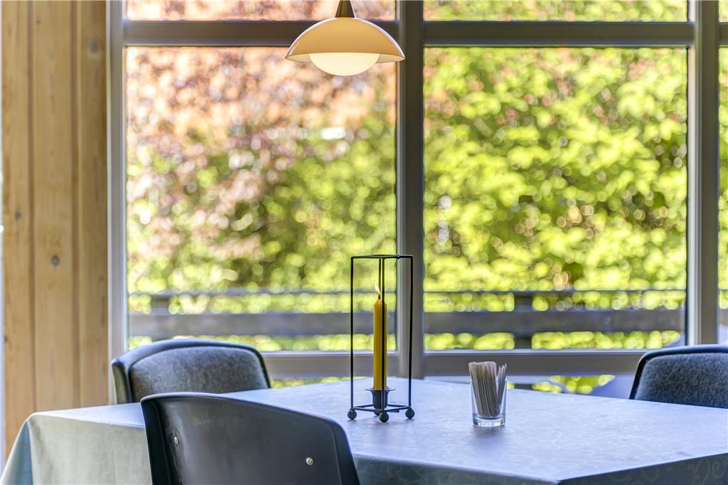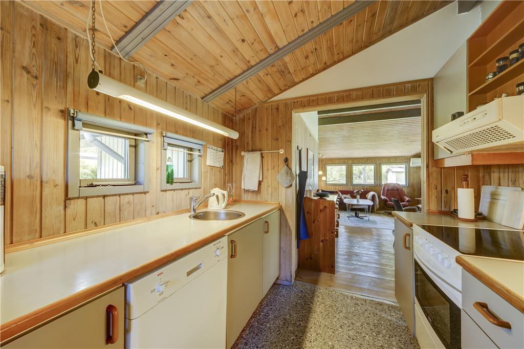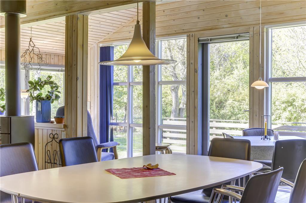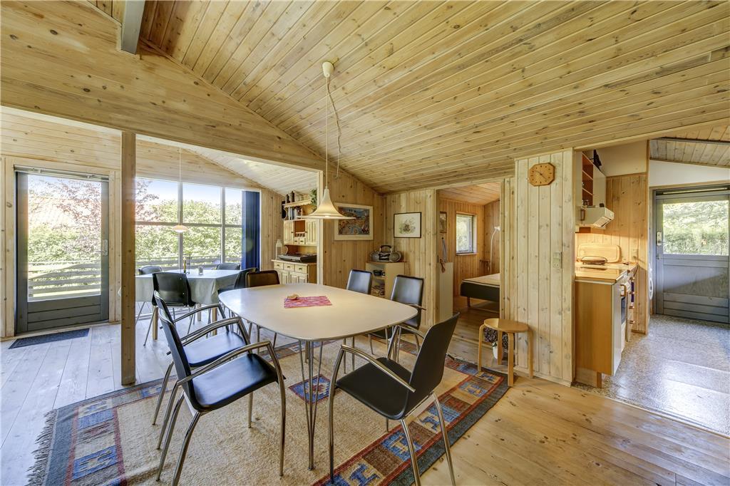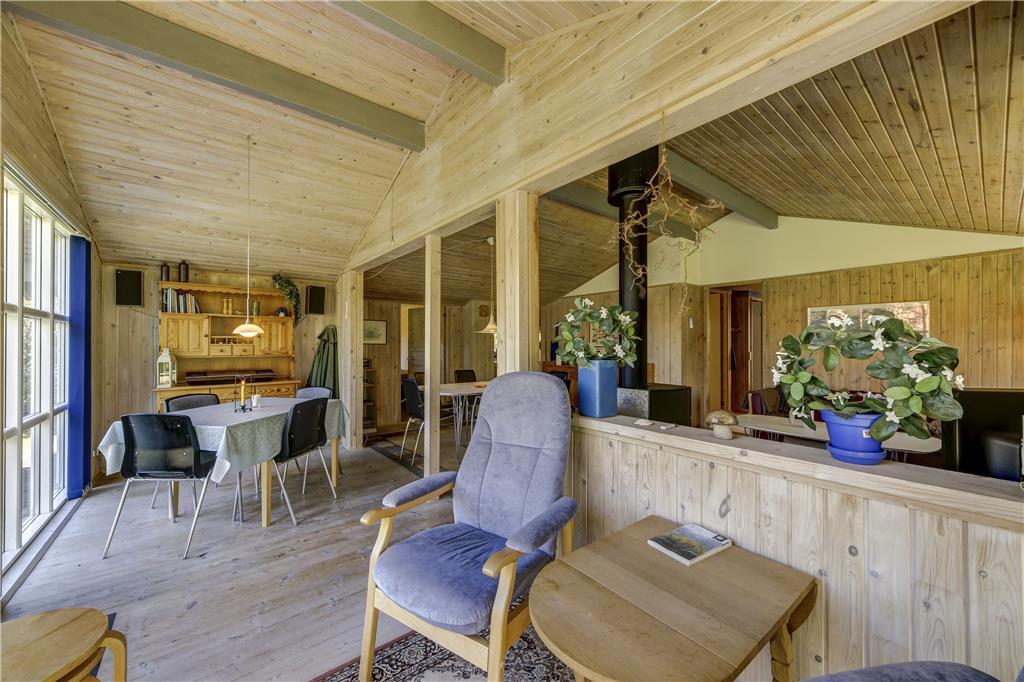 Når du træder indenfor, møder du en lys og åben atmosfære, hvor indretningen er enkel og rar at være i. Stuen samler jer naturligt omkring både samtaler og stille øjeblikke, og du kan læne dig tilbage, lytte til stilheden og lade ferien folde sig ud. Køkkenområdet ligger i god forbindelse med stuen, så hverdagen glider let, når morgenmaden finder vej til bordet, eller aftensmaden forberedes langsomt og uden hast. De store vinduer åbner rummet mod naturen udenfor, så du altid har fornemmelsen af at være tæt på lyset og den friske luft. Det er et hjem at trække vejret i, hvor du mærker roen komme helt af sig selv.