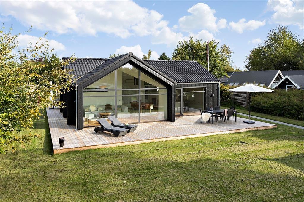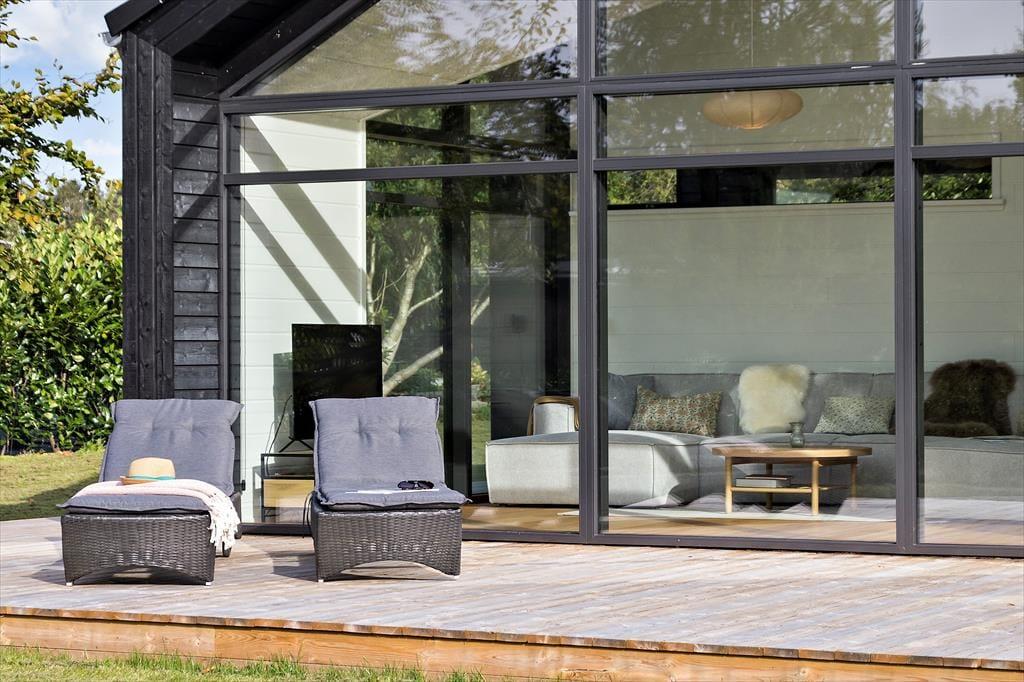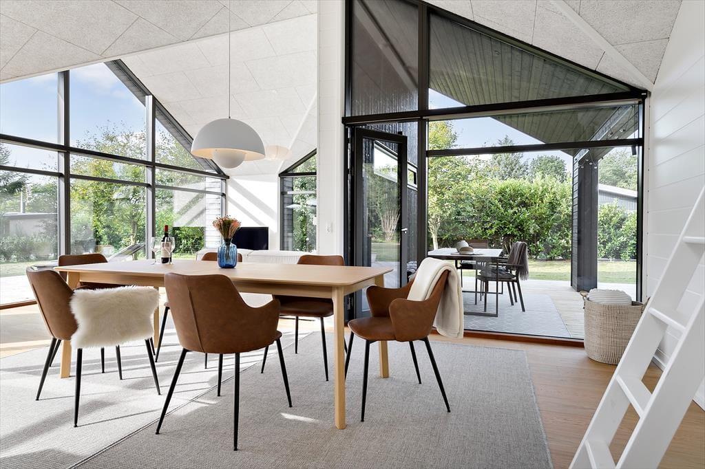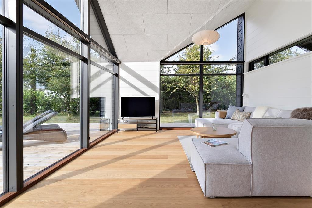 Husets åbne rum og store vinduer gør det til et særligt moderne og samtidig hyggeligt sommerhus at nyde ferien i sammen med familie og venner.