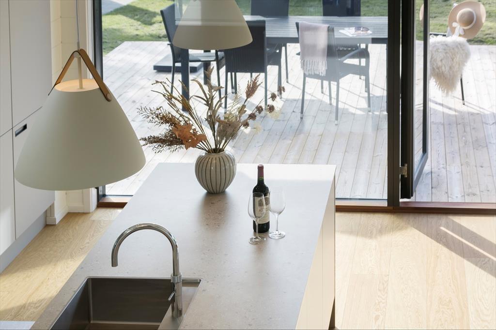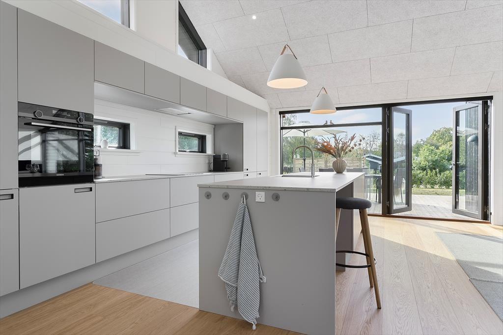 Køkkenet er i et enkelt og stilrent design, hvor der er højt til loftet og ikke mindst masser af skabs- og bordplads. Her er alle de nødvendige faciliteter til rådighed i køkkenet, bl.a. opvaskemaskine, køleskab med frys og ovn. En køkken-ø gør det muligt at stå i køkkenet og samtidig være med i samtalerne ved spisebordet, eller man kan sætte sig på køkken-øens barstol og hjælpe med at snitte grøntsagerne.
