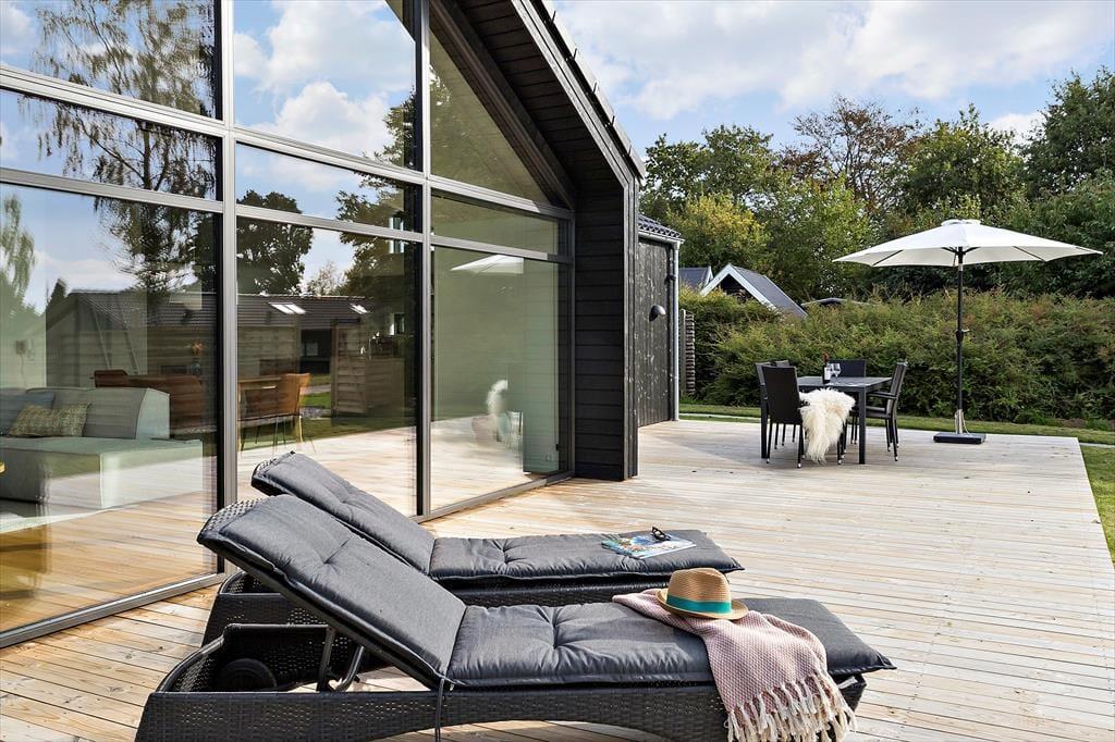 Sommerhuset ligger i et roligt sommerhusområde, men er omkranset af hæk, træer og stakit, så man kan være ugeneret i haven og nyde roen på terrassen. I haven er en stor græsplæne, så den er åben og har plads til leg. Omkring huset er en forhøjet træterrasse, der giver gode muligheder for at tage sine måltider og hyggen med udenfor. Den sydvendte terrasse er stor og åben med direkte udgang fra køkkenet, så når vejret tillader det, er det ideelt at tage sine måltider med ud og sætte sig i de gode havemøbler. Terrassen fortsætter rundt om huset, hvor der er en overdækket udgang fra køkkenet og mere læ, når der er brug for det. På denne terrasse er der også gode havemøbler samt en grill, hvor feriens måltider kan tilberedes.