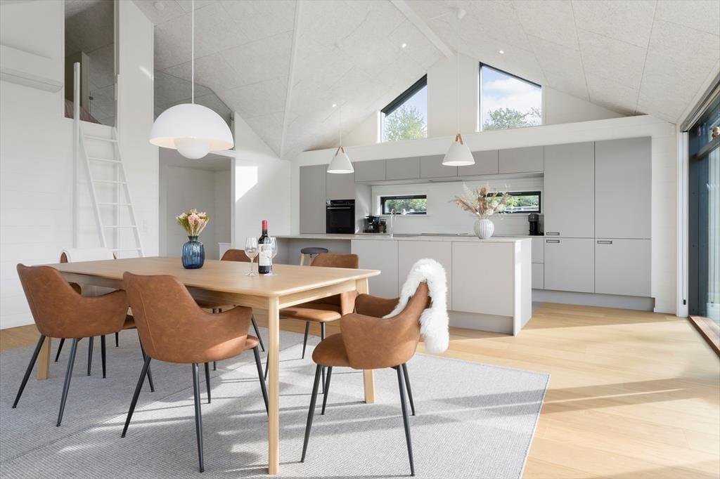 Spisebordet står centralt i rummet, og her er plads til, at alle husets 6 gæster kan samles. Ved siden af køkkenet og spisebordspladsen er store, sydvendte gulv til loft vinduer samt en havedør, hvor der er direkte udgang til den store træterrasse. På modsatte side af spisebordet er der også stort vindue og udgang til en dejlig overdækket terrasse mod nordvest. Ved siden af køkkenet og spisebordspladsen er der en stige op til en hyggelig hems, hvor der er to ekstra sengepladser.
