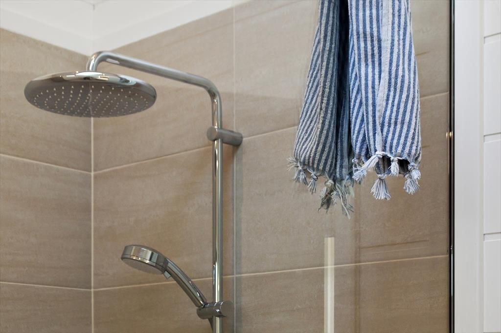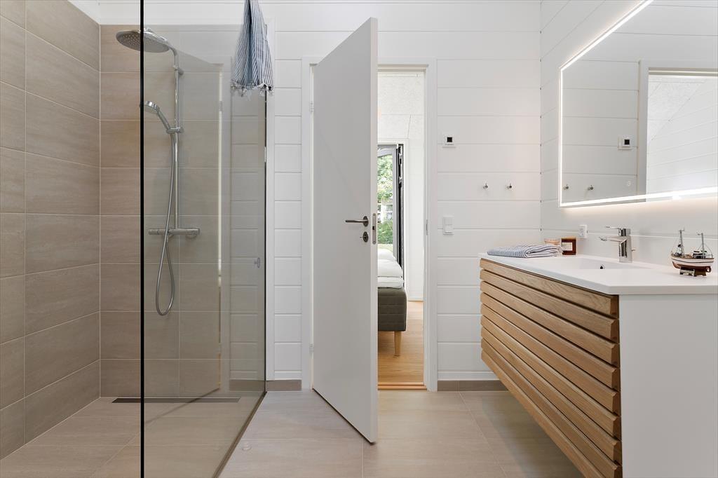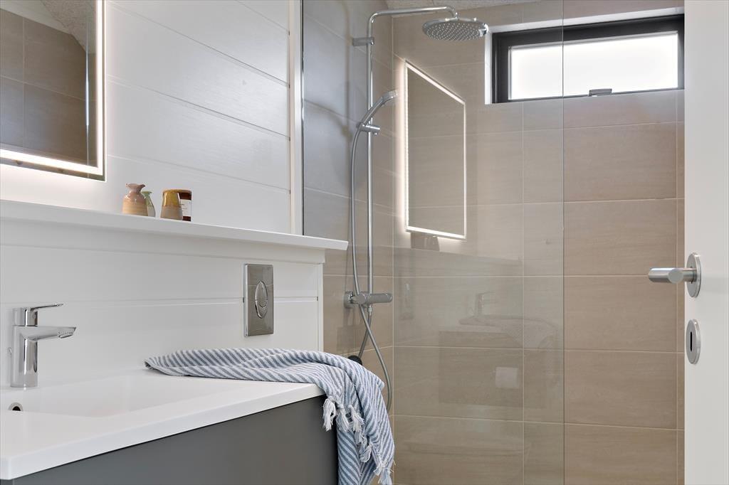 Et af soveværelserne har egen indgang til et badeværelse. Badeværelset har en god brusekabine, lyse vægge samt fliser og træelementer, der skaber en hyggelig sommerhusstil.