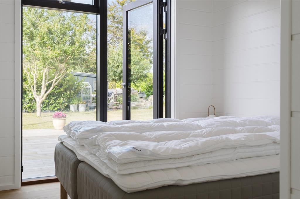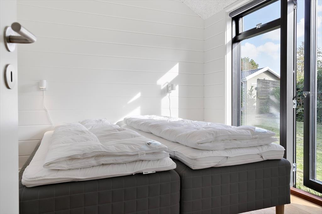 Soveværelserne er lyst indrettet med komfortable dobbeltsenge og skabsplads. På et af soveværelserne er der dog to enkeltmandssenge, som kan adskilles. Alle værelser har store gulv til loft vinduer og en havedør ud til den østvendte have eller vestvendte terrasse. De store vinduer, lyse vægge og det flotte træplankegulv er gennemgående i hele sommerhuset, hvilket gør det til et gennemført og dejligt hus at være i.