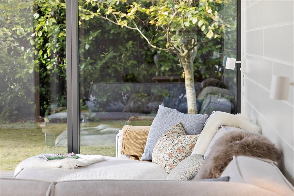 De store vinduer og udsigten til den grønne have fortsætter ind i stuen, hvor vinduer fra gulv og helt op i kip giver et fantastisk lys ind i det hyggelige sofahjørne. I den bløde sofa er det oplagt at slappe af med en bog, nyde udsigten til haven eller tænde for TV´et, hvor der bl.a. er danske og tyske kanaler samt en Chromecast, hvor man kan se sit eget indhold via WiFi og sin mobiltelefon eller tablet.