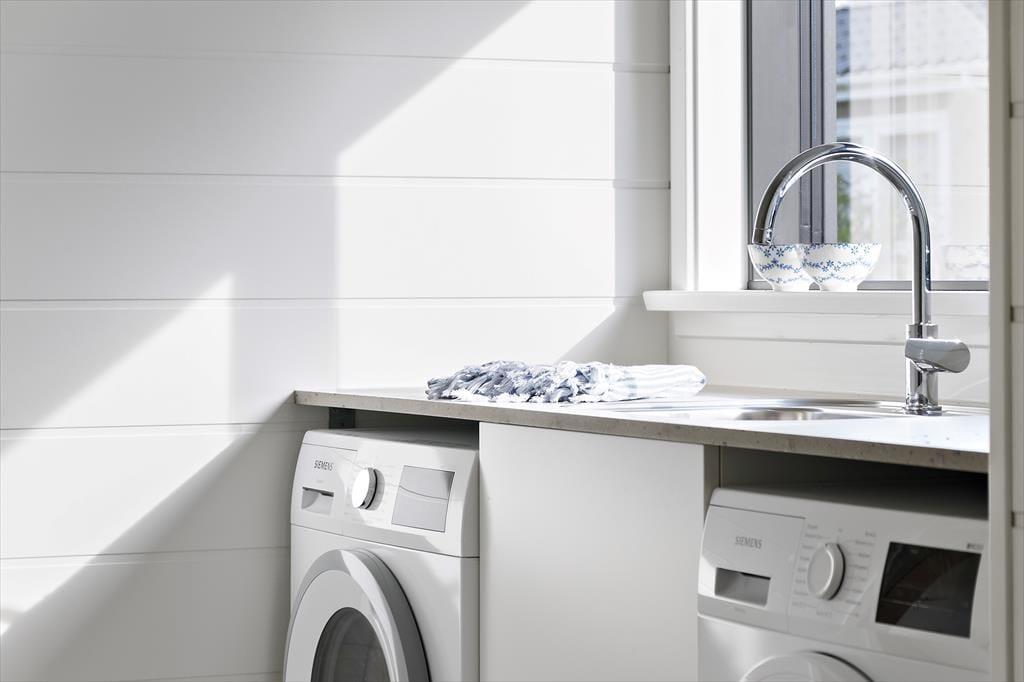 Sommerhuset er et nyt og meget indbydende hus, hvor der er tænkt over, at rummene er funktionelle og samtidig har plads til hyggeligt samvær. Sommerhusets entre er en god fordelingsgang, hvor der er plads til at komme ind med sin oppakning samt et praktisk hjørne med håndvask, vaskemaskine og tørretumbler.