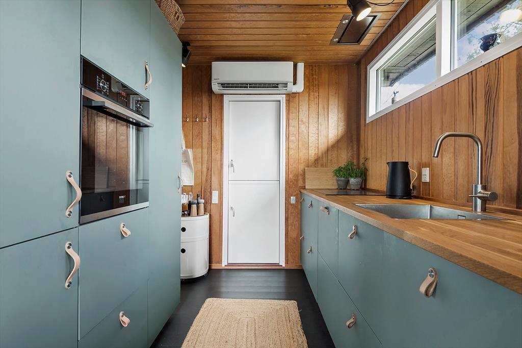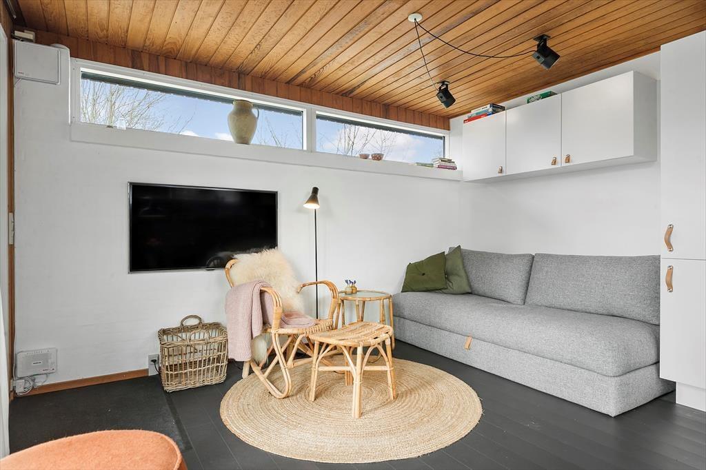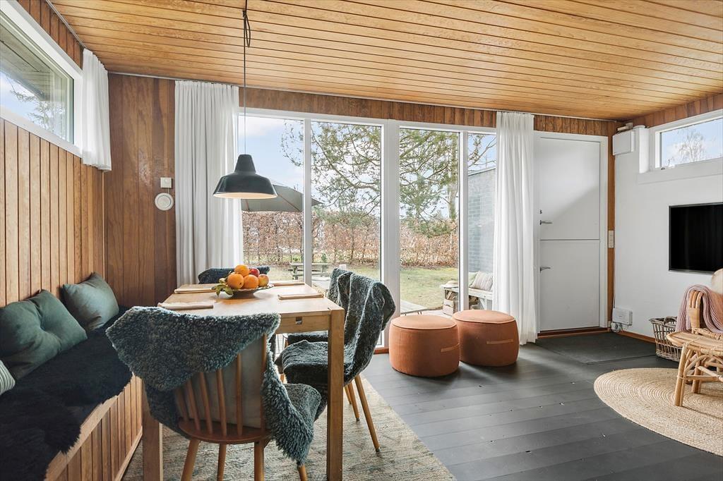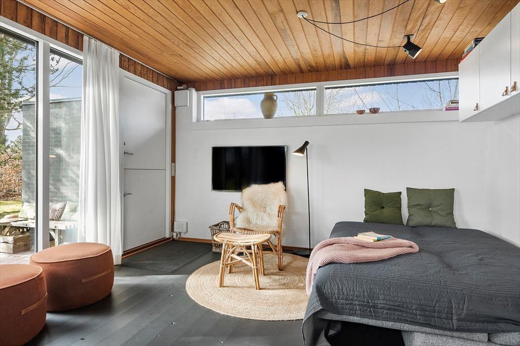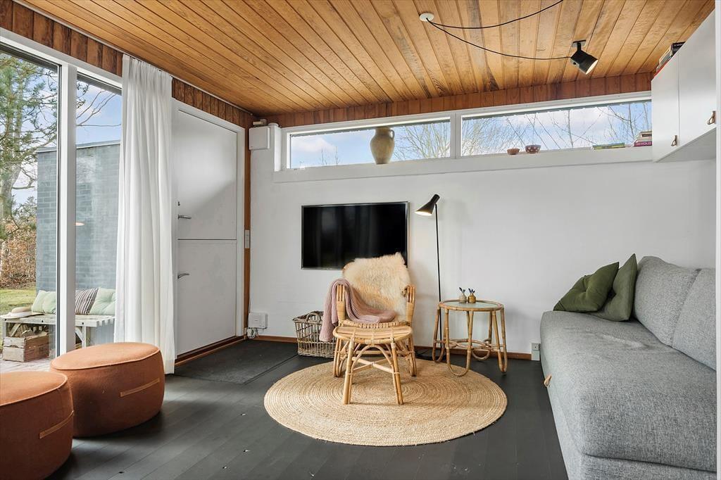 Når du træder ind i sommerhuset, mødes du af en enkel og indbydende indretning, hvor lyset strømmer ind gennem vinduerne og skaber en behagelig atmosfære. Her er plads til at trække sig tilbage og nyde roen – uanset om du læser en god bog, lytter til din yndlingsmusik eller bare nyder stilheden.