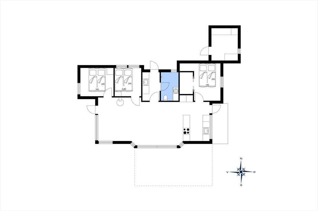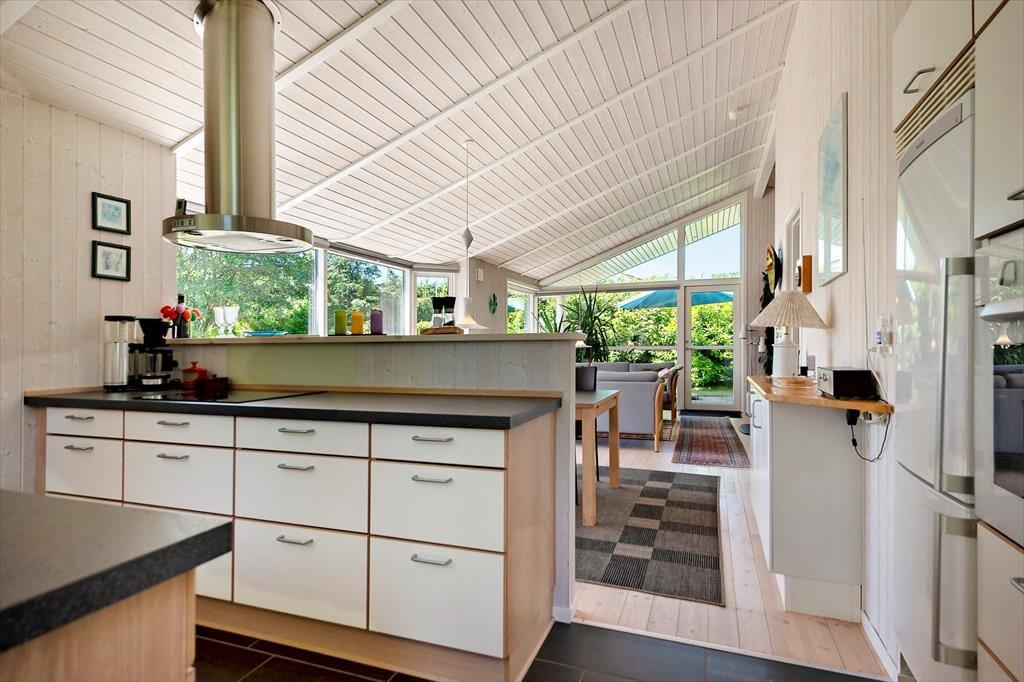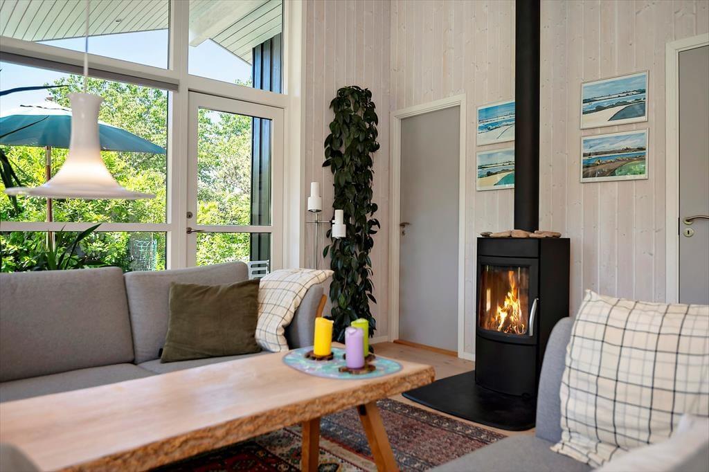 Indenfor venter en lys og indbydende atmosfære, der kalder på afslapning og hyggeligt samvær. Det åbne opholdsrum er sommerhusets hjerte – et sted, hvor dagen begynder med duften af friskbrygget kaffe og morgenmad ved langbordet, mens solen titter ind gennem vinduerne. Her samles I om måltiderne, lægger puslespil på bordet, læser højt fra en bog eller falder hen i samtaler, der får lov til at vare lidt længere end derhjemme. Sofaen byder sig til, når I vender hjem efter en dag ved stranden, og køkkenet er en naturlig del af rummet – ikke bare til madlavning, men som en del af selve ferielivet. Alt er gennemført uden at være prangende, og stemningen er præget af nærhed, varme og den ro, der kun findes i et ægte sommerhus.