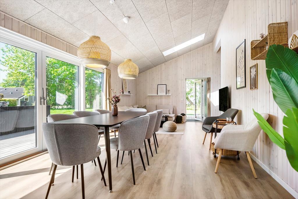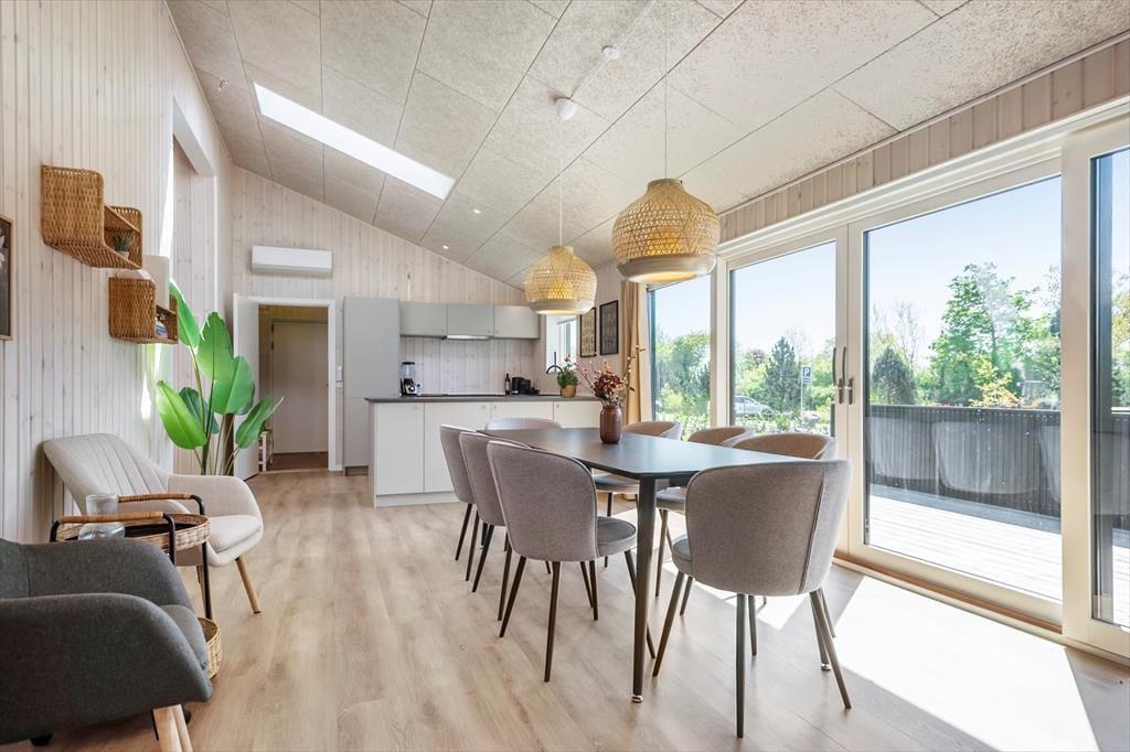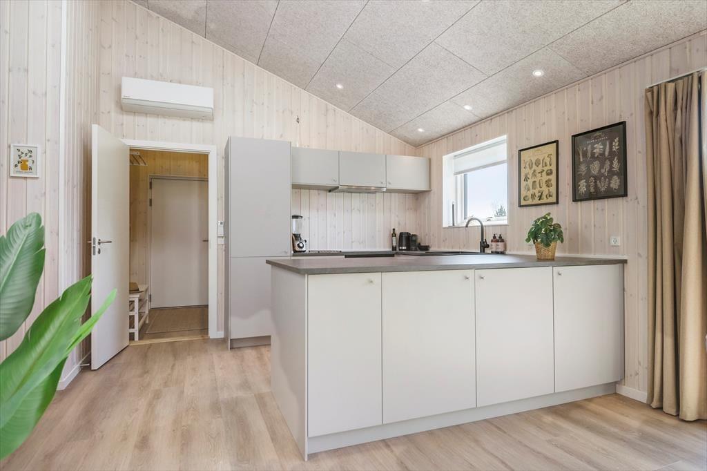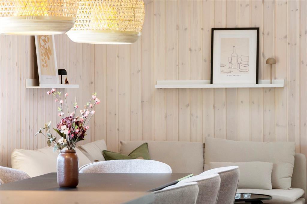 Du træder ind i et lyst og stilfuldt feriehus, hvor alting er gennemtænkt til mindste detalje. Hjertet i huset er det store, åbne opholdsrum med køkken og stue i ét – et naturligt samlingspunkt for hyggelige stunder med madlavning, brætspil eller et glas vin foran brændeovnen. Det moderne køkken er fuldt udstyret og perfekt til både nem ferie-mad og større middage med lokale råvarer. Overalt mødes du af et lækkert materialevalg, bløde farver og en atmosfære, der indbyder til ro og nærvær.