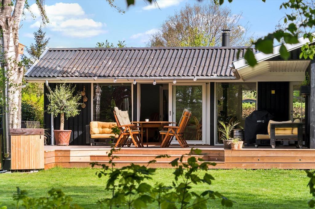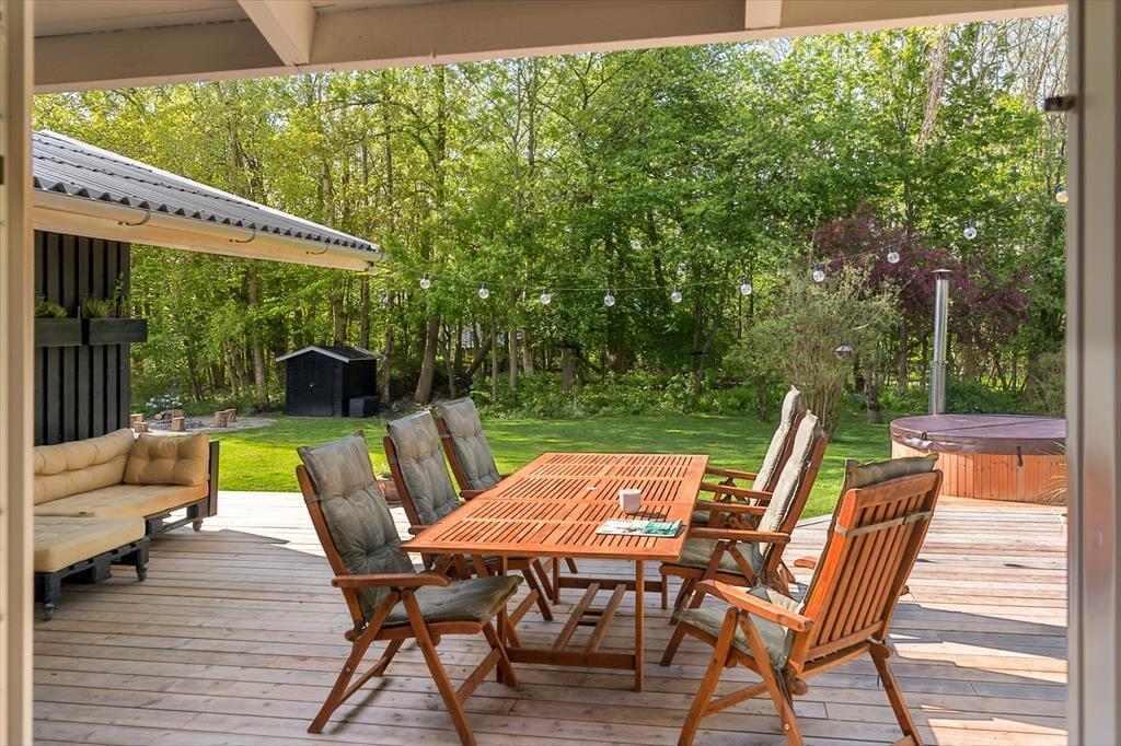 Udenfor venter den store, lækre træterrasse, der næsten giver en gårdhave-fornemmelse. Her kan I nyde det dejlige vildmarksbad og lade jer synke ned i ren afslapning. Børnene vil elske det eventyrlige legestativet og sandkassen, hvor de kan lege og udforske.
