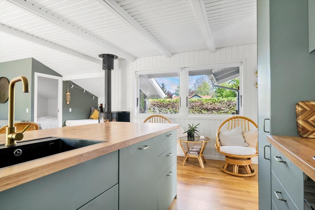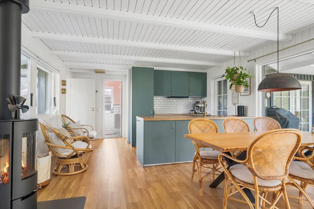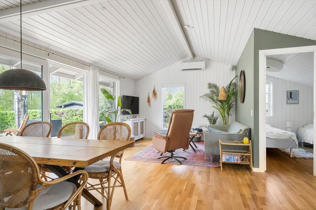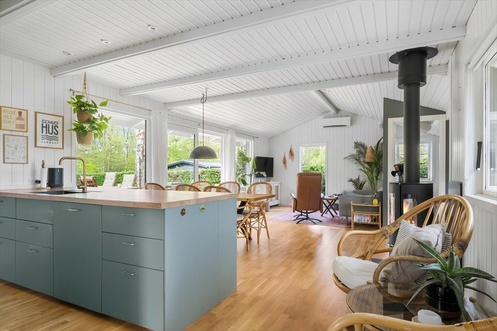 Velkommen til denne perfekte ferieoase! Når du træder ind i dette skønne sommerhus, bliver du mødt af et lyst og lækkert rum, hvor moderne ny nordisk indretning med et sommertwist skaber den perfekte sommeratmosfære. Her er mange hyggelige kroge, hvor du kan slappe af, og en hyggelig brændeovn, der indbyder til varme stunder. Den dejlige alkove er perfekt til at tage en lur eller læse en god bog.