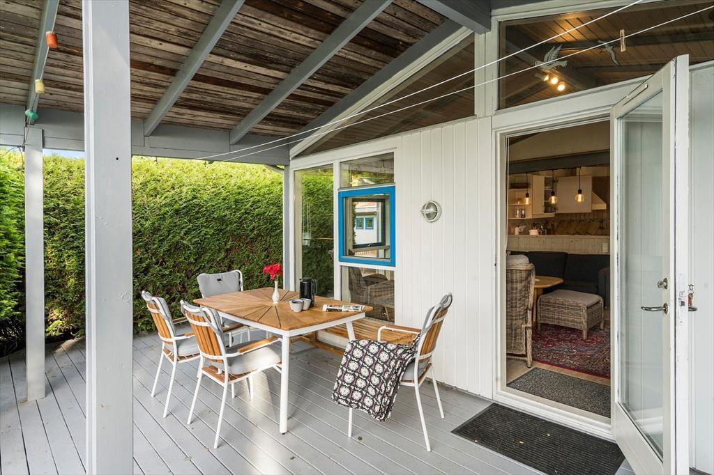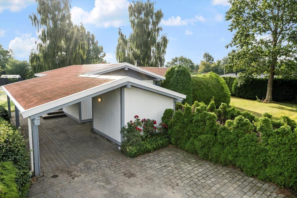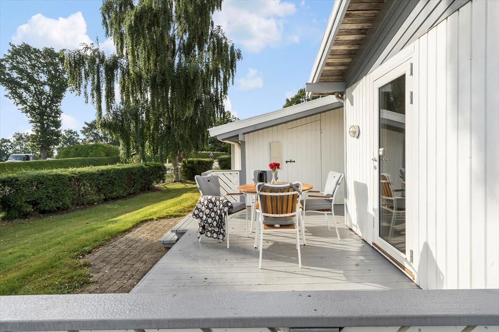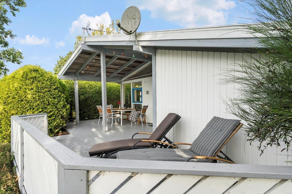Haven er solrig og med stort grønt areal. Her er fine buske og træer. Der er to træterrasser. En er åben og den anden er overdækket.