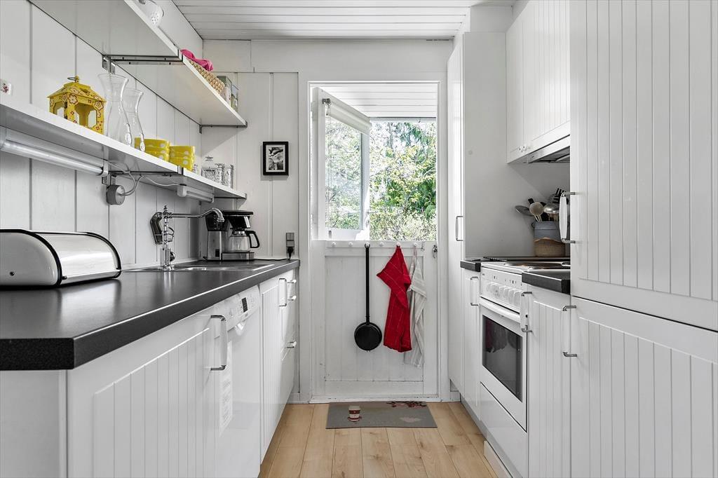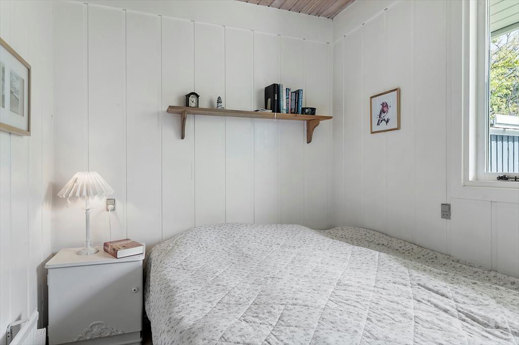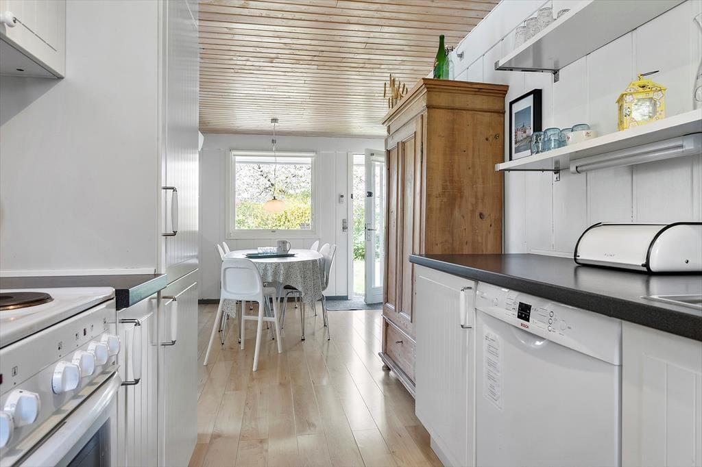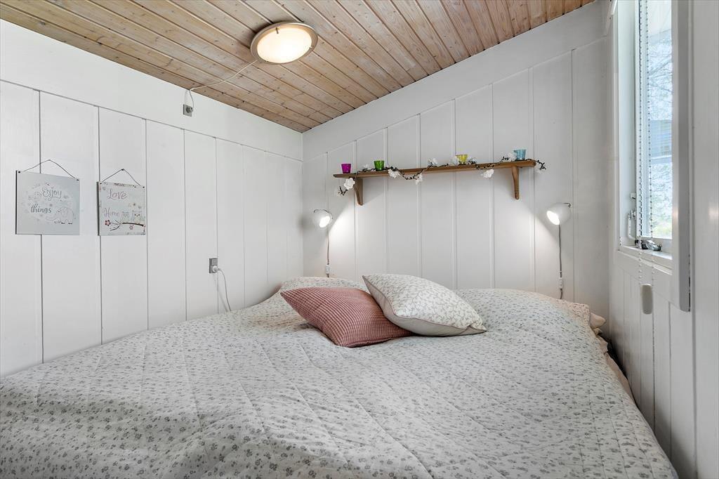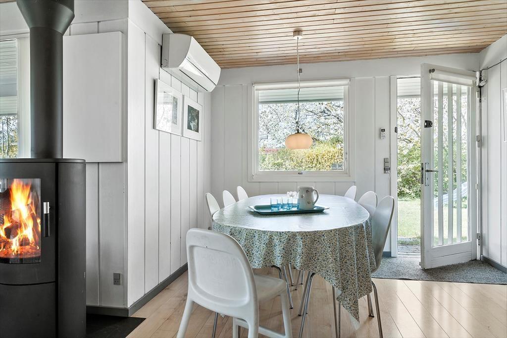 Sommerhuset er indrettet lyst og med romantisk stil. Her er et pænt nyere køkken. Med hvide elementer og mørk bordplade. Her er god plads. Køkkenet er med opvaskemaskine og er i åben forbindelse med stuen. I stuen er der brændeovn. Badeværelset er med vaskemaskine. Sommerhuset er bygget i 1975, men er delvis renoveret i 2010. Sommerhuset er småbørnsvenligt og egner sig godt til familier med børn. Her er tre gode soveværelser. Der er varmepumpe med køl i sommerhuset.