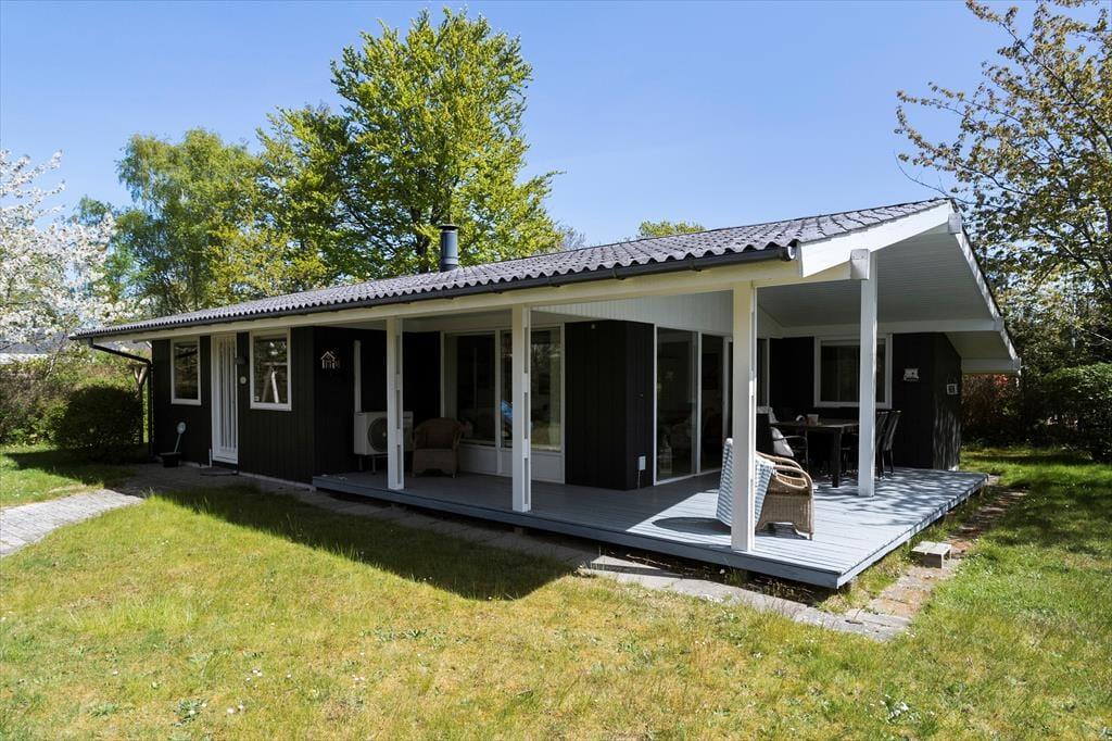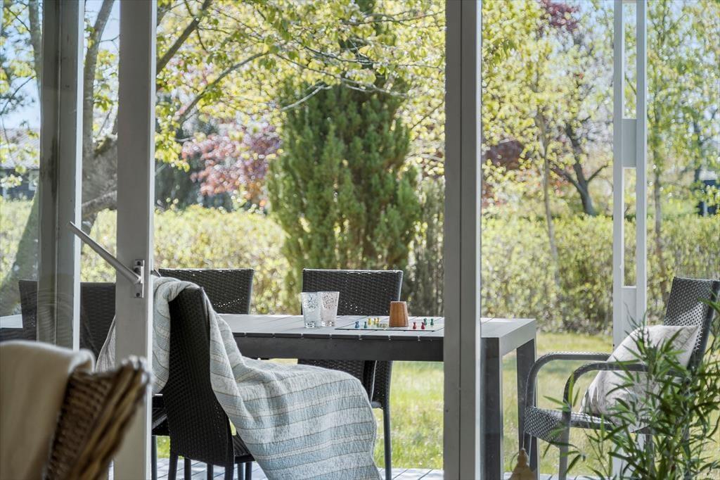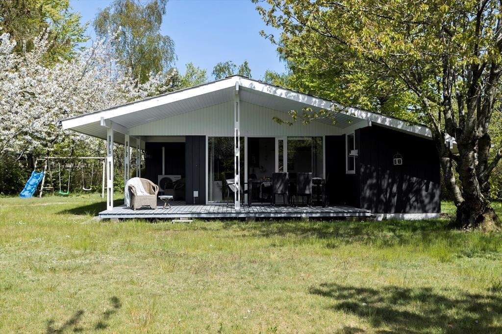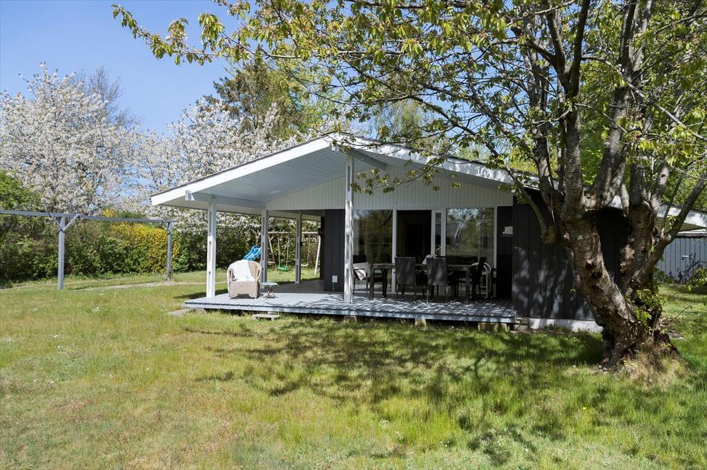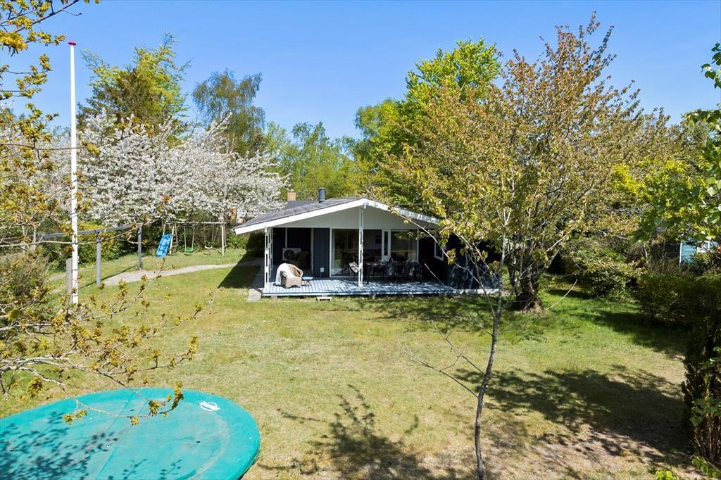 Sommerhuset er beliggende på en dejlig naturgrund, hvor man er helt sig selv. Den store træterrasse indbyder til hygge og samvær. Der er gode havemøbler og parasol. I haven finder man også gynger til de mindste.