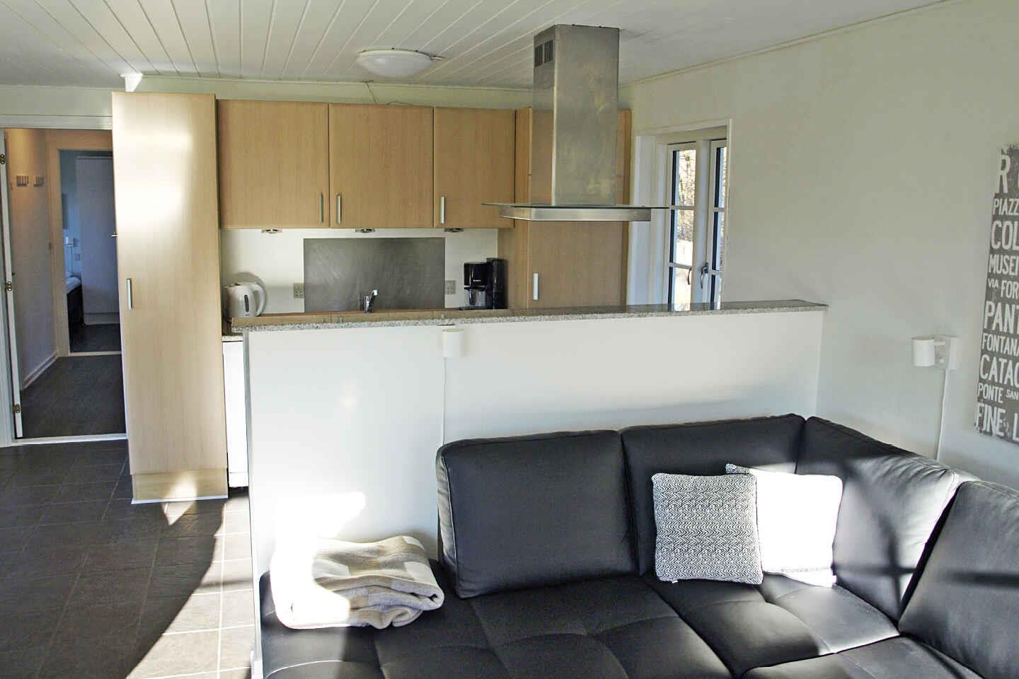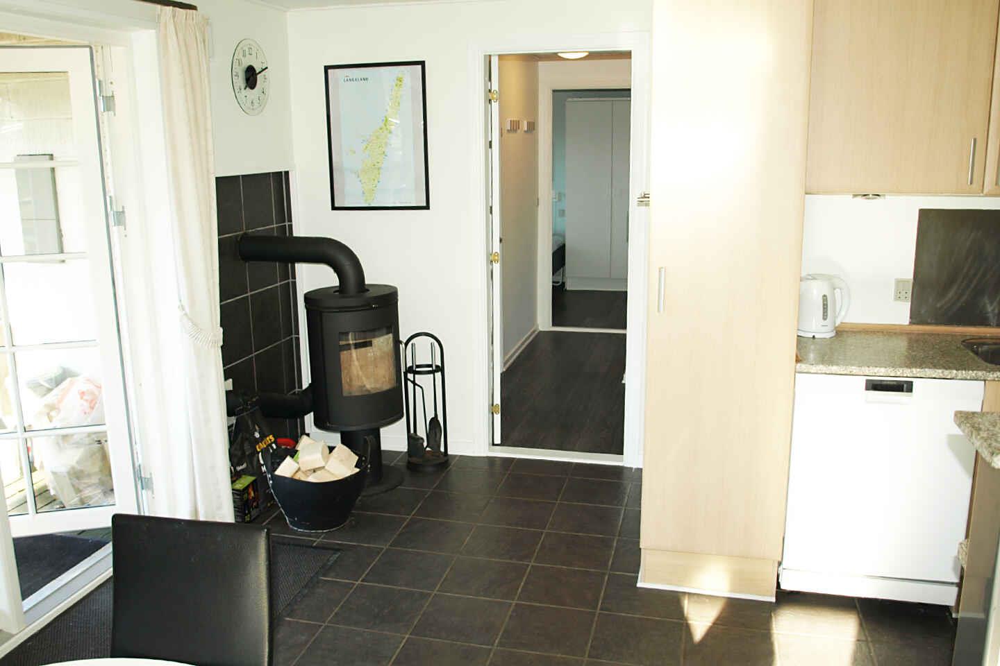 dejligt velindrettet hus, 400 til vandet, køkken i forbindelse med stuen, brændeovn, internet