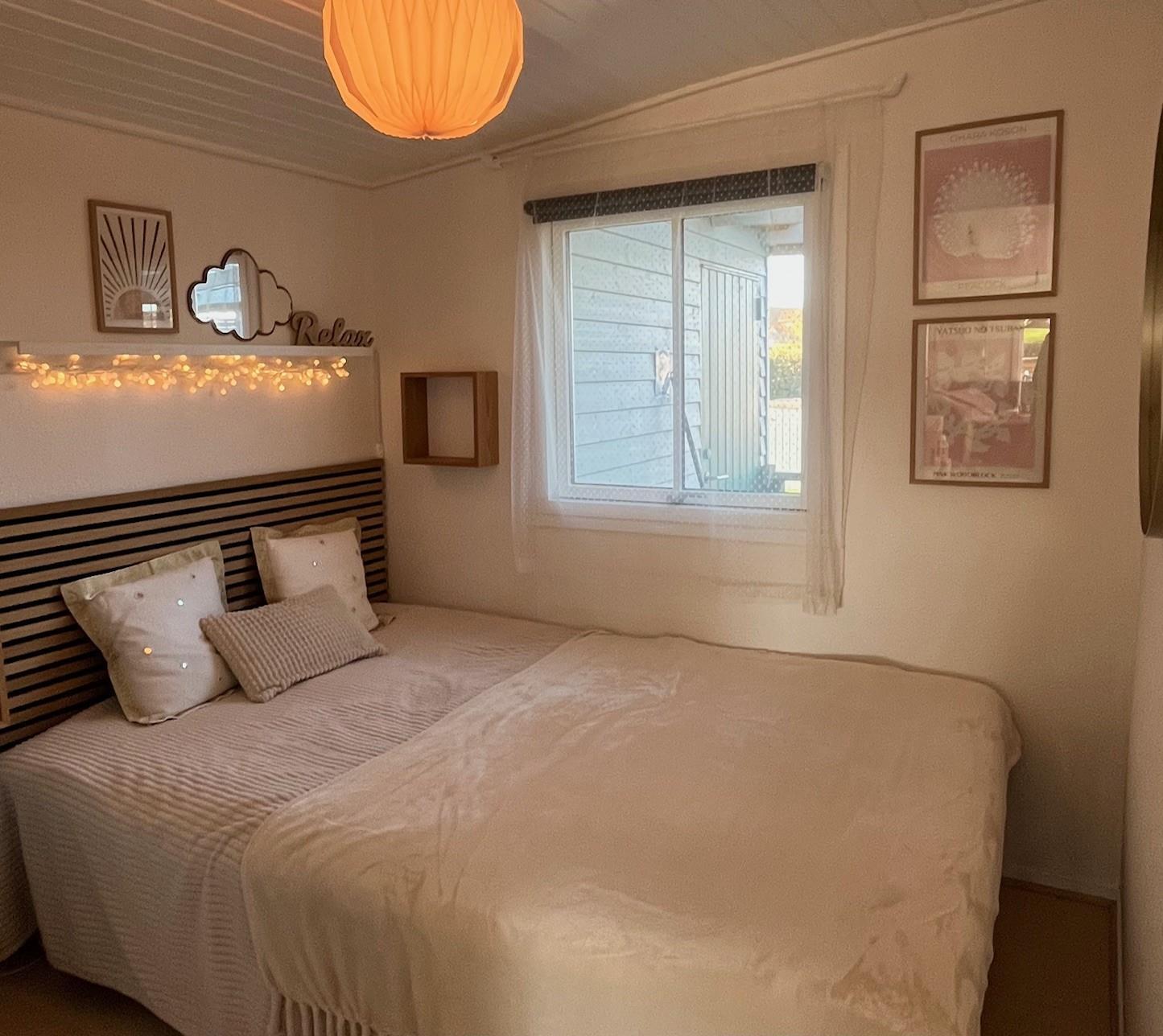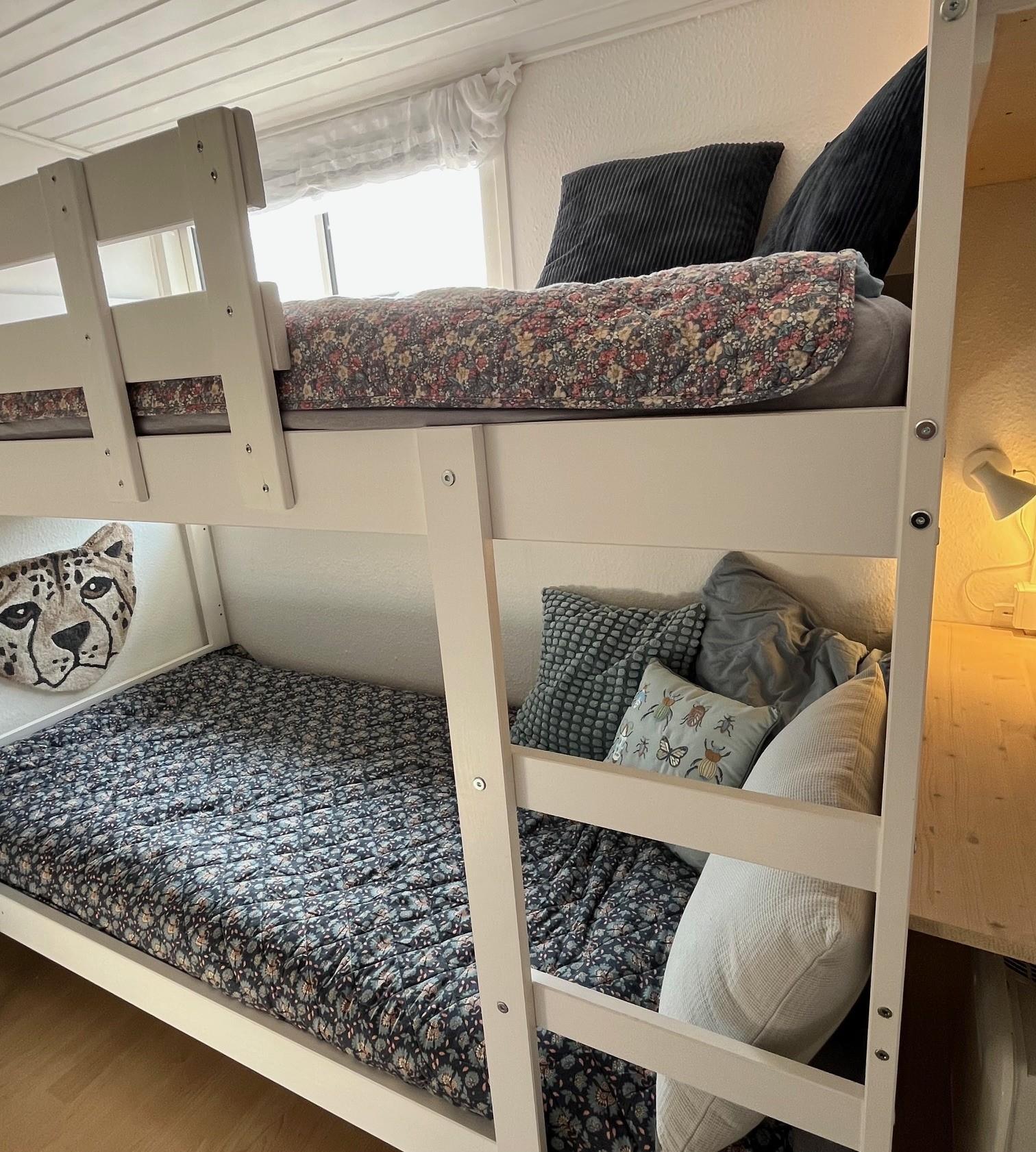 Soveværelset er indrettet med en 140 cm bred seng. I ekstra værelset er der en ny køjeseng med to sengepladser på 90x200. Der er et klædeskab til tøj i begge værelser.