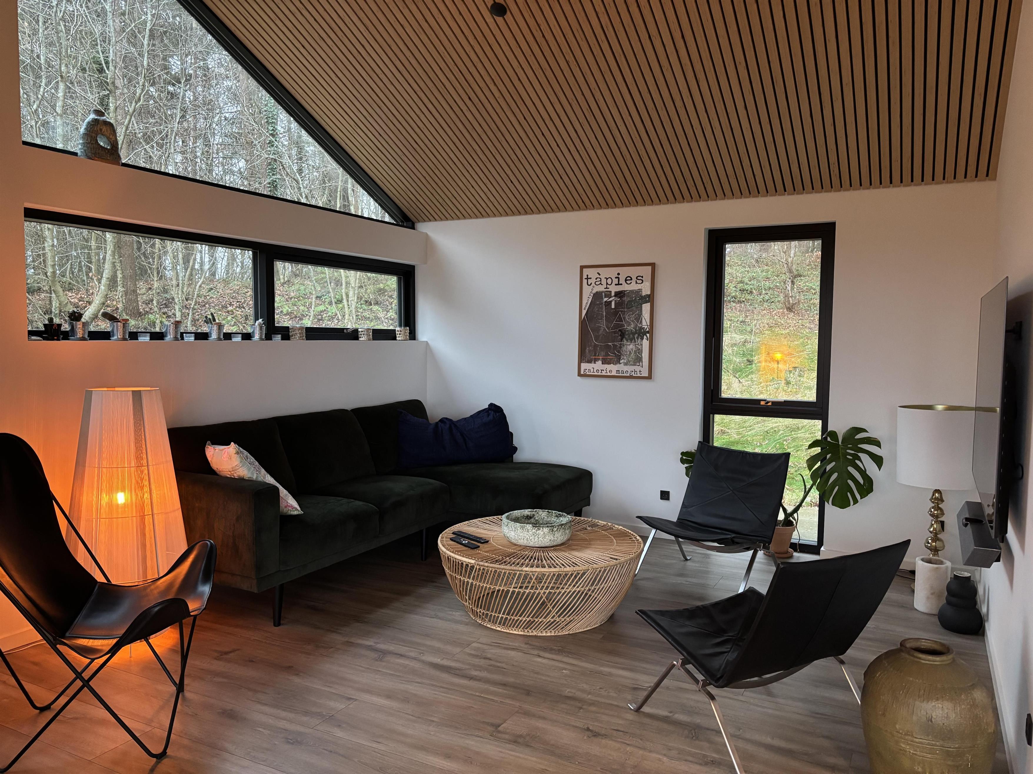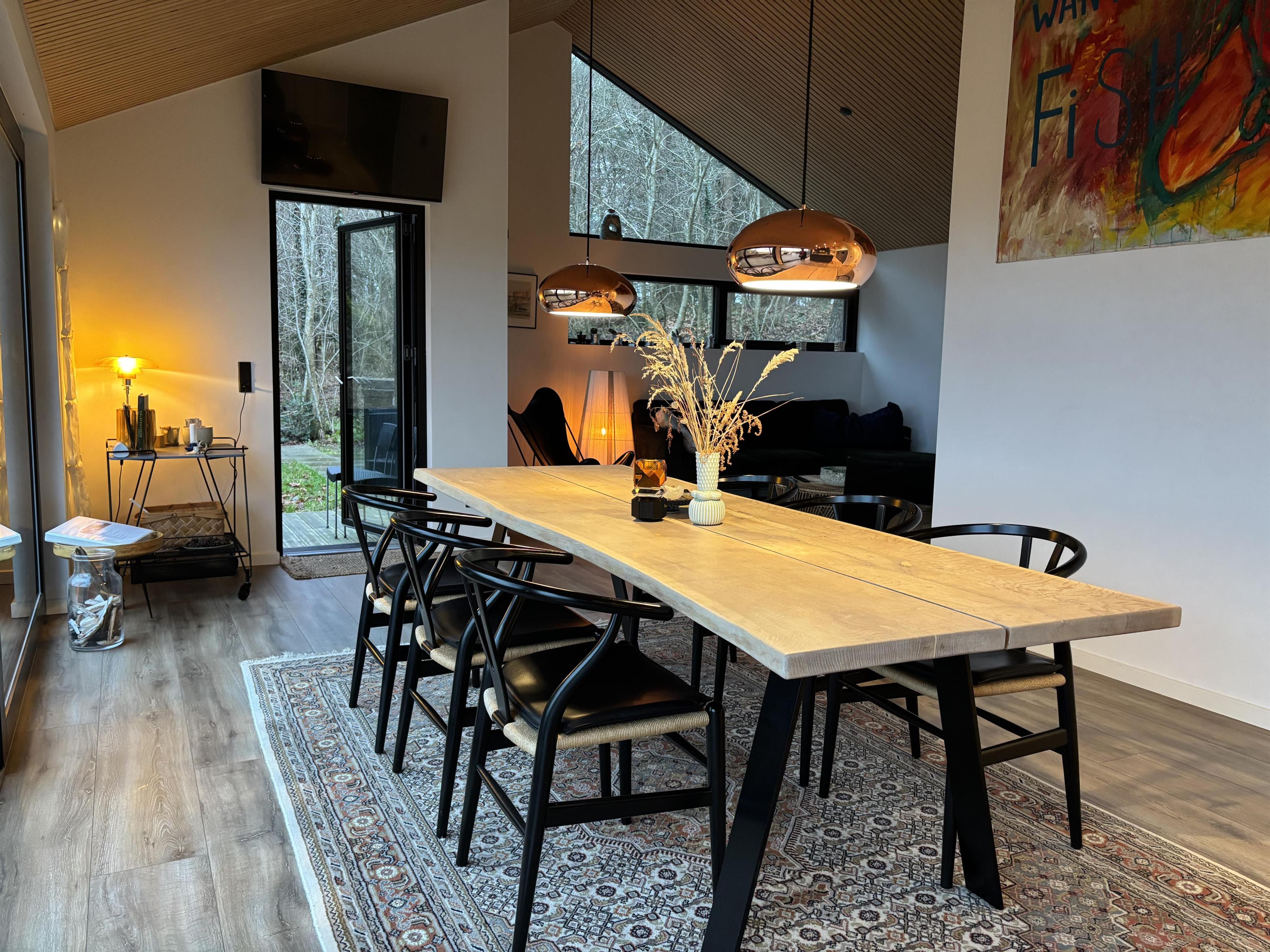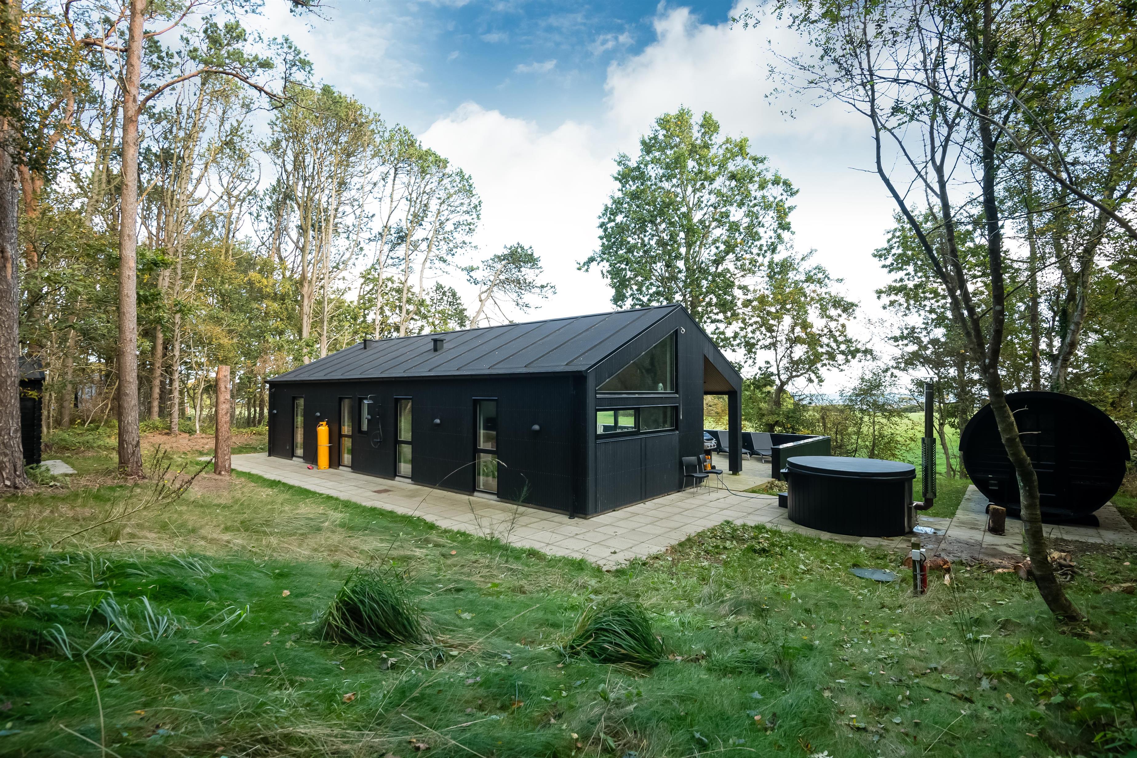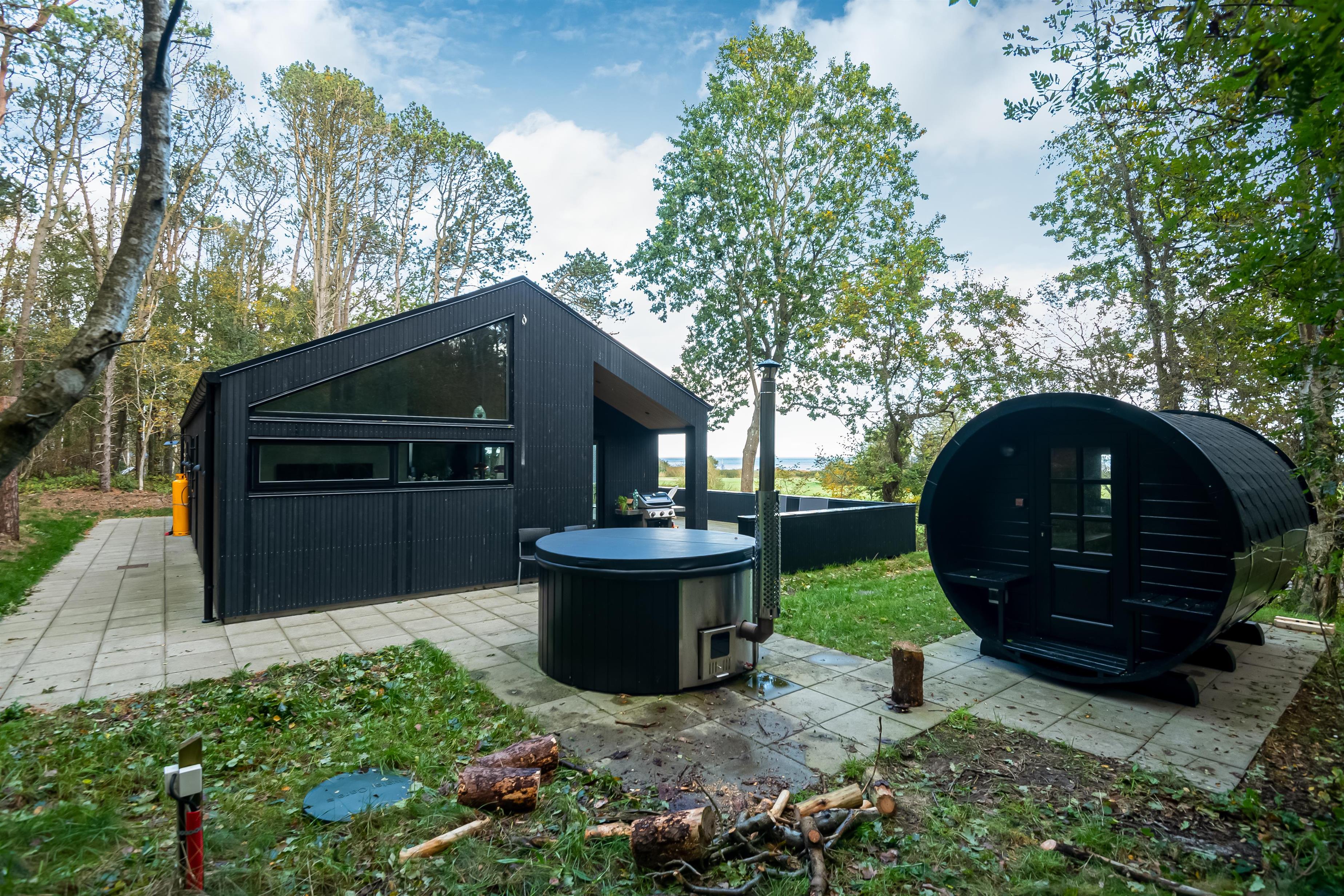 Udendørs er der fokus på ren afslapning. Nyd et varmt bad i vildmarksbadet, eller lad varmen fra saunaen omfavne jer, mens I nyder udsigten til naturen. Terrassen er ideel til måltider under åben himmel og lange, lyse sommeraftener.