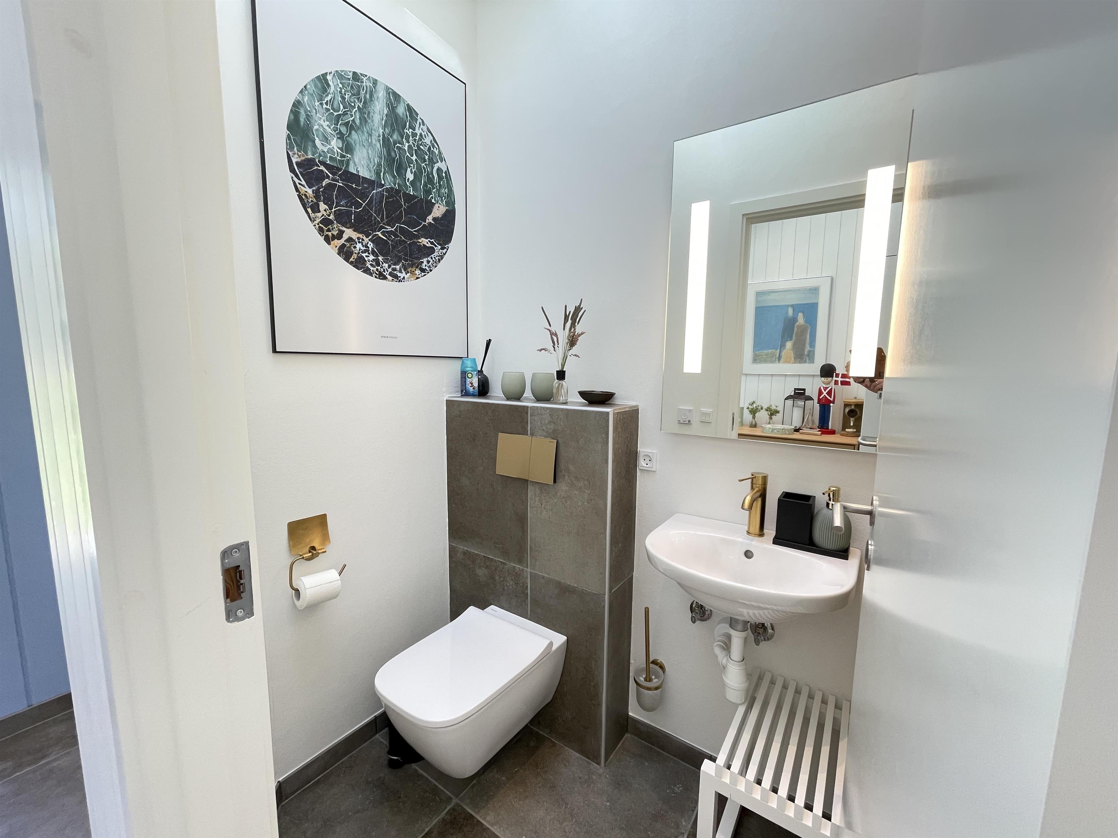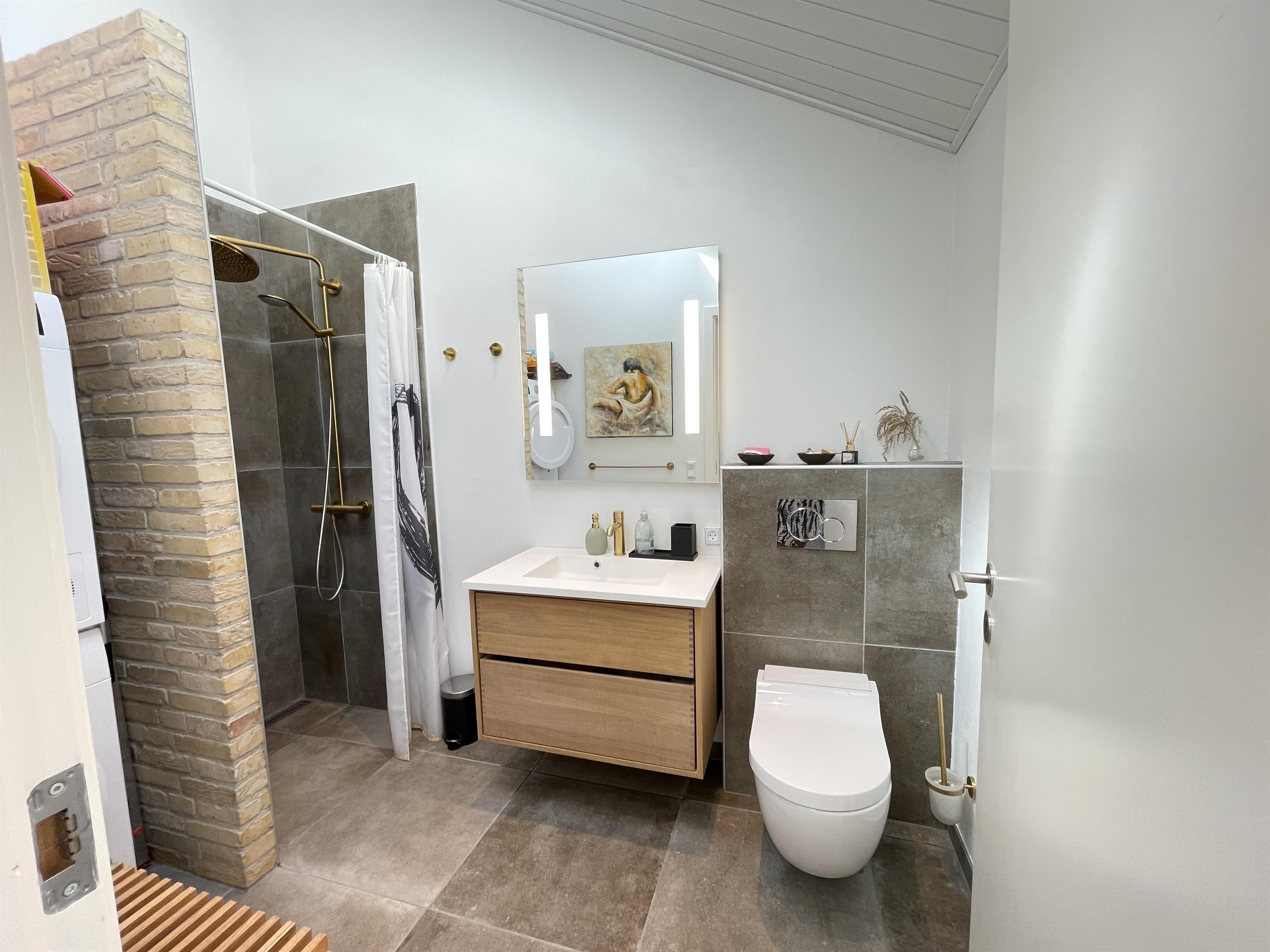 Husets to badeværelser emmer af kvalitet med flotte klinker, store bruserum, luksus brusere i loft, håndbrusere, samt væghængte toiletter. Det ene er endda selvrensende.