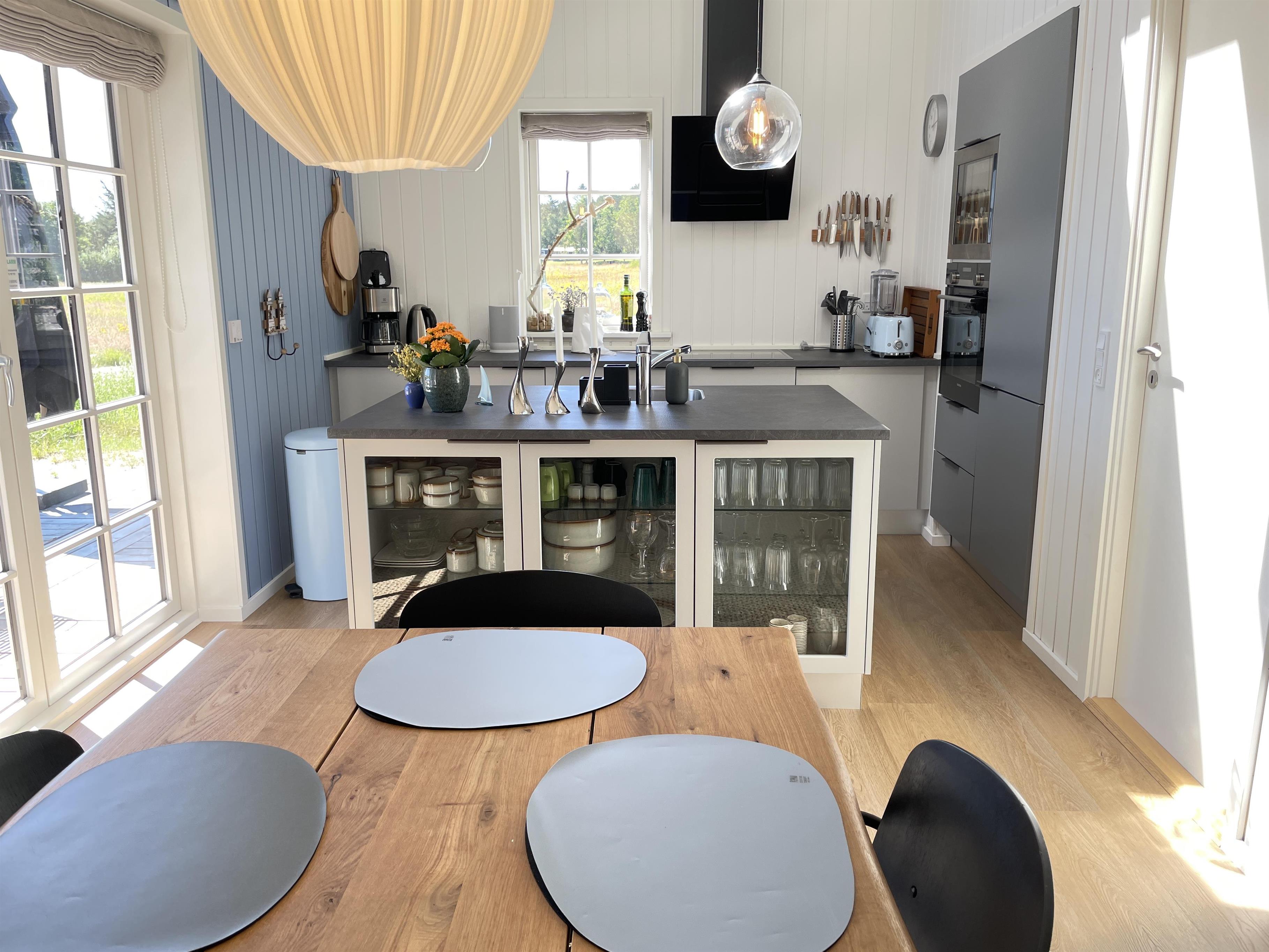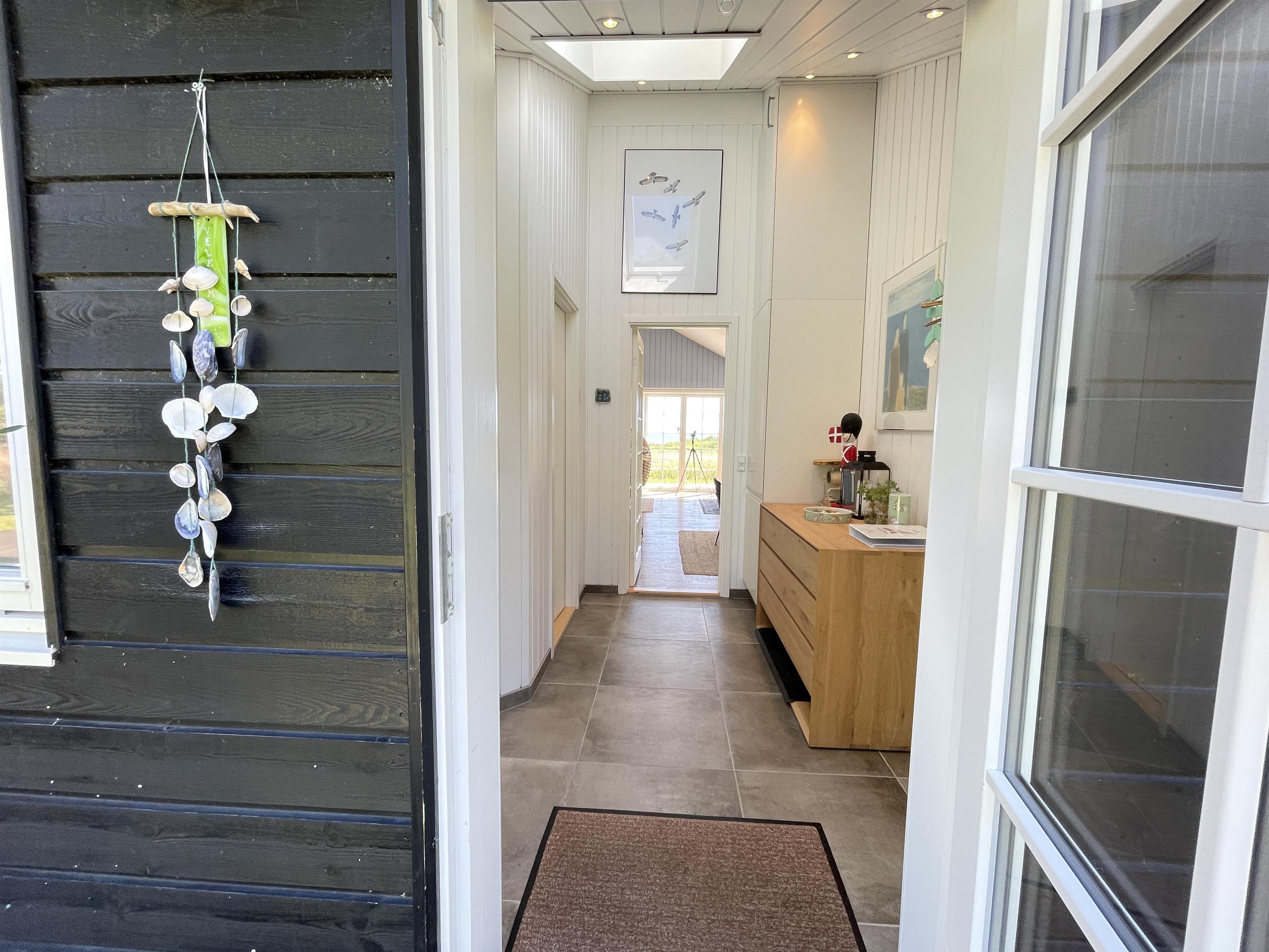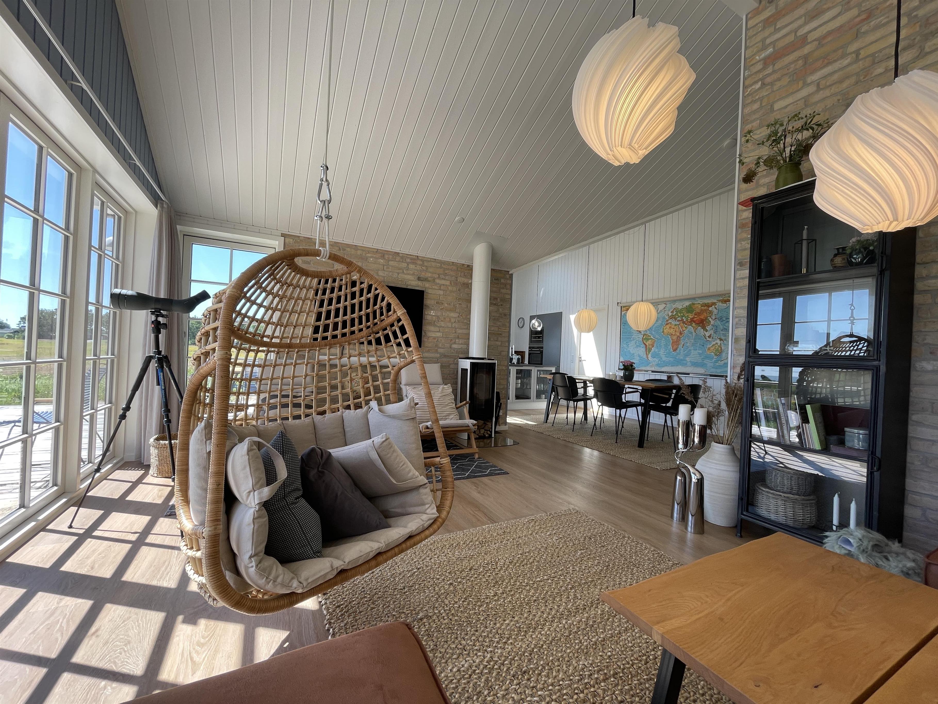 Ved ankomsten træder du ind i det store alrum, hvor køkkenet, spiseplads og stue går i et, og dermed giver husets gæster et rummeligt fællesrum. Store vinduespartier åbner op for den spektakulære udsigt til smukke Kattegat, og et stort lysindfald oplyser stuens eksklusive og rustikke indretning. Den store luksuriøse sofa inviterer til skønne stunder sammen med en brændeovn, der knitrer og varmer i baggrunden.