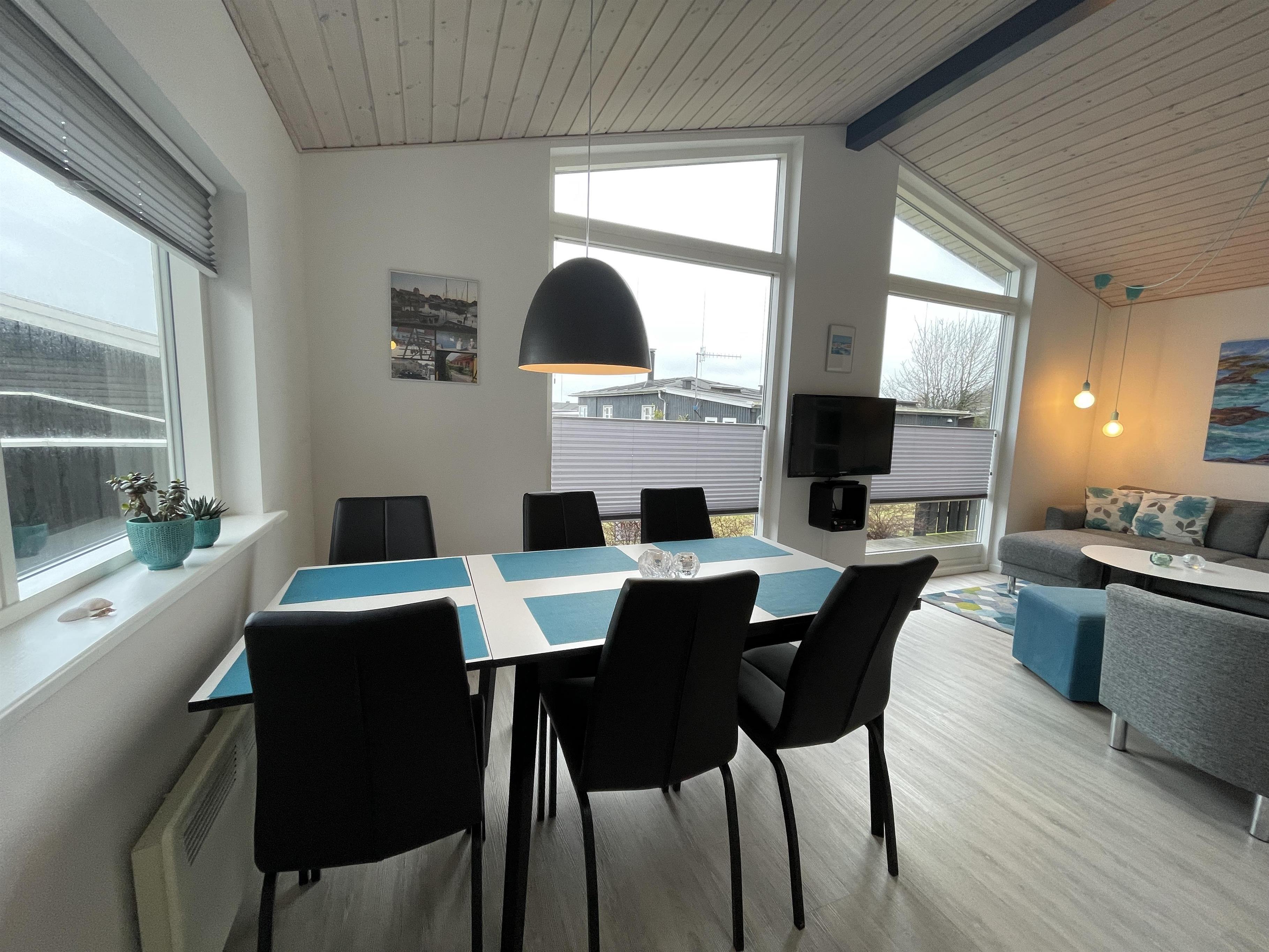 Når du træder ind i huset, bliver du straks mødt af et smagfuldt indrettet køkken/alrum, der byder på både en hyggelig spiseplads ved køkkenbordet og et elegant, separat spisebord. Det åbne rum prydes af store vinduer, der lader lyset strømme ind og giver en fantastisk udsigt over Kattegat, hvilket skaber en lys og indbydende atmosfære.