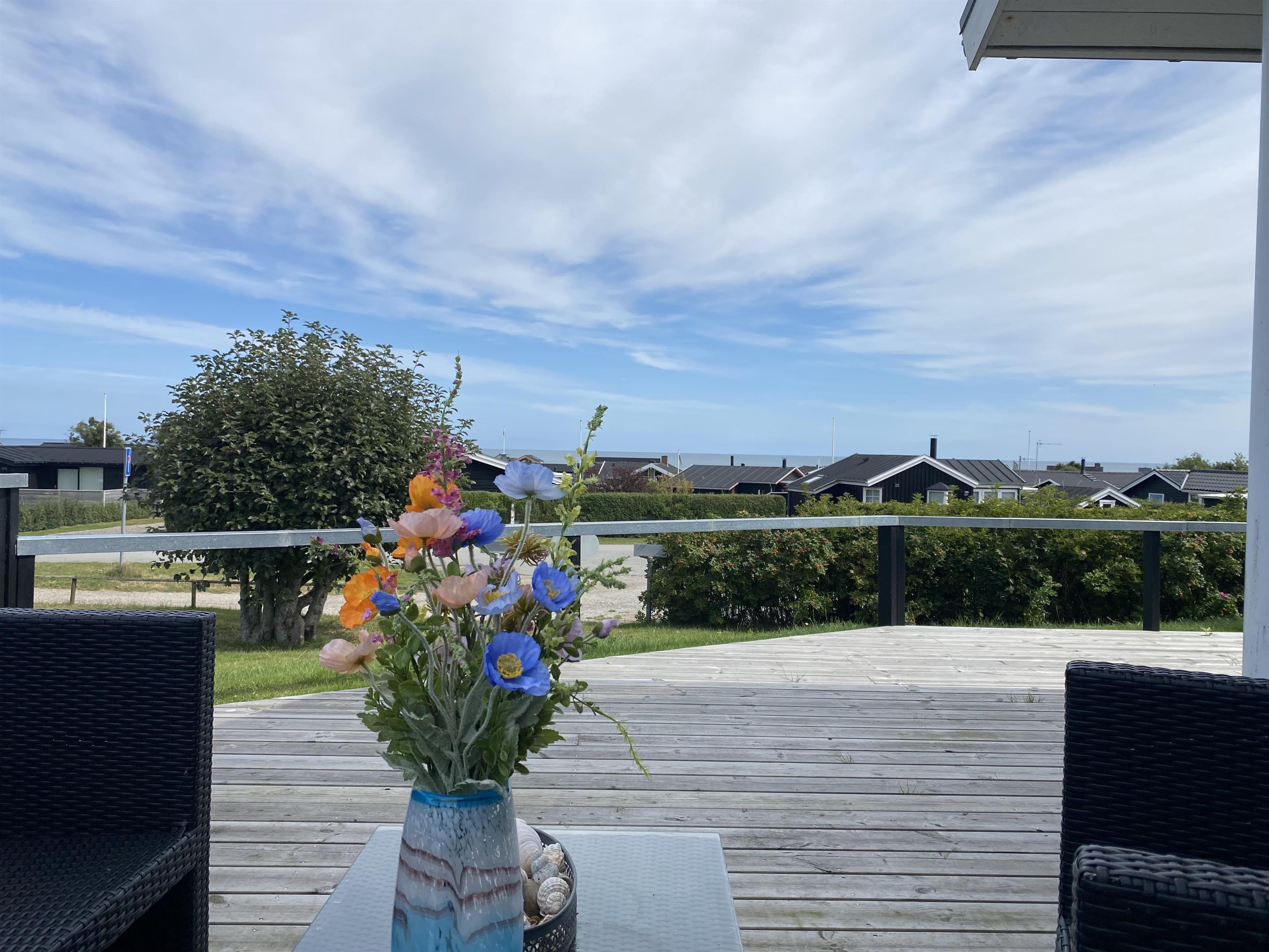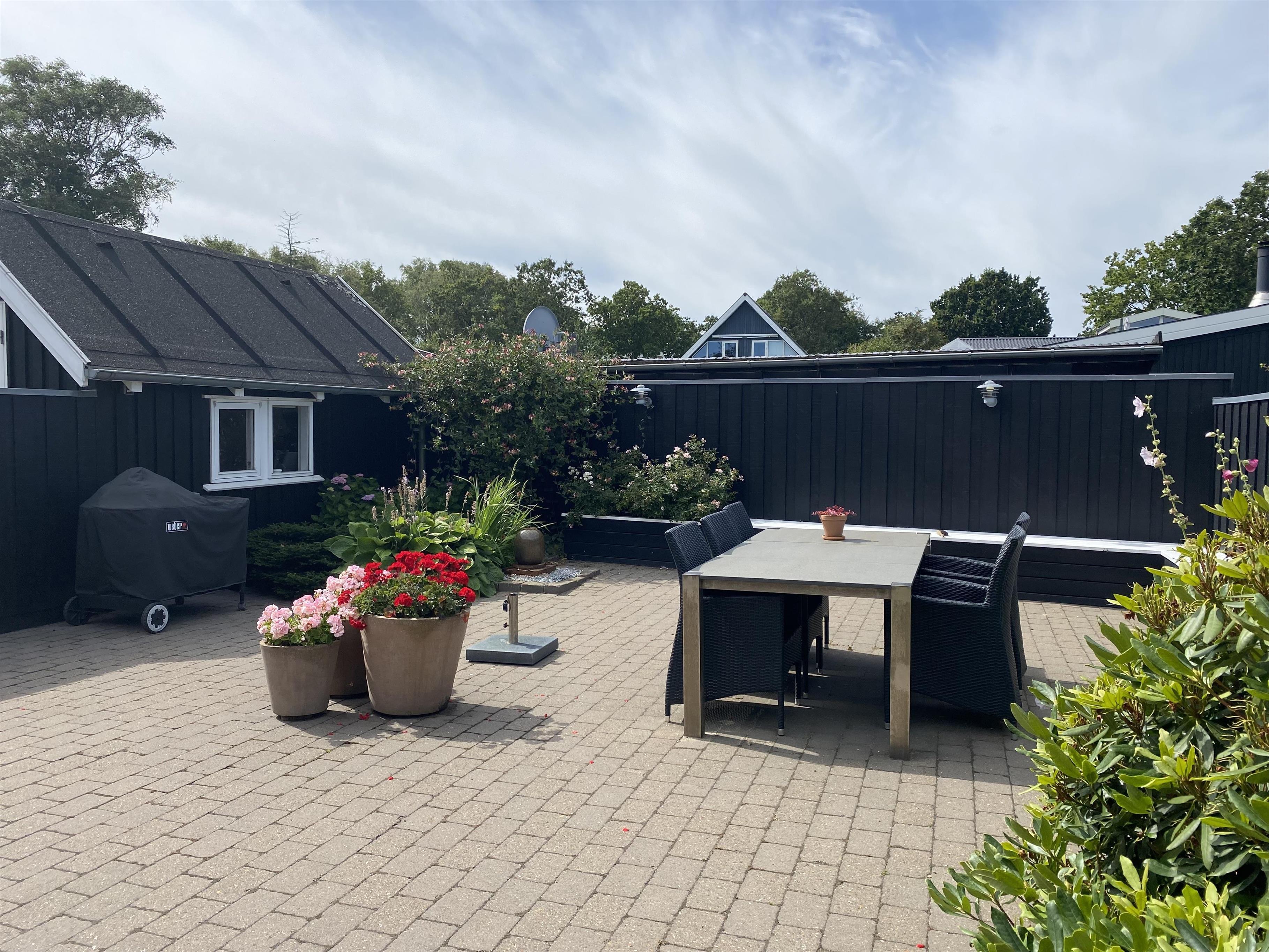 Udenfor byder huset på en stor, hyggelig lukket gårdhave og en træterrasse på siden af huset, der fortsætter ud i en bred svalegang foran huset. Dette giver masser af muligheder for at nyde solen, grille eller bare slappe af i den friske luft.