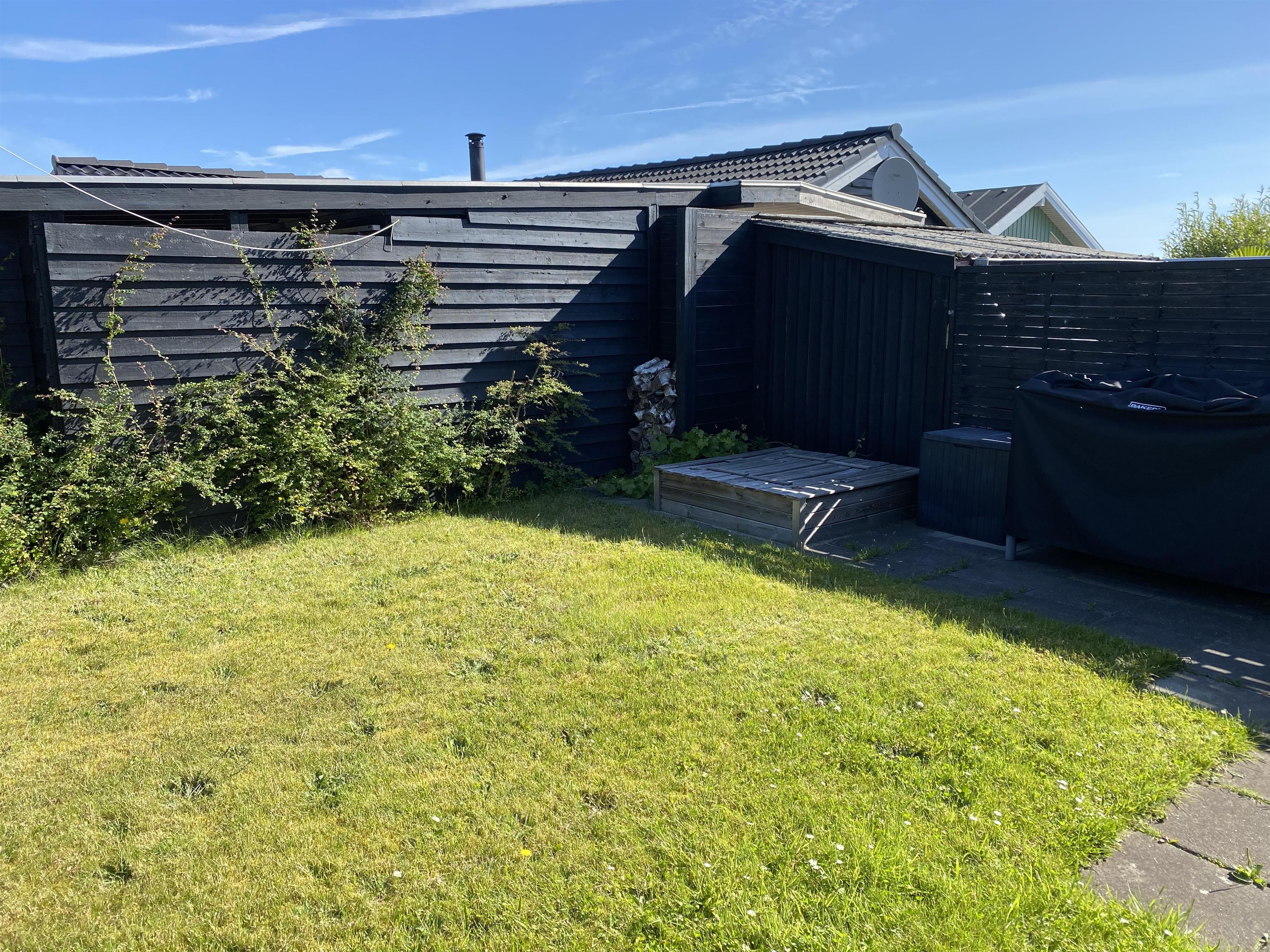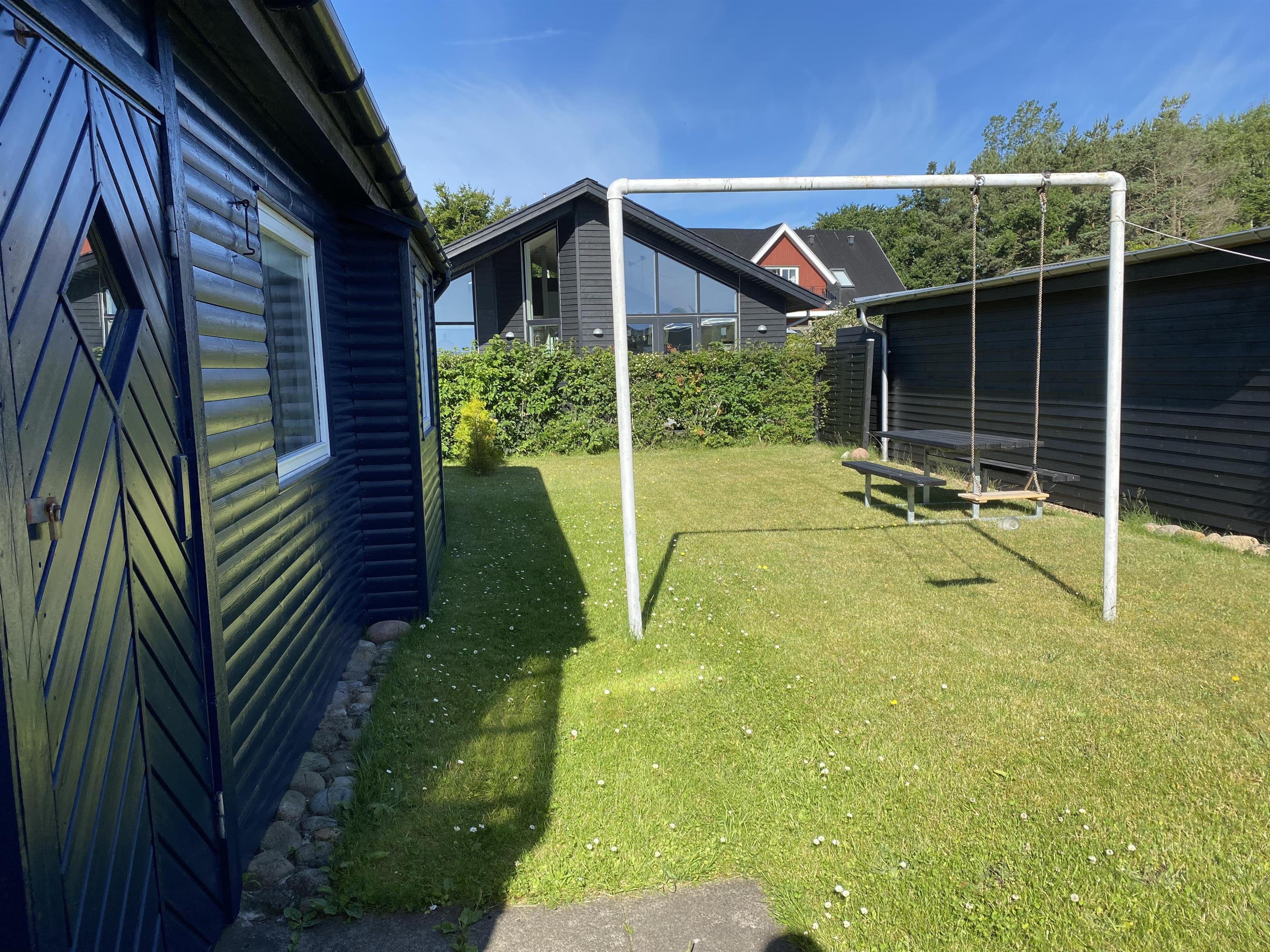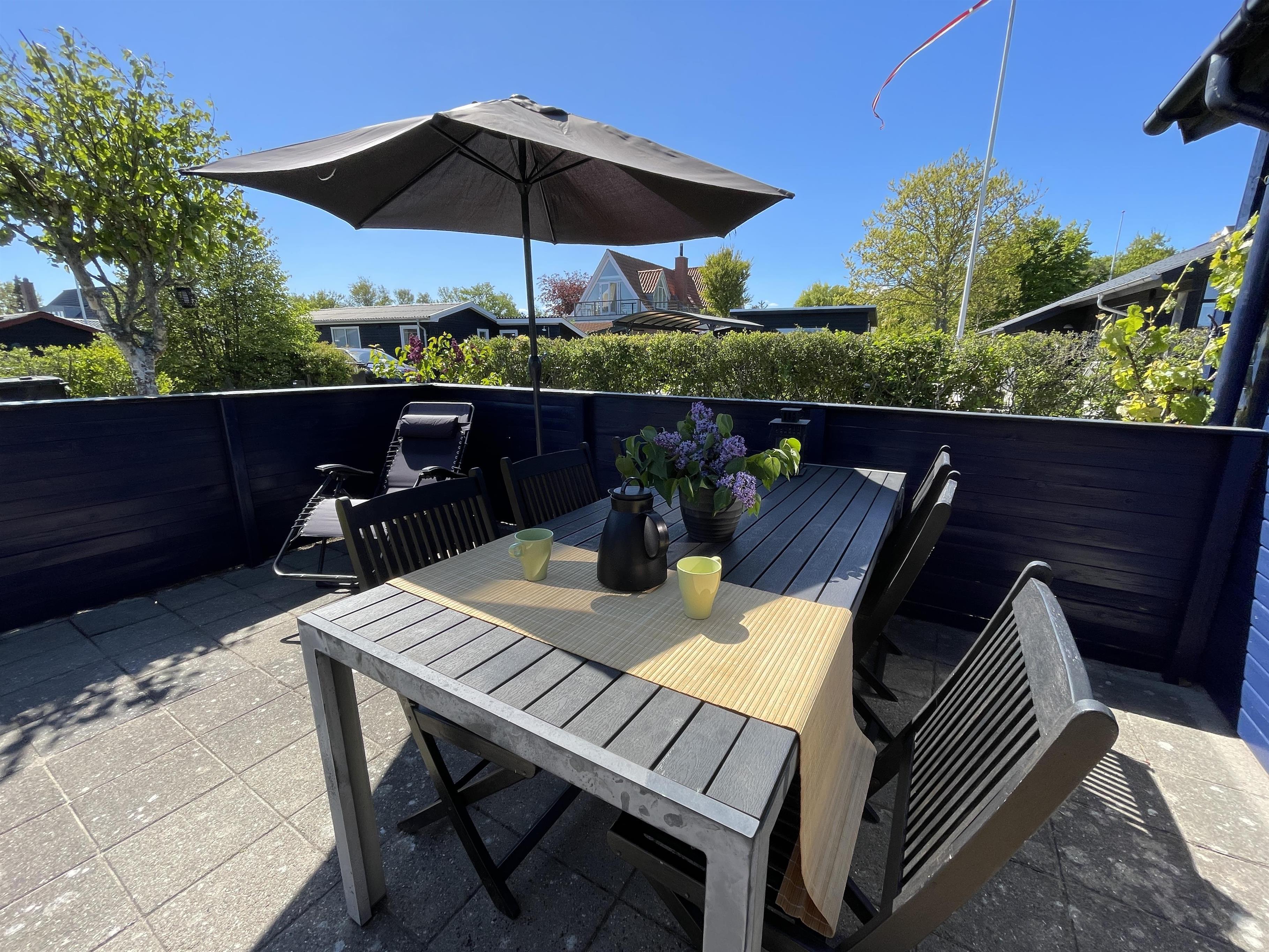 På en lille hyggelig afskærmet terrasse, kan du nyde solen og feriens dejlige måltider. Her er også gynger og sandkasse til mange timers leg med børnene.