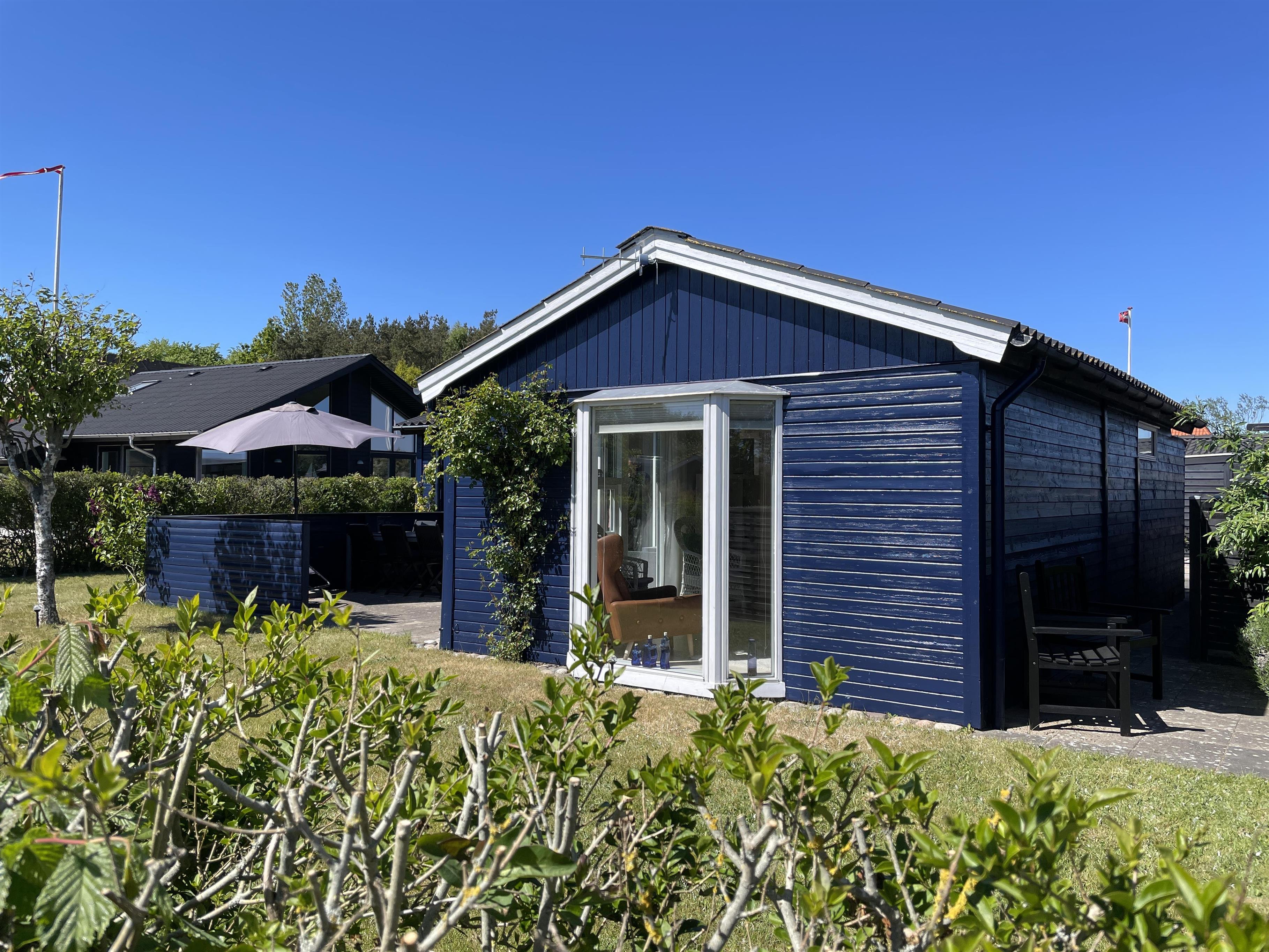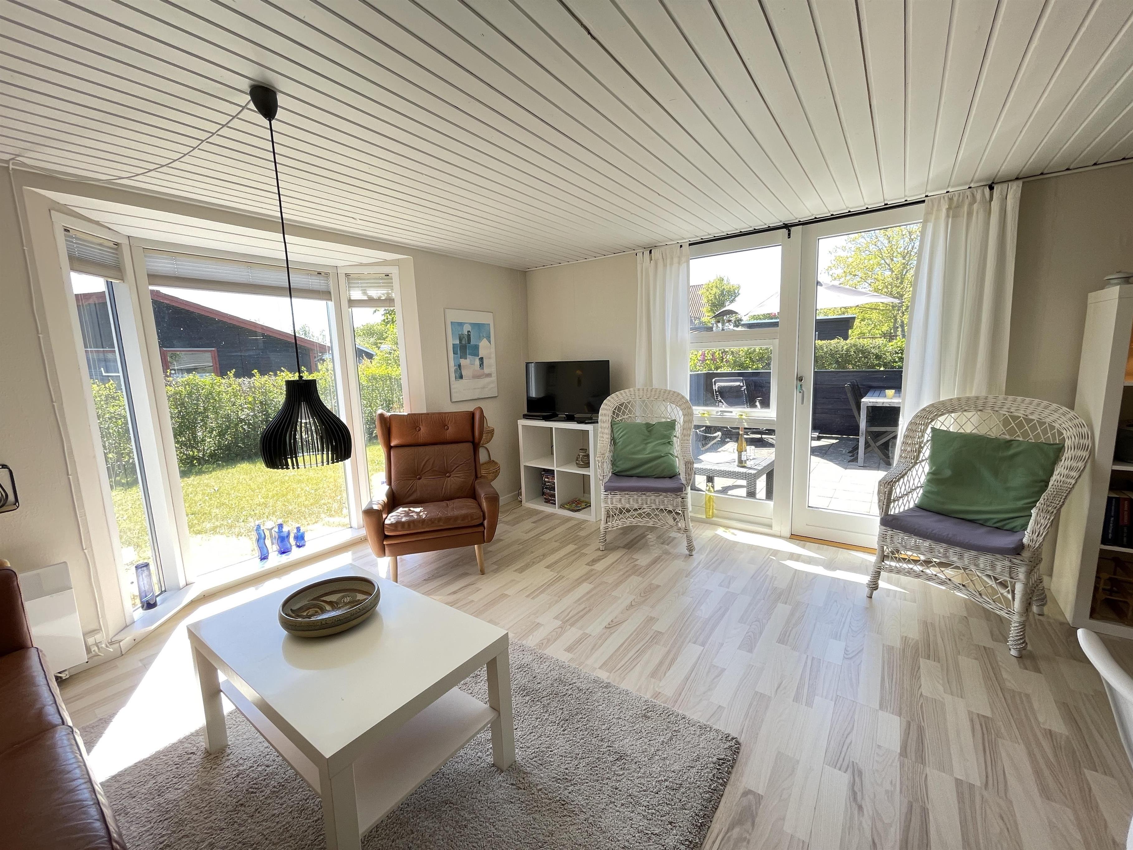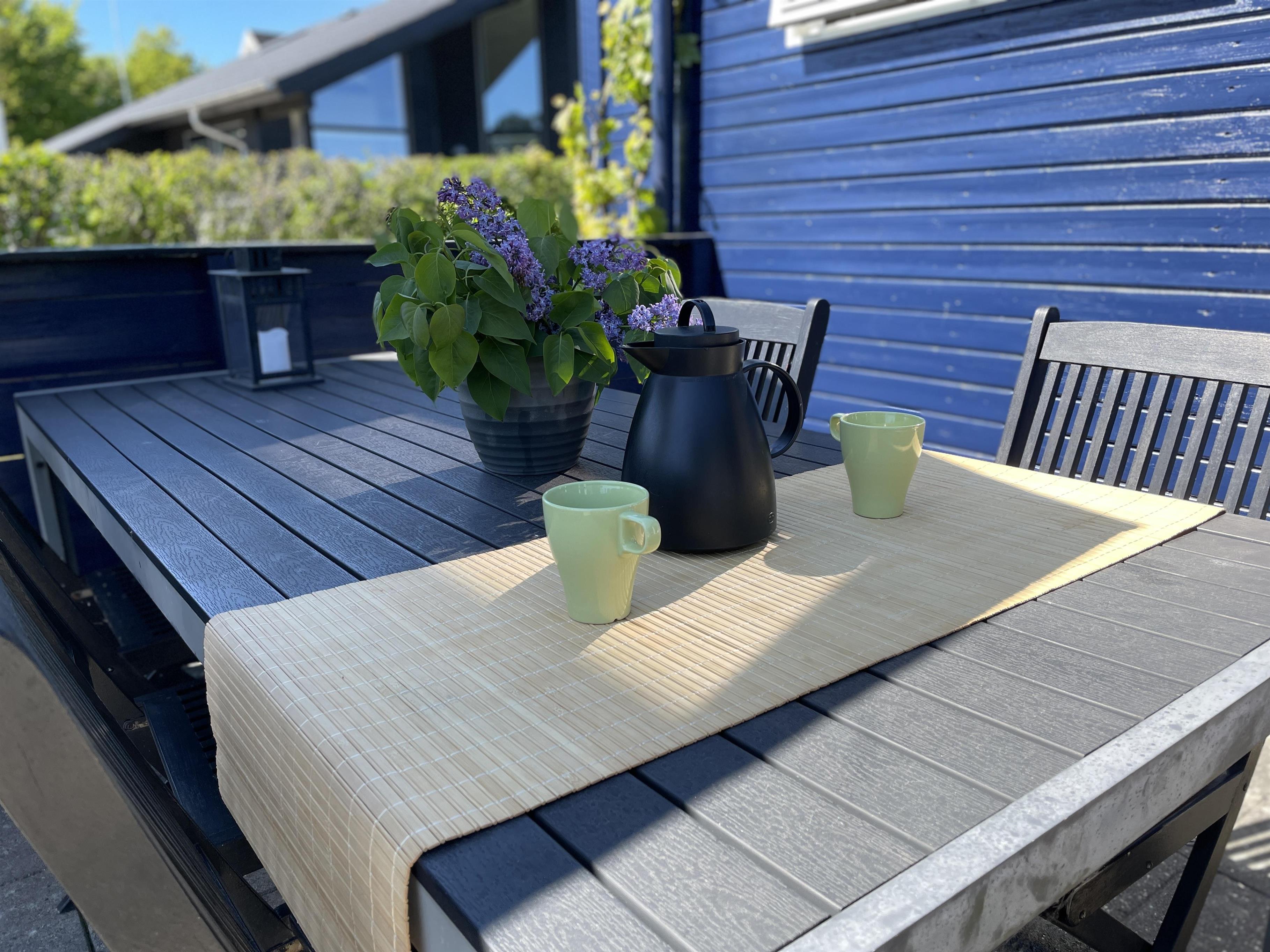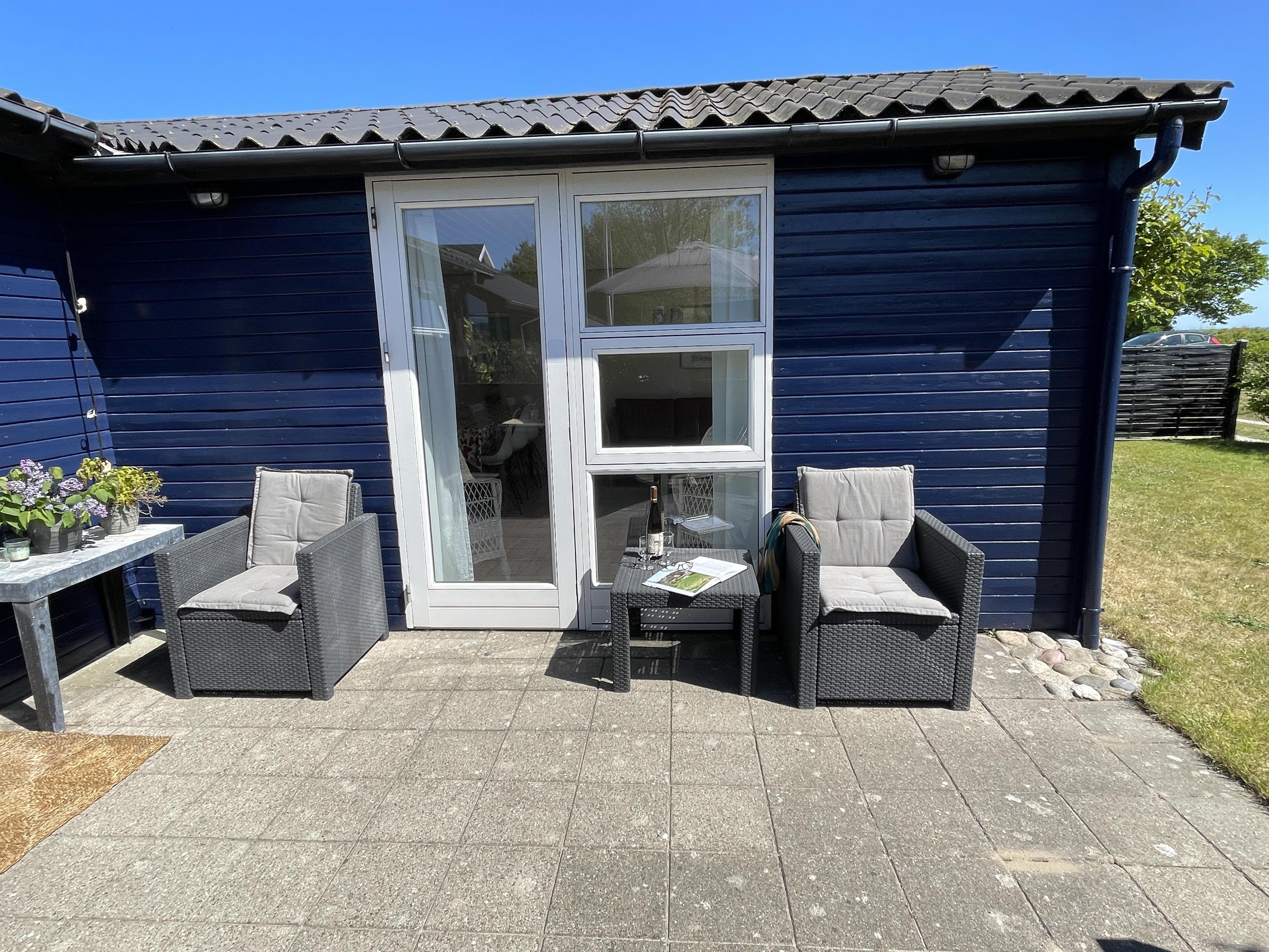 På en lille hyggelig afskærmet terrasse, kan du nyde solen og feriens dejlige måltider. Her er også gynger og sandkasse til mange timers leg med børnene.