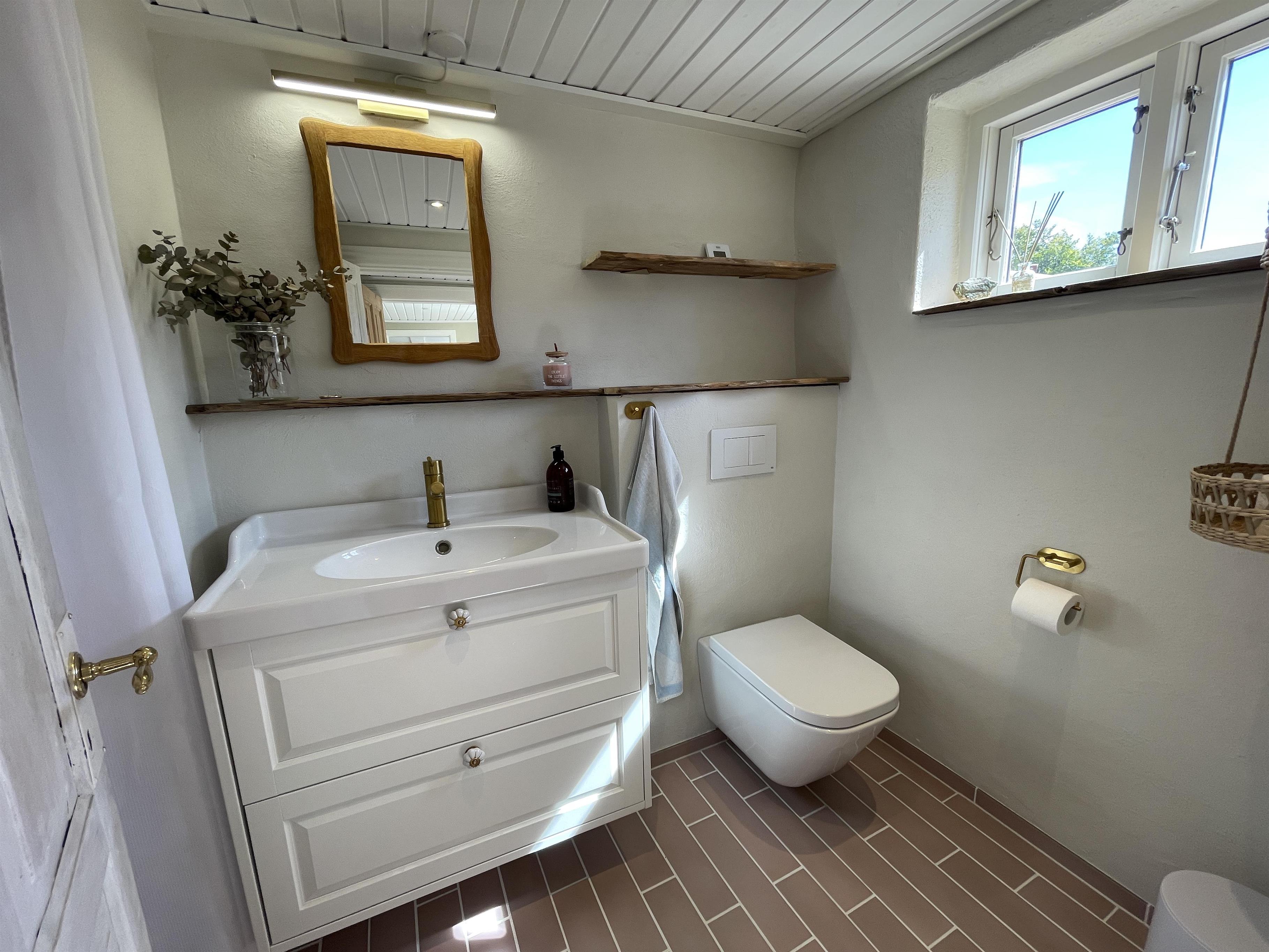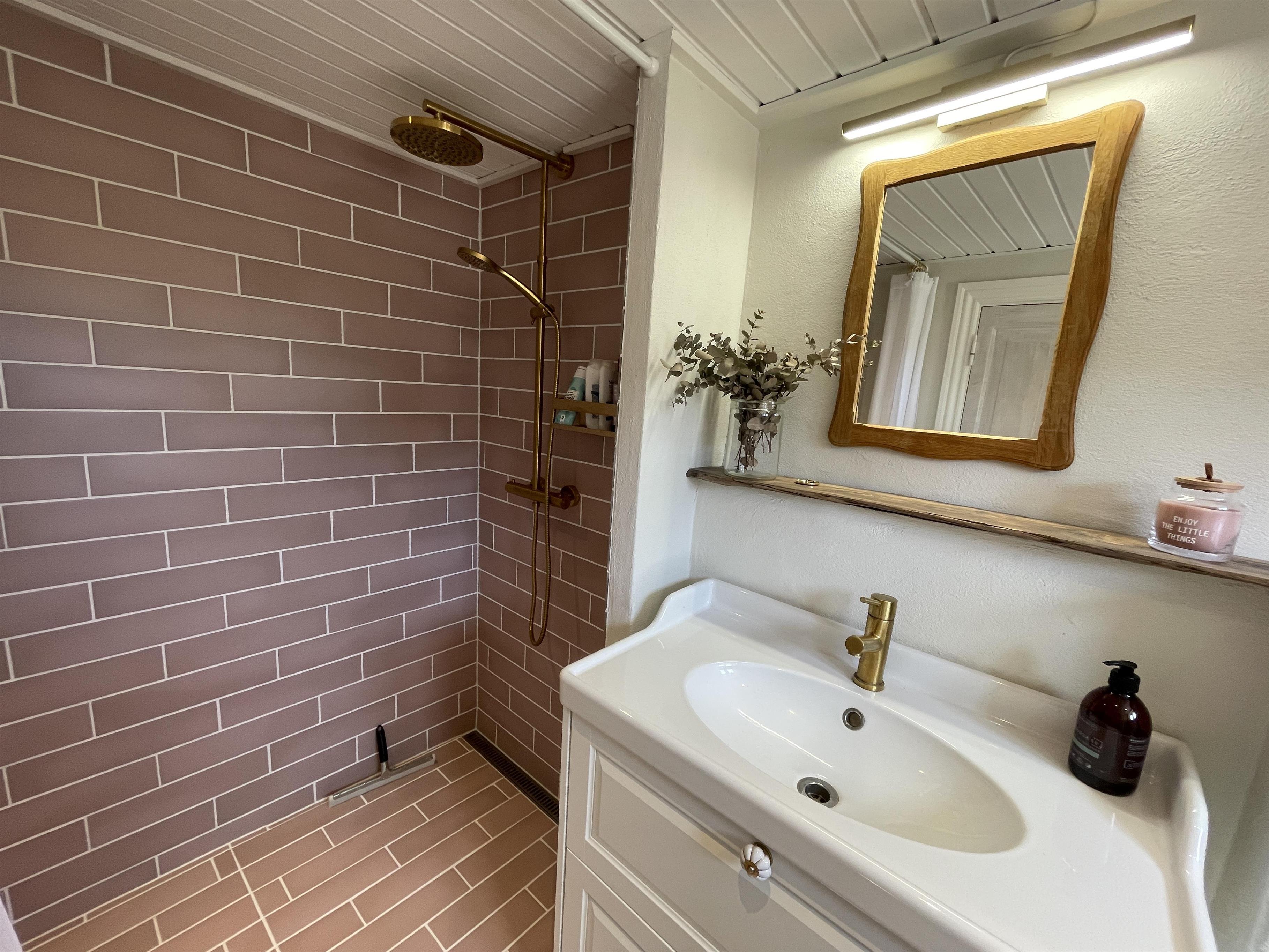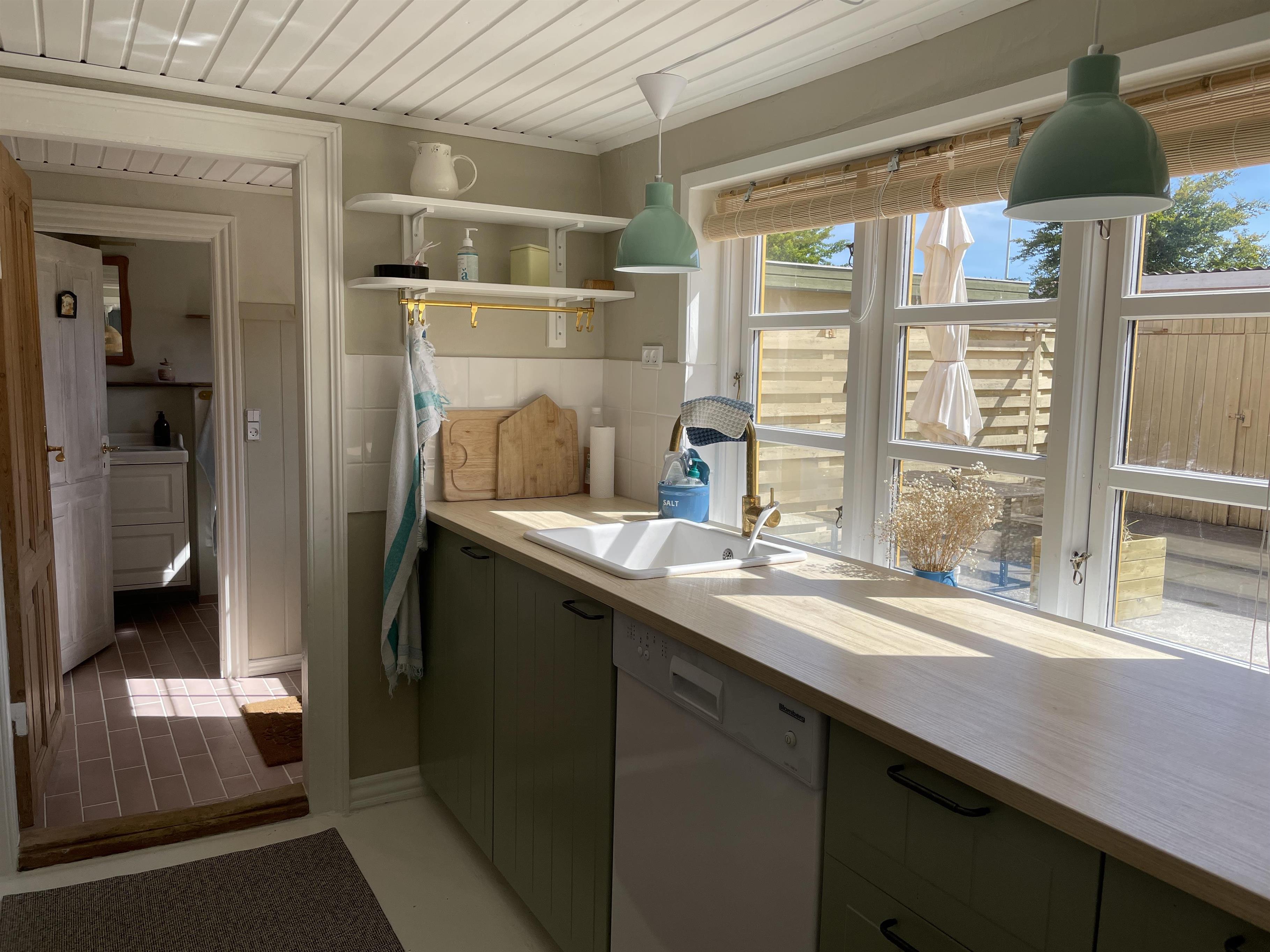 Køkkenet er med nye og moderne elementer, og her er alle hårde hvidevarer, som skal bruges når sommerens måltider skal tilberedes. Badeværelset er nyrenoveret med klinker i en flot rosa farve, og med de smukkeste detaljer!