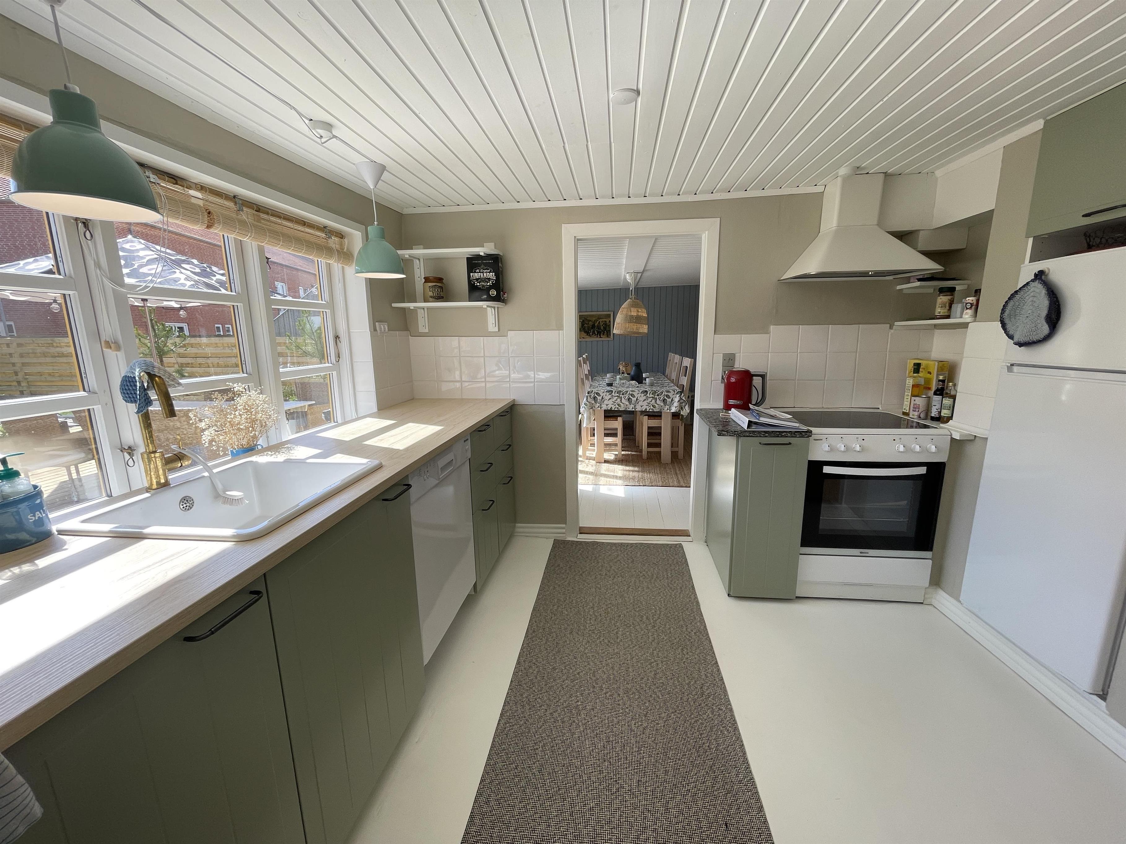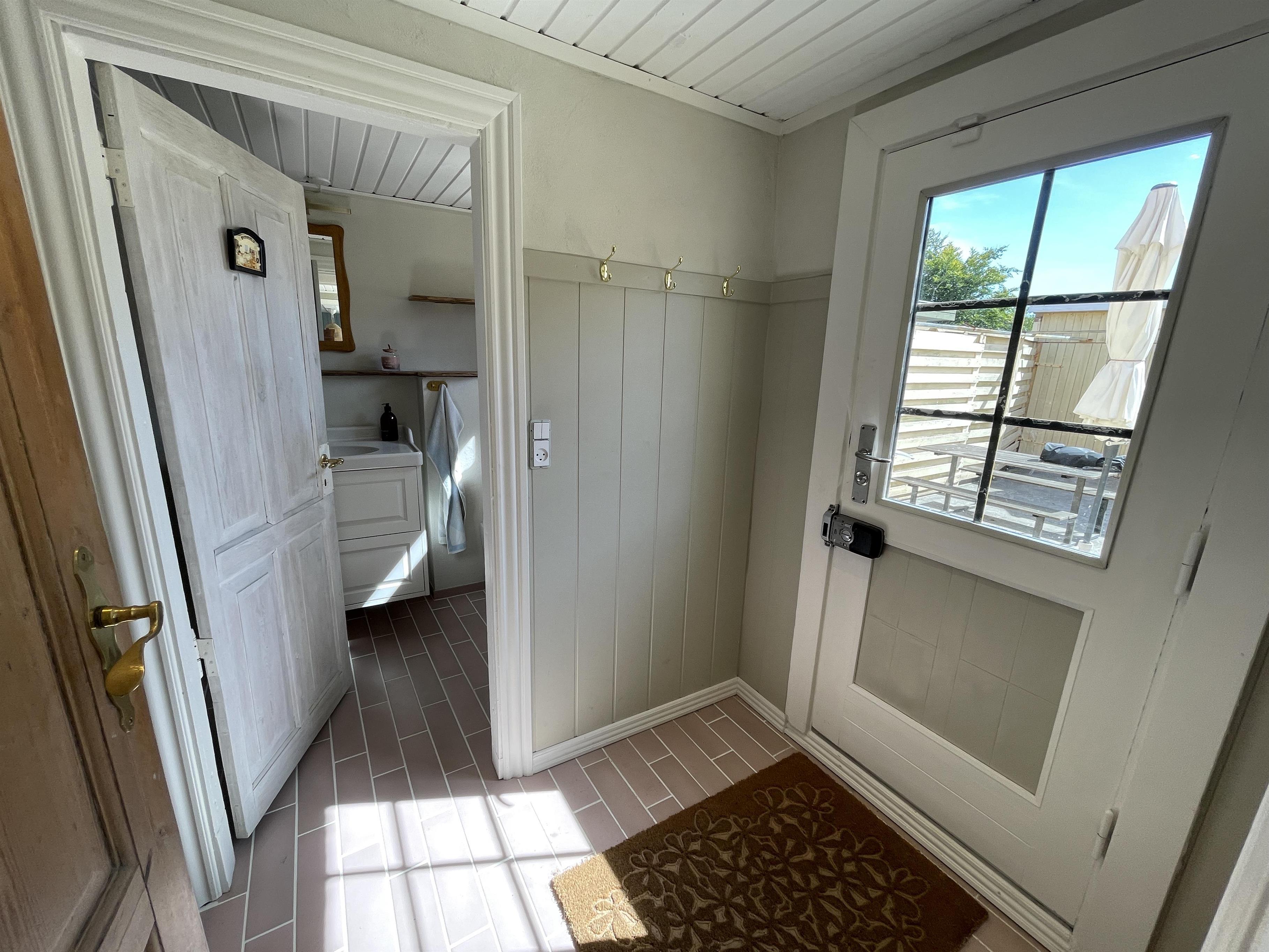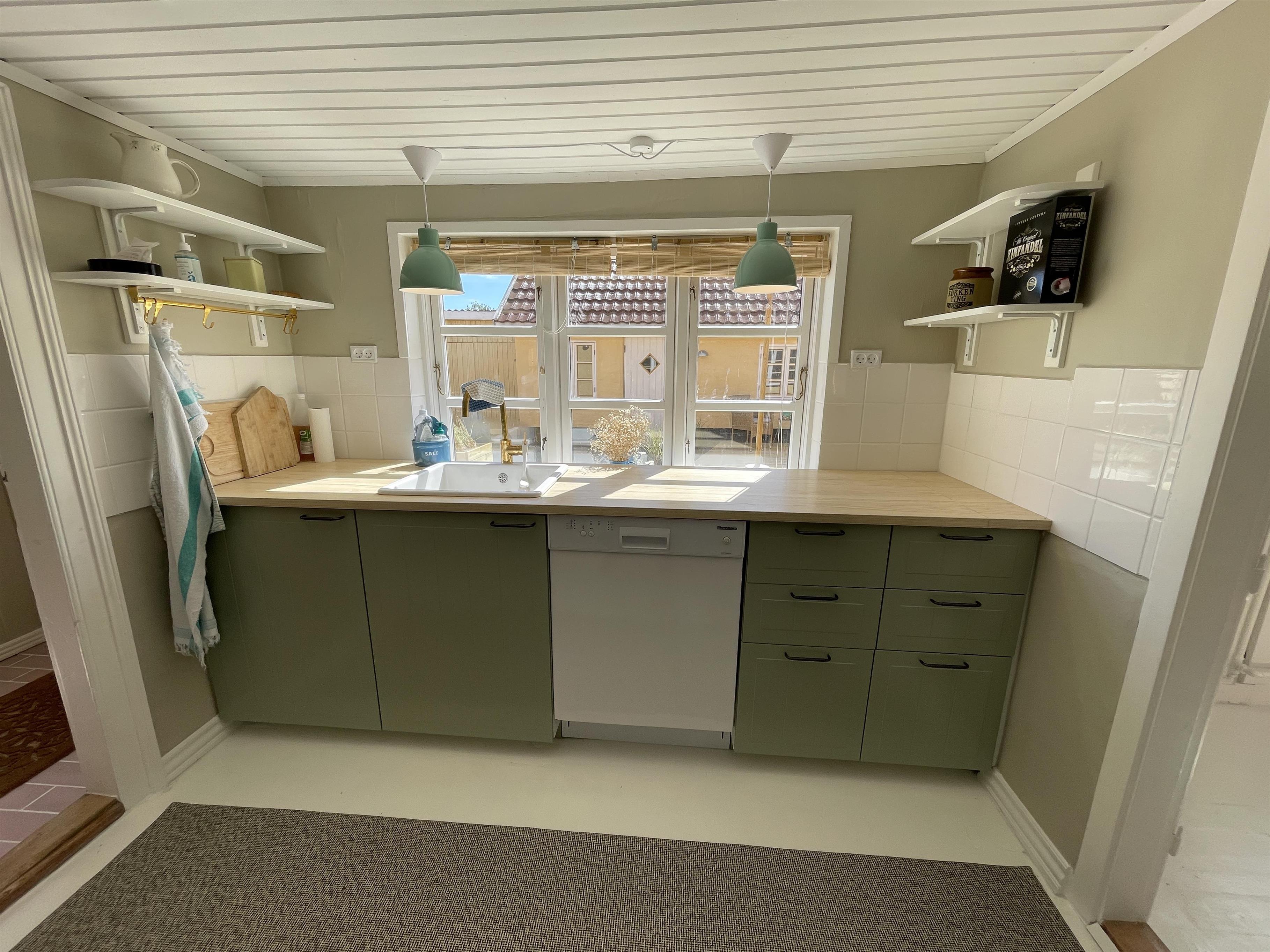 Køkkenet er med nye og moderne elementer, og her er alle hårde hvidevarer, som skal bruges når sommerens måltider skal tilberedes. Badeværelset er nyrenoveret med klinker i en flot rosa farve, og med de smukkeste detaljer!
