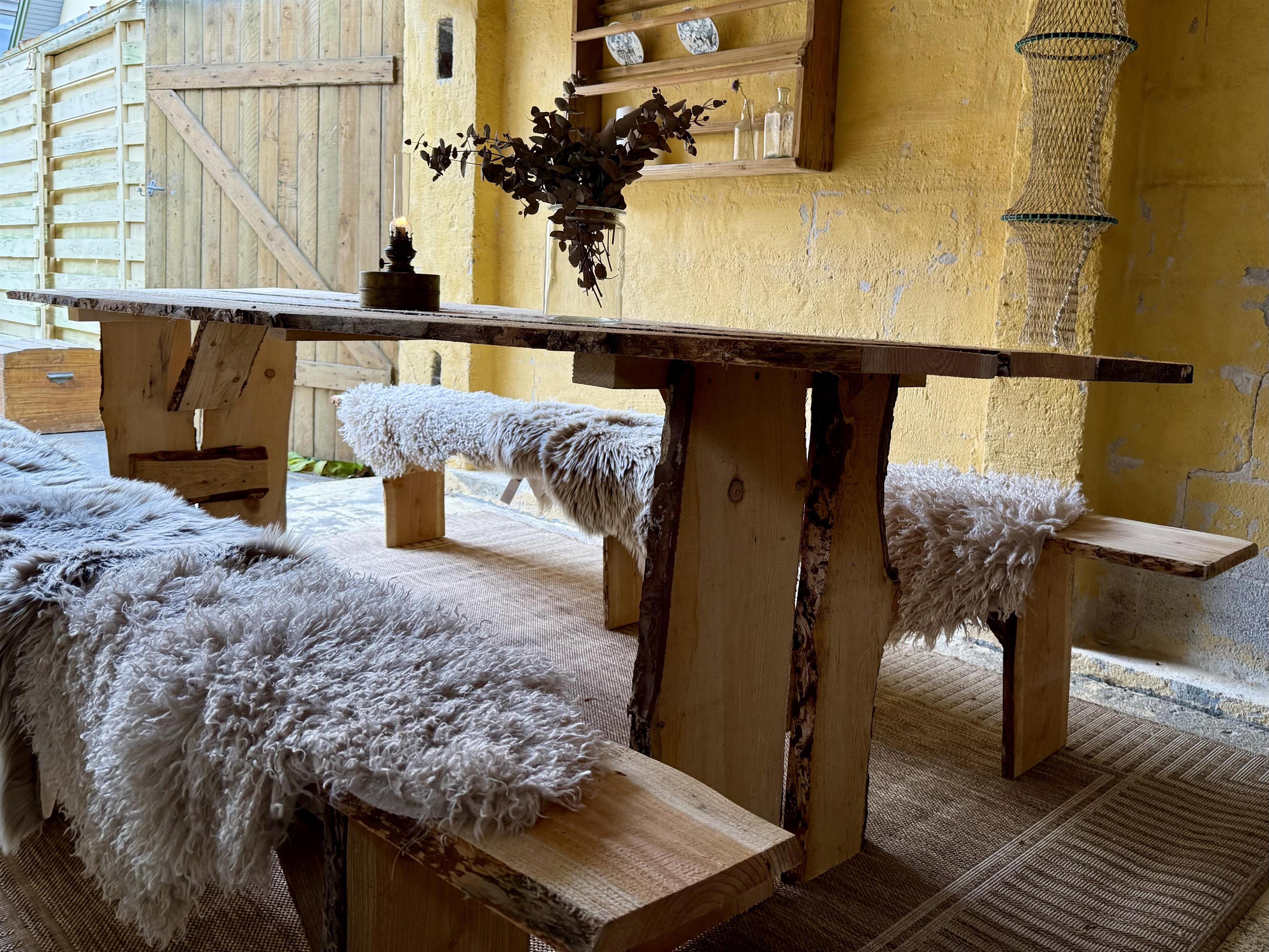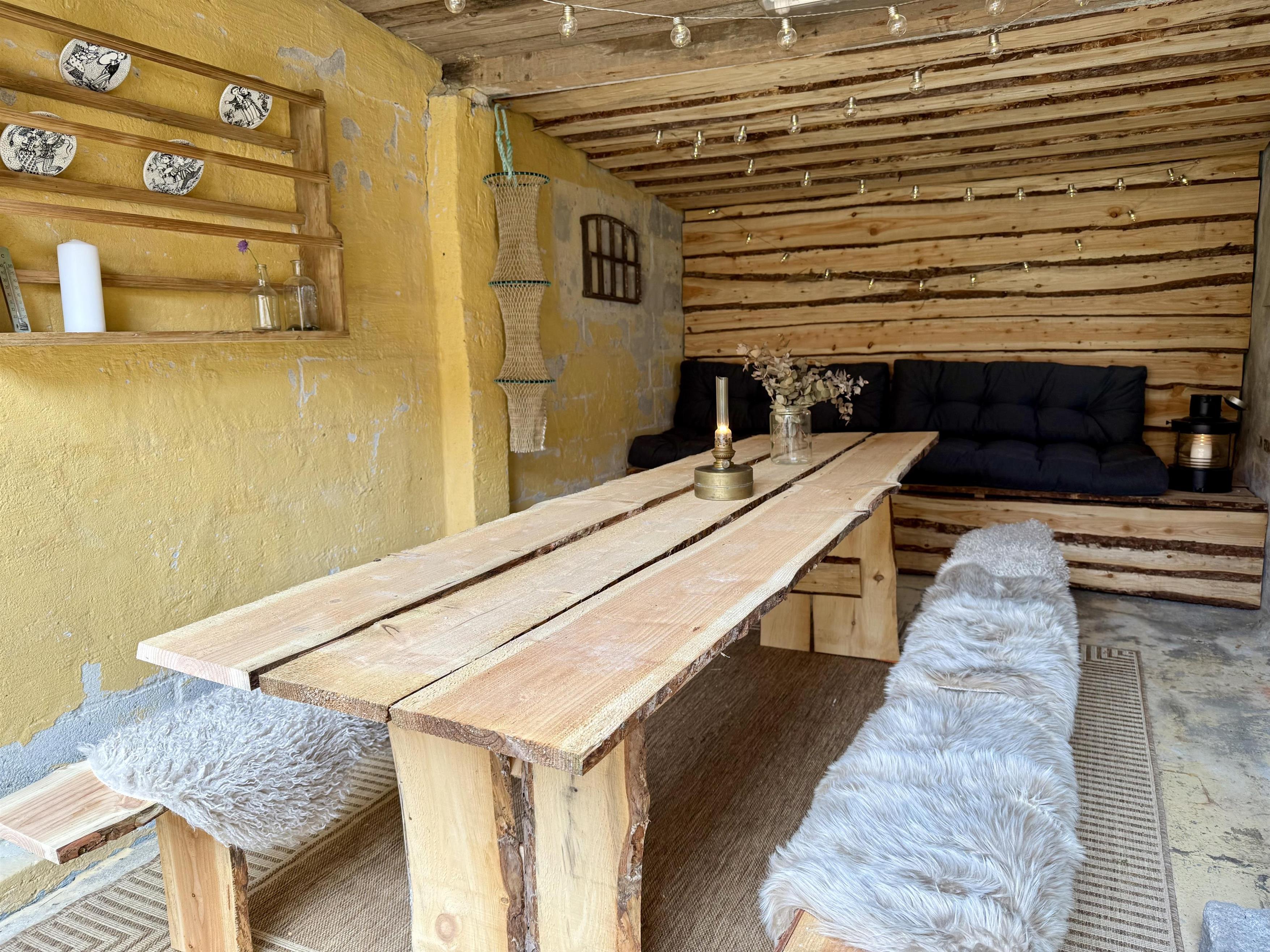 I forbindelse med terrassen er der lavet en rustik, stemningsfuld oase i udhuset. Her er langborde og bænke i smukt, ubehandlet træ med lammeskind, hyggelige lyskæder, loungemøbler og varme. Perfekt til hyggelige middage og afslapning uanset vejret – også på kølige aftener.