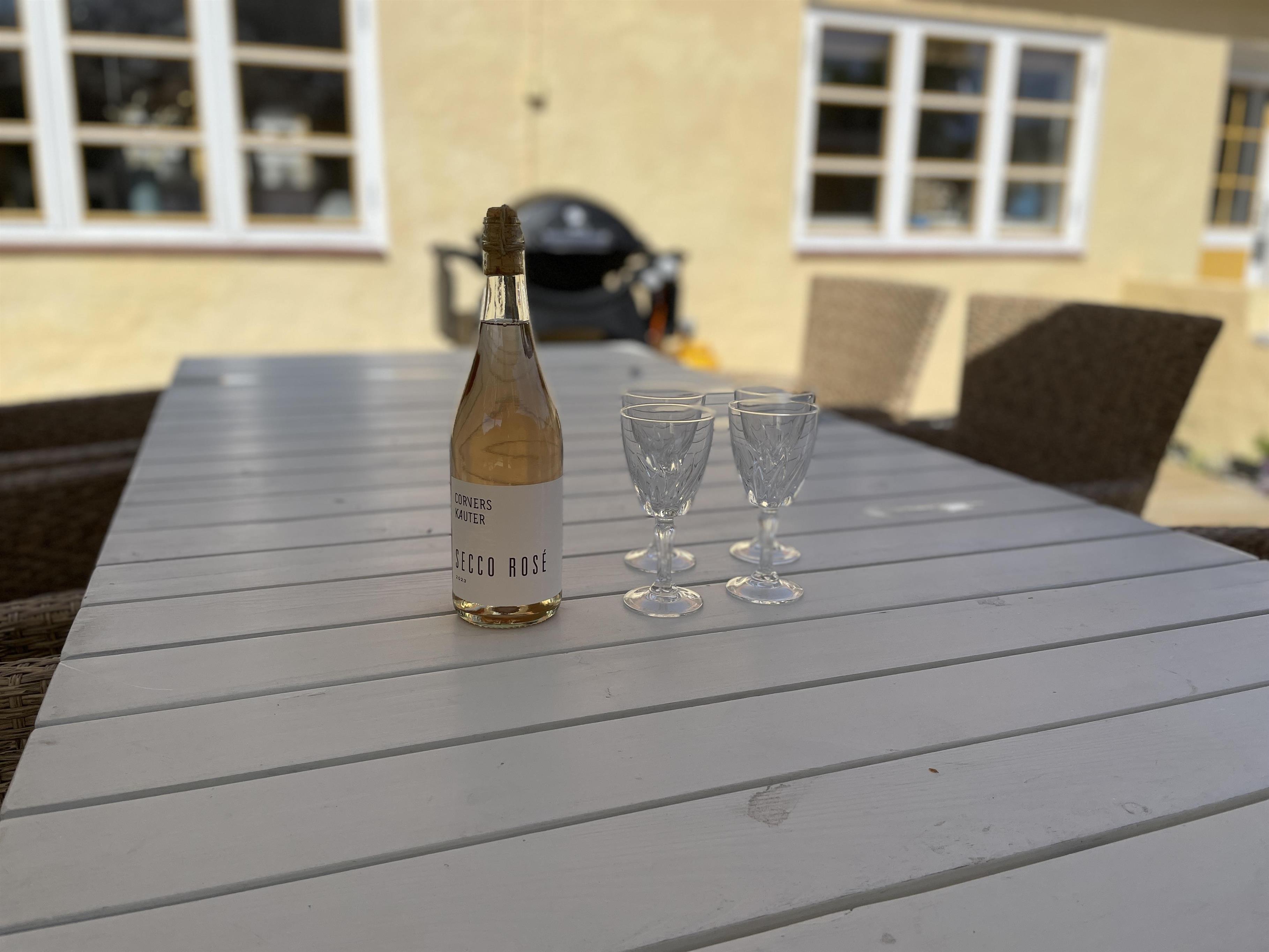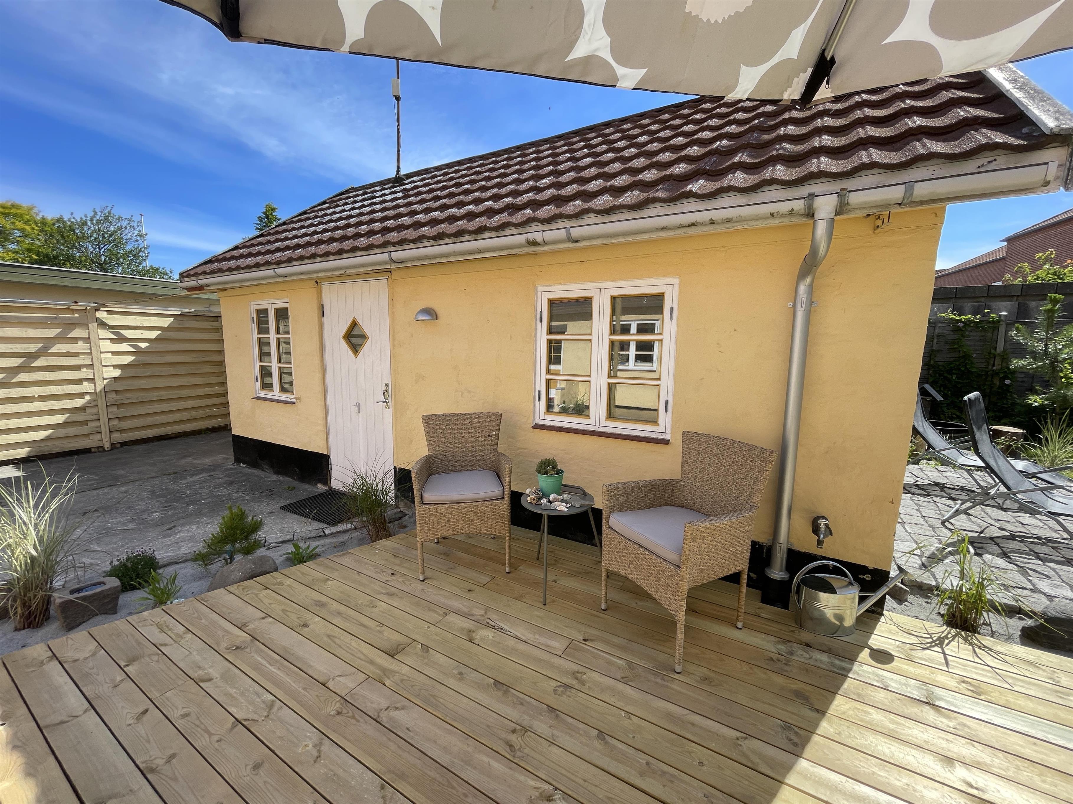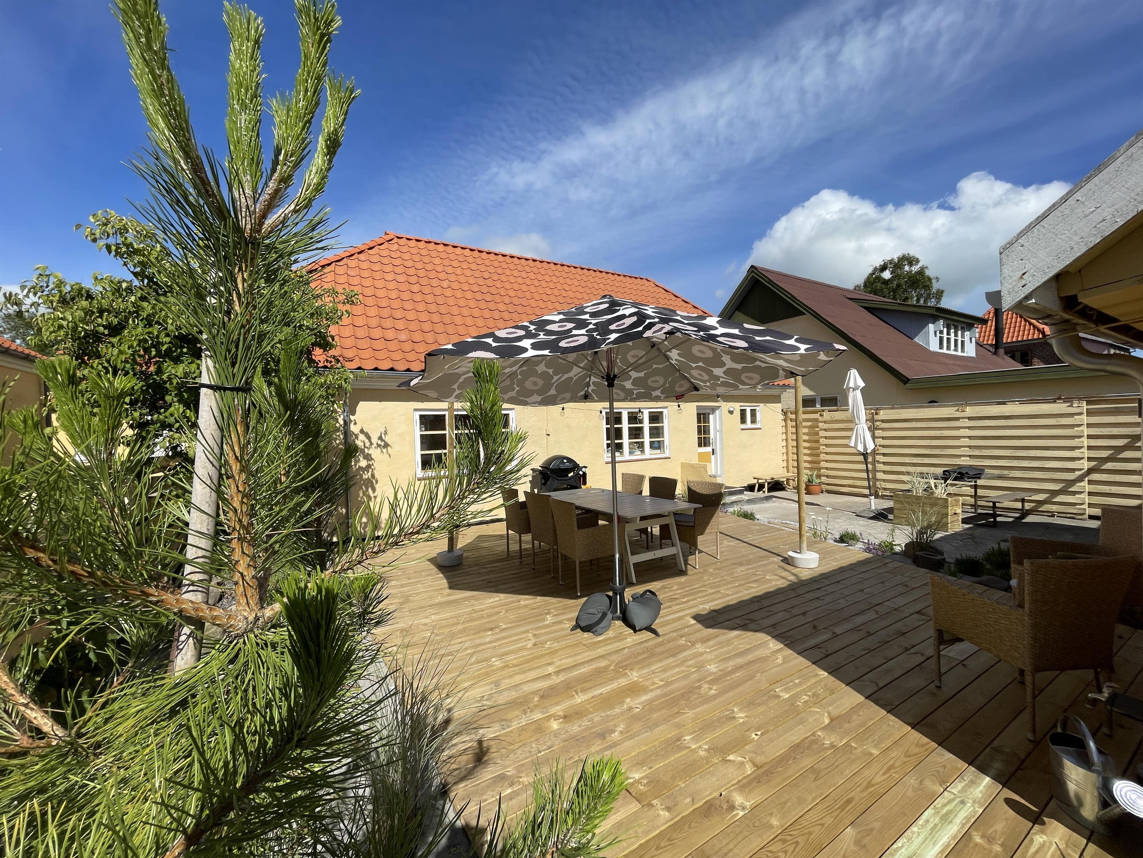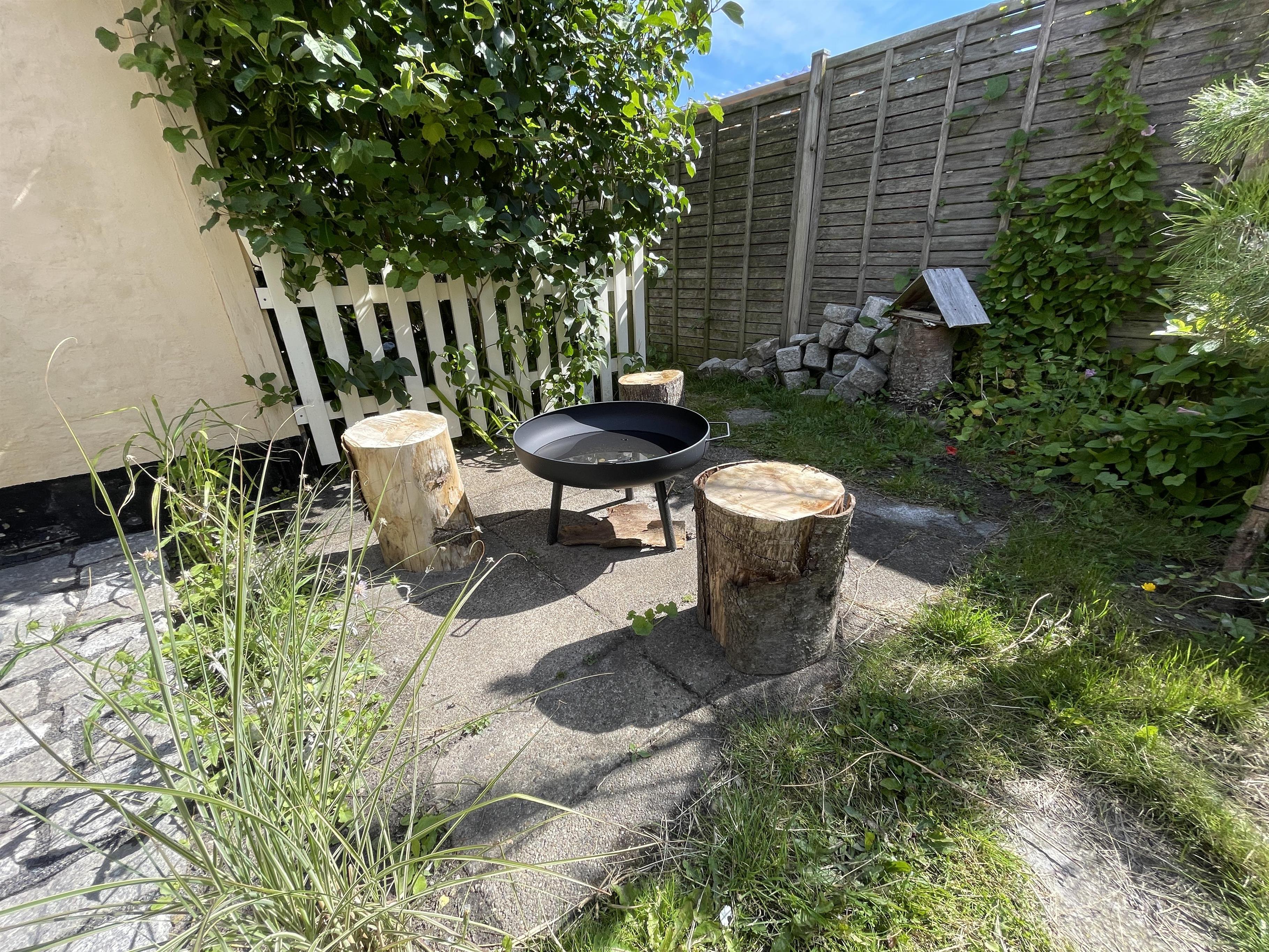 Ude er den skønneste gårdhave med en stor ny træterrasse, dejlige havemøbler og en god grill, samt et hyggeligt lukket gårdmiljø med små grønne buske og planter. Det er en lille oase, hvor der er mulighed for at nye udelivet i sol og i ly af vejrets luner under parrassollen og den hyggelige lyskæde.