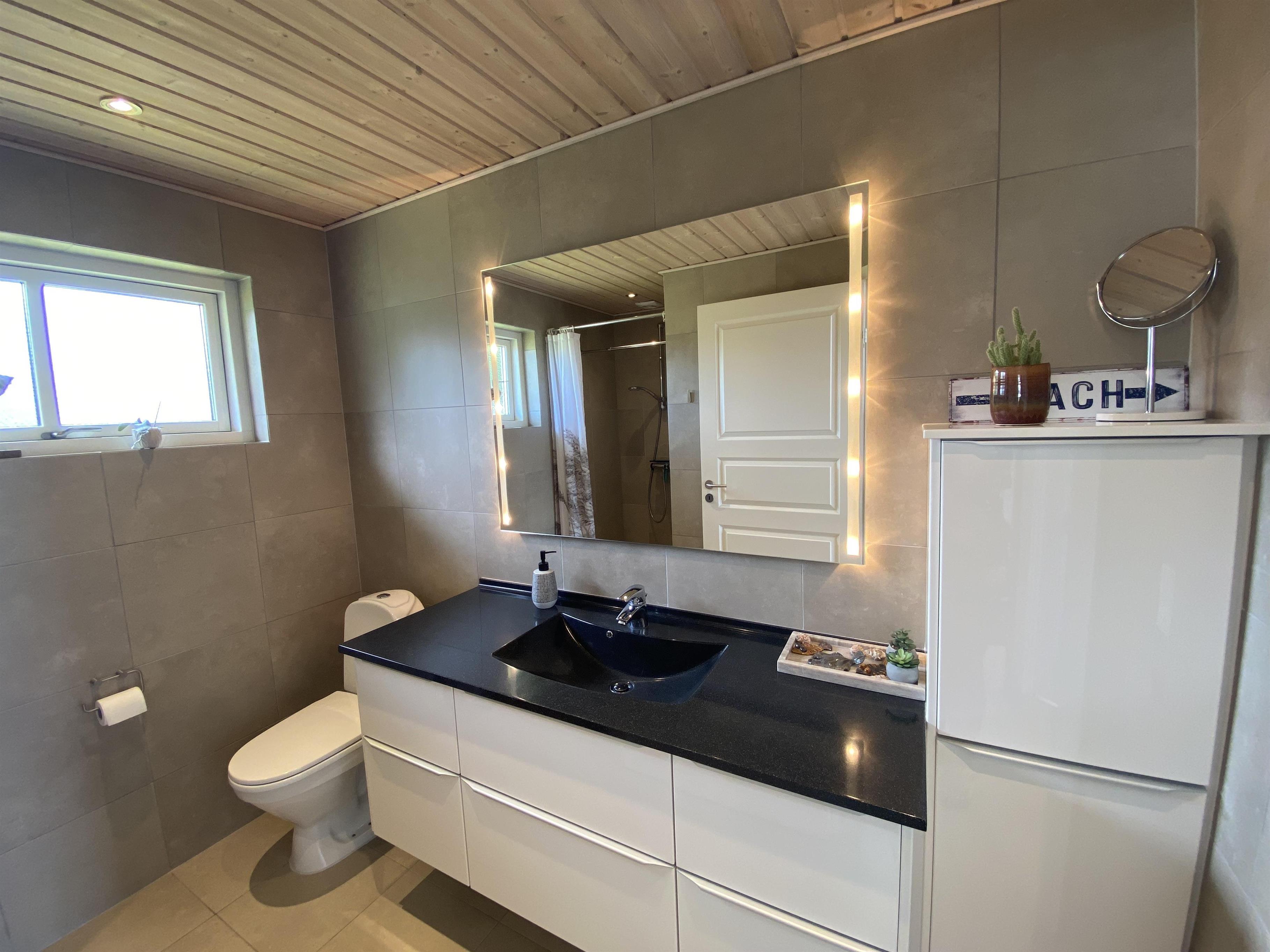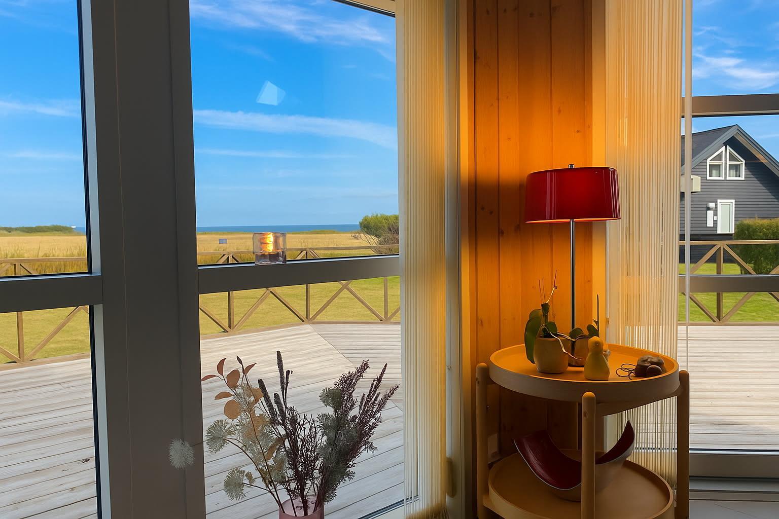 Alrummet er rummelig og lyst indrettet, med sofagruppe og spisebord vendt mod de store vinduer, der giver en dejlig udsigt til havet og naturen, samt i god forbindelse med køkkenet. I køkkenet finder man alt hvad man skal bruge til madlavning på induktionskomfuret eller grillen på terrassen. Derudover rummet køkkenet også indbygningsovn, køleskab, fryser og vaskemaskine/tørretumbler i et.