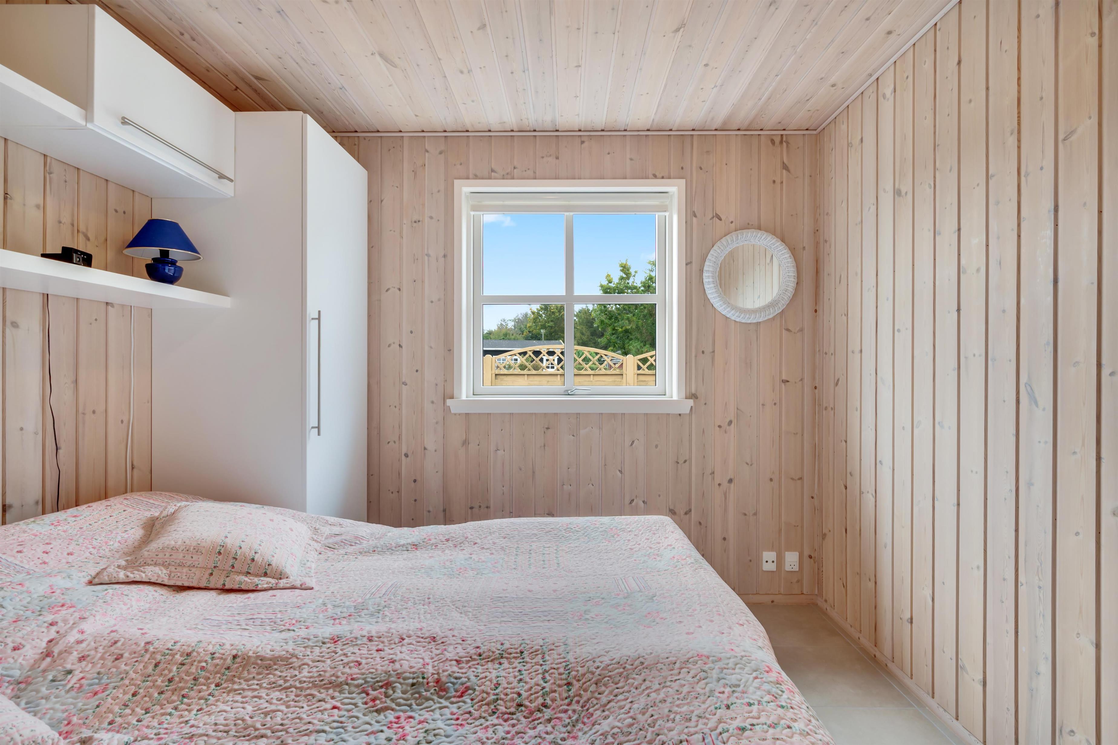 Dette hyggelige træsommerhus indbyder til samvær ude som inde, med den store græsplæne, de store terrasser og det store åbne køkken alrum. Den store træterrasse der næsten går hele vejen rundt huset, er mod syd afgrænset med et let hegn. Dette gør at man her kan side ugeneret ved terrasseborder eller i sofagruppe. Denne side af terrassen har også en stor makise (el-drevet), der giver god skygge på de varme dage. Fra huset går der en sti direkte til vandet, der ikke er mere end 175 meter væk.