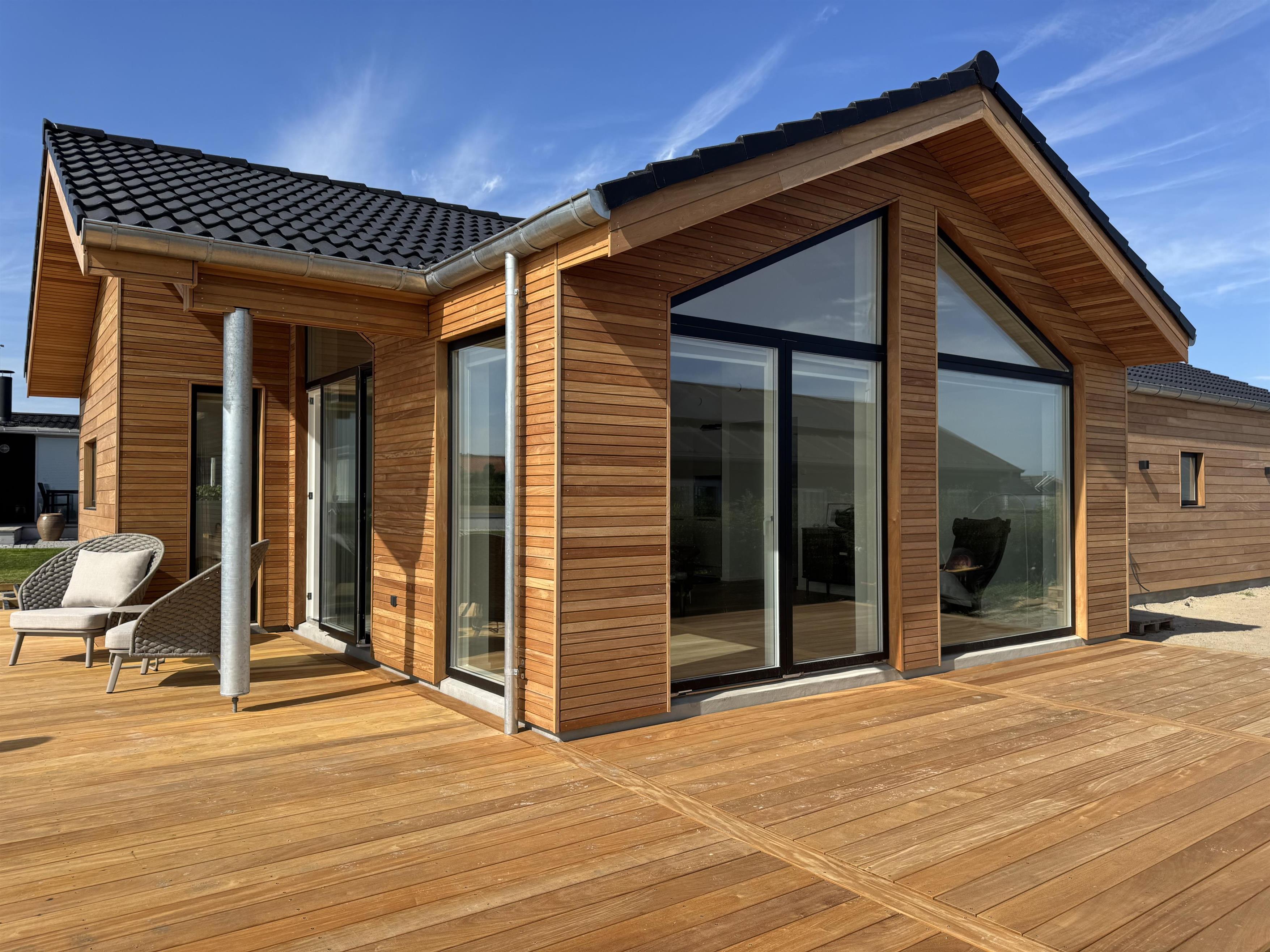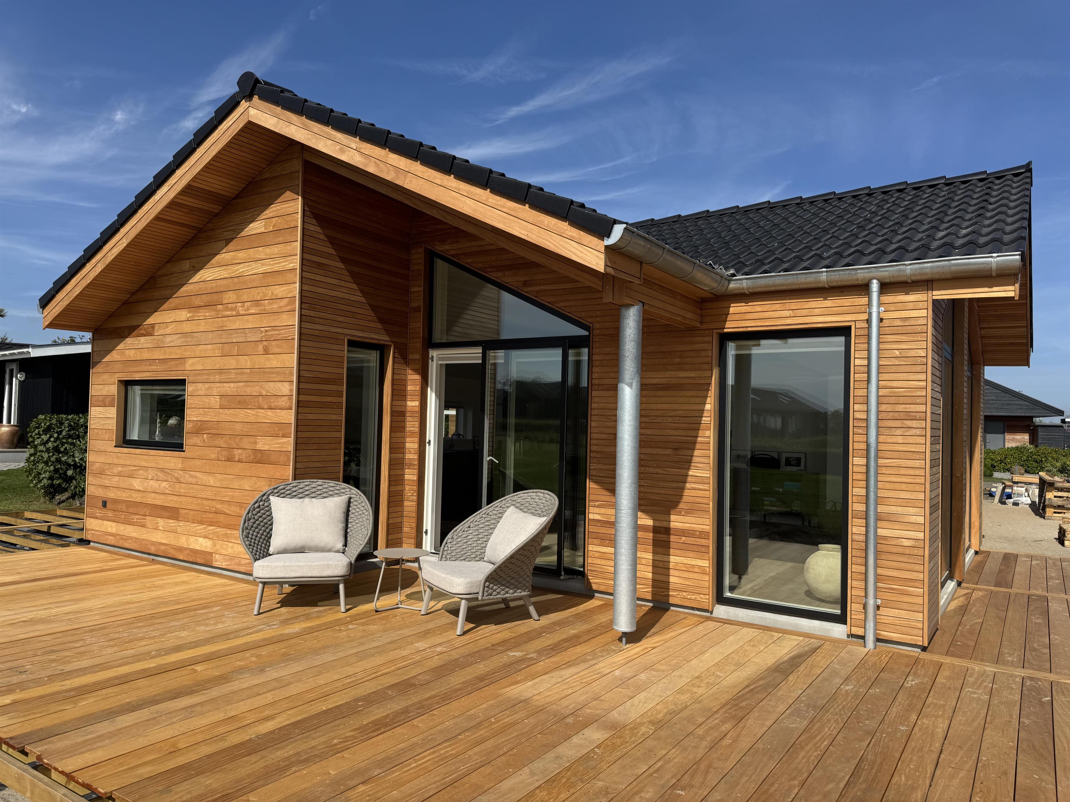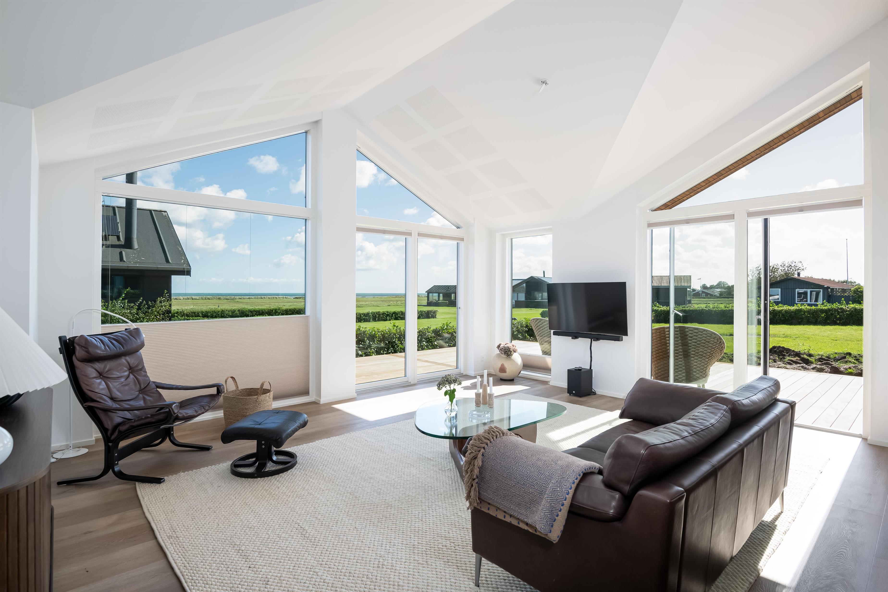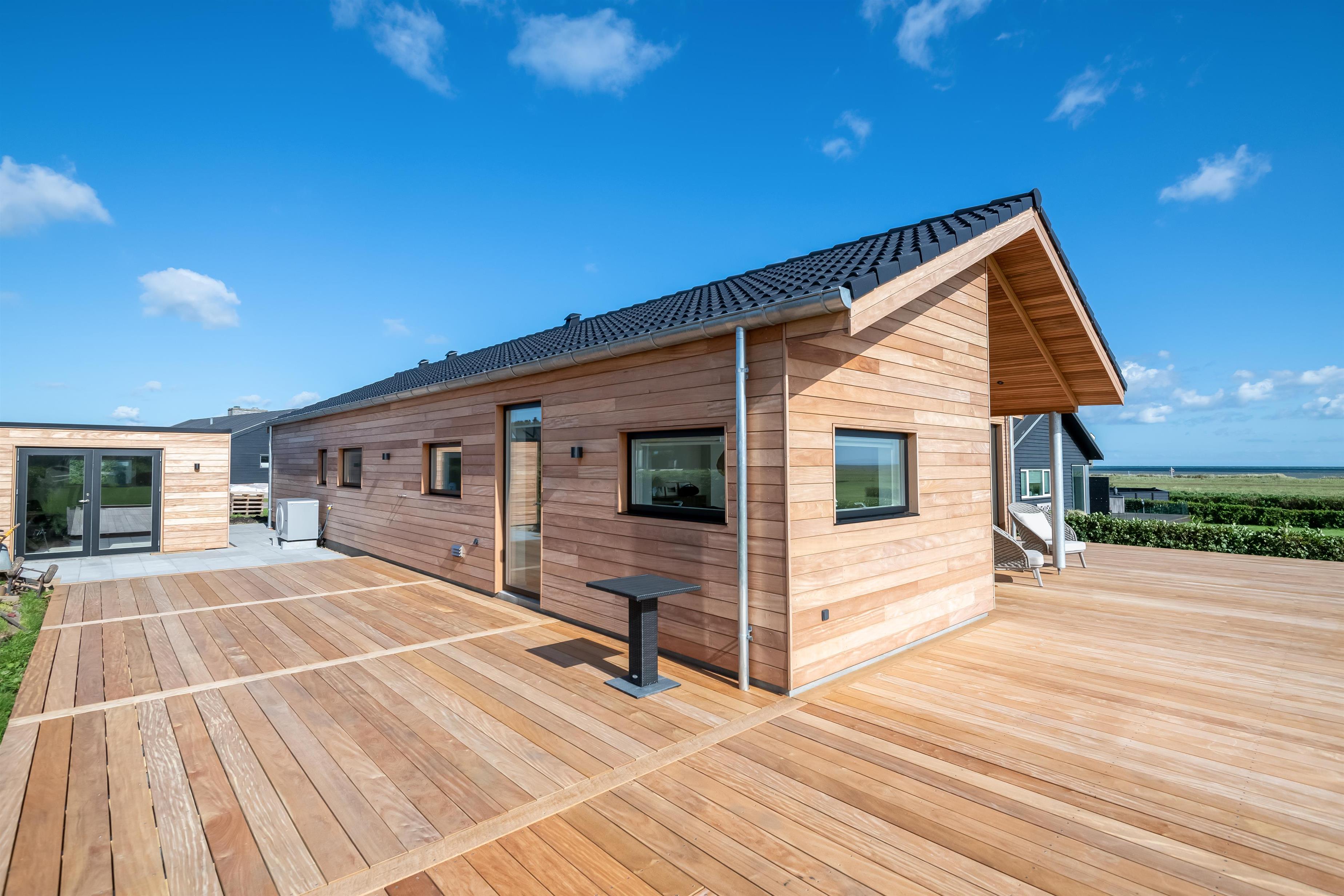 Dette dejlige træsommerhus er opført i 2025 og indeholder store lyse rum og udkig til havet, der blot ligger 150 meter væk.