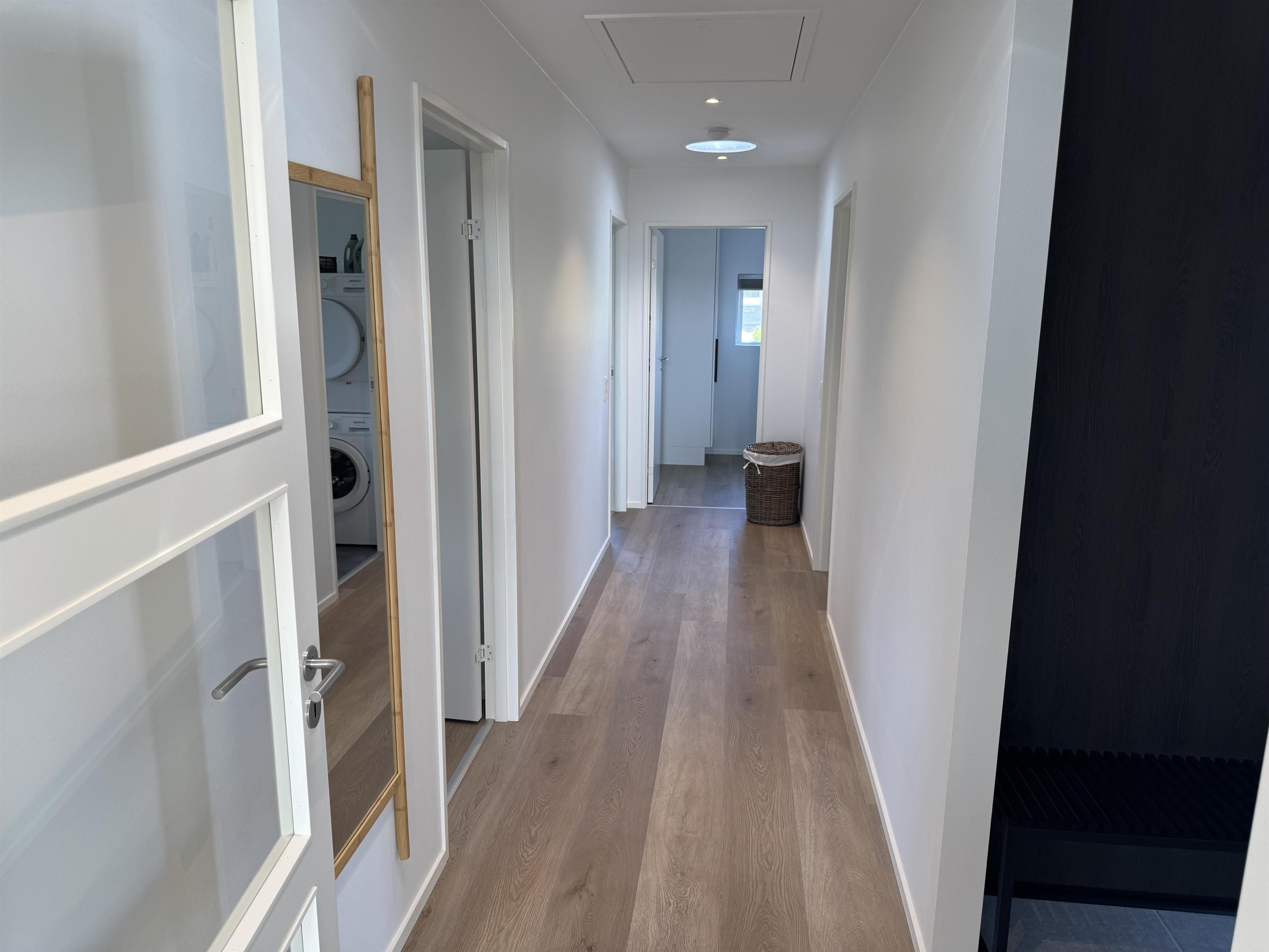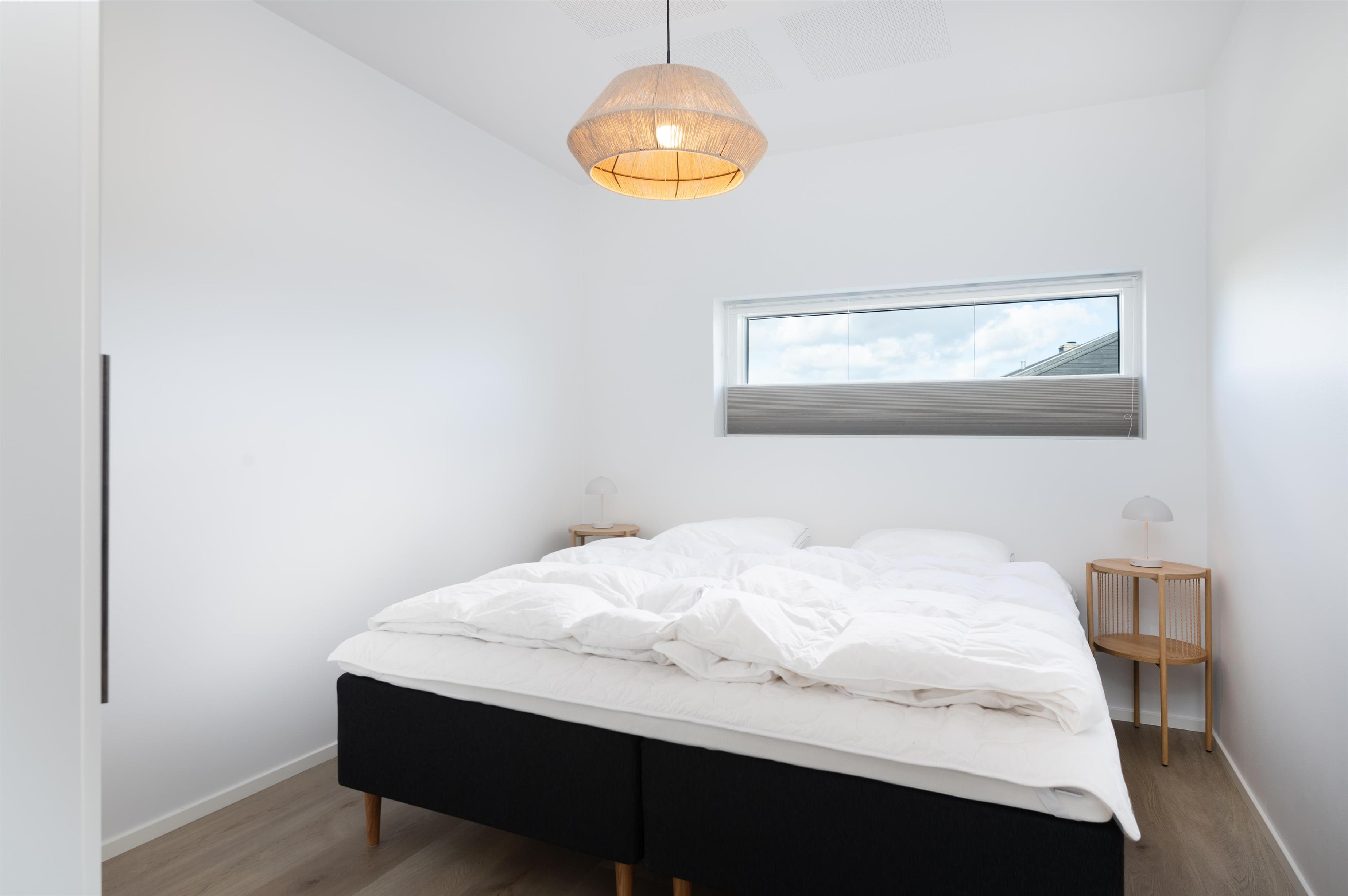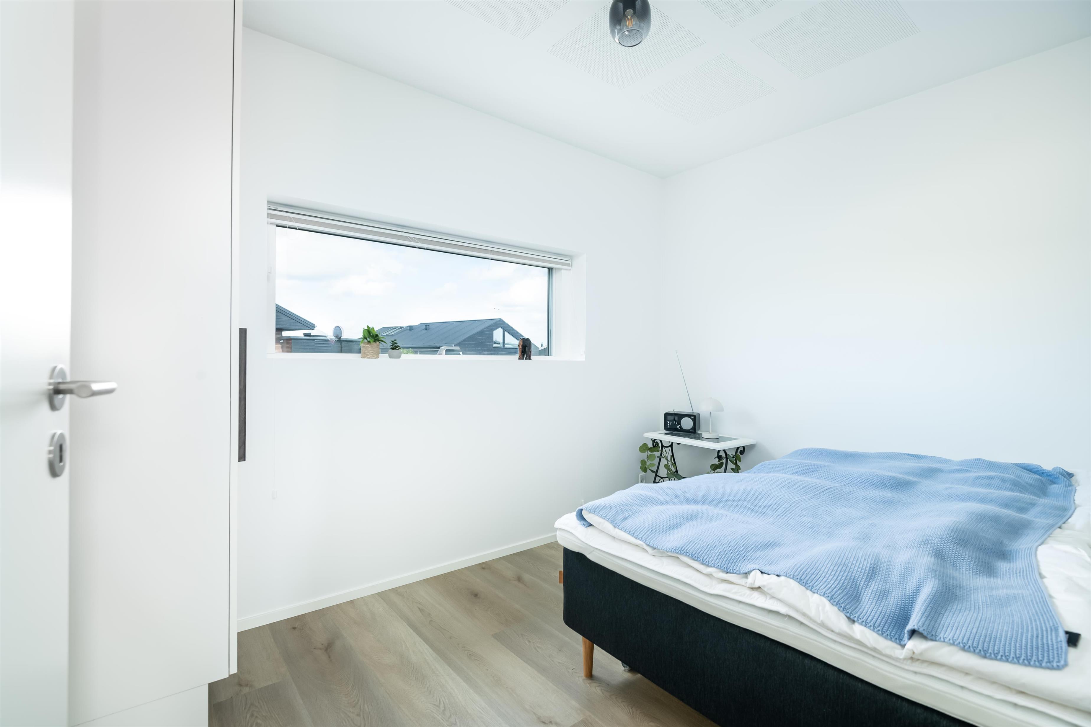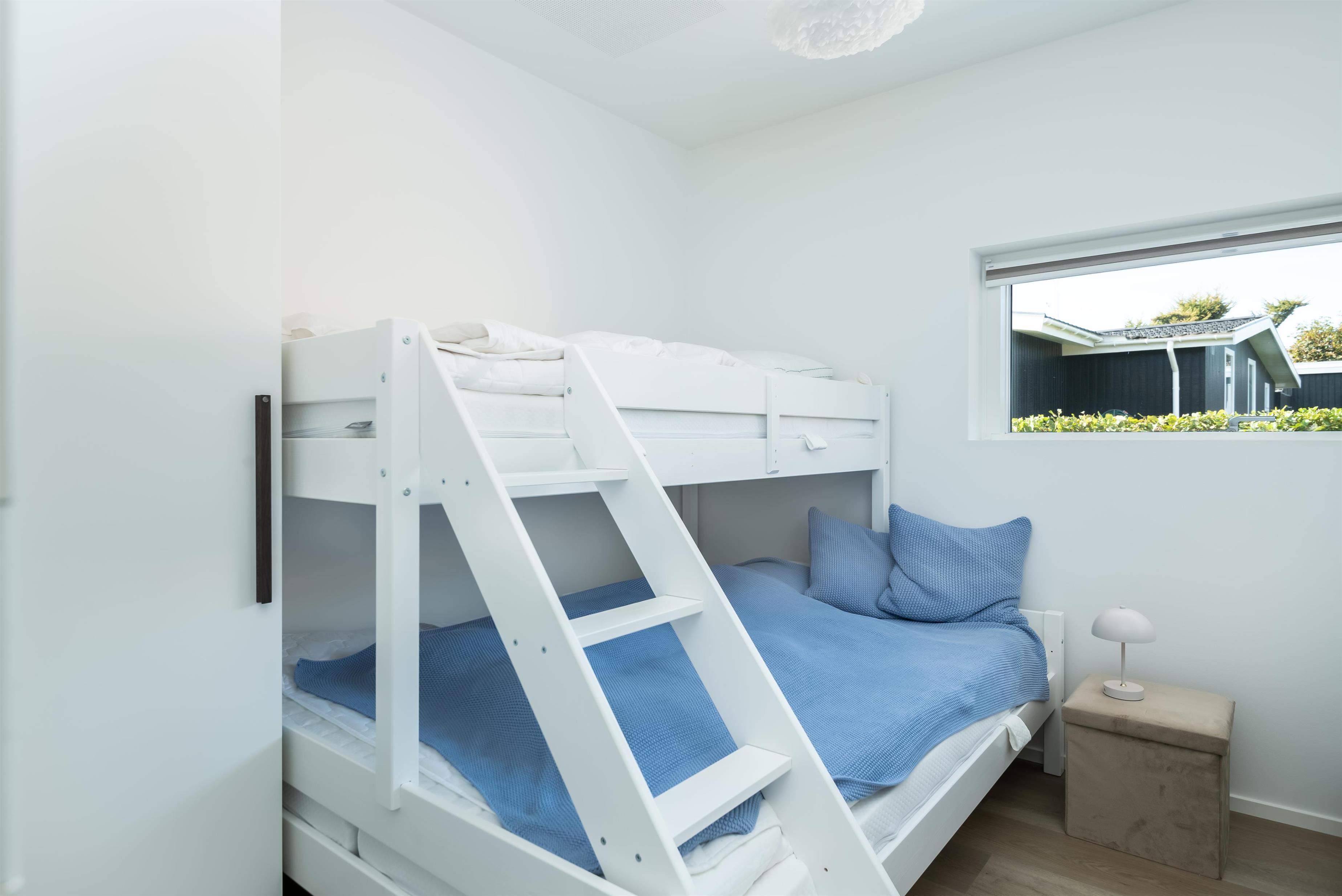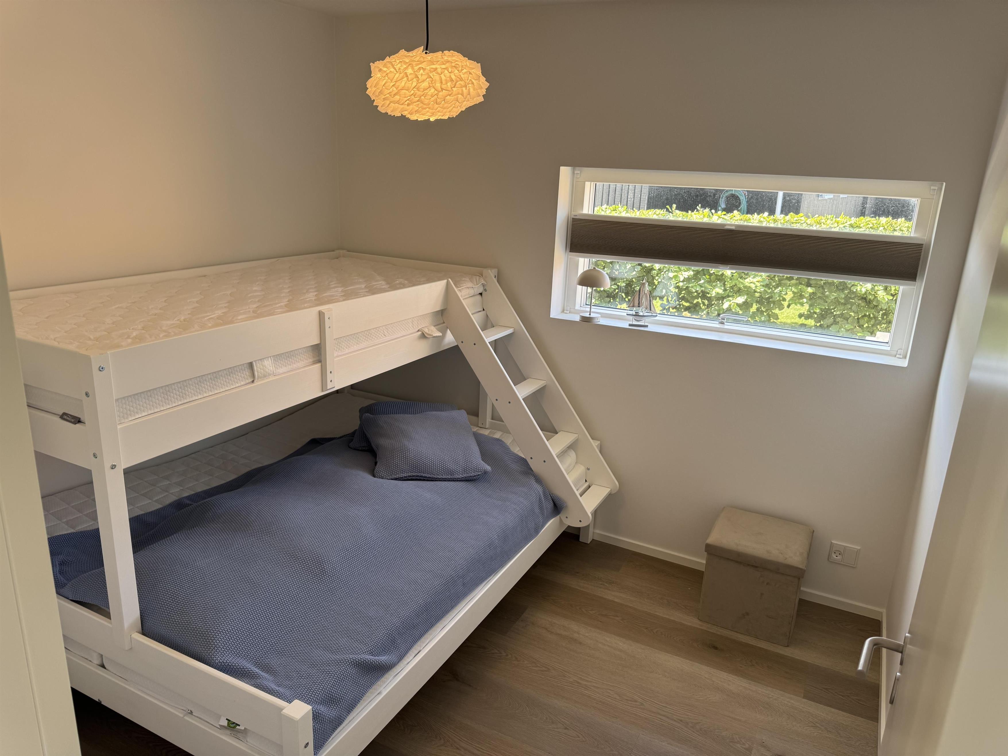 Fra alrummet går der en fordelingsgang, der rummer adgangen til entré, to badeværelser samt tre gode værelser. To af værelserne med dobbelt seng, og det sidste værelse er med køjeseng, hvor den nederste køje er en ¾ seng.