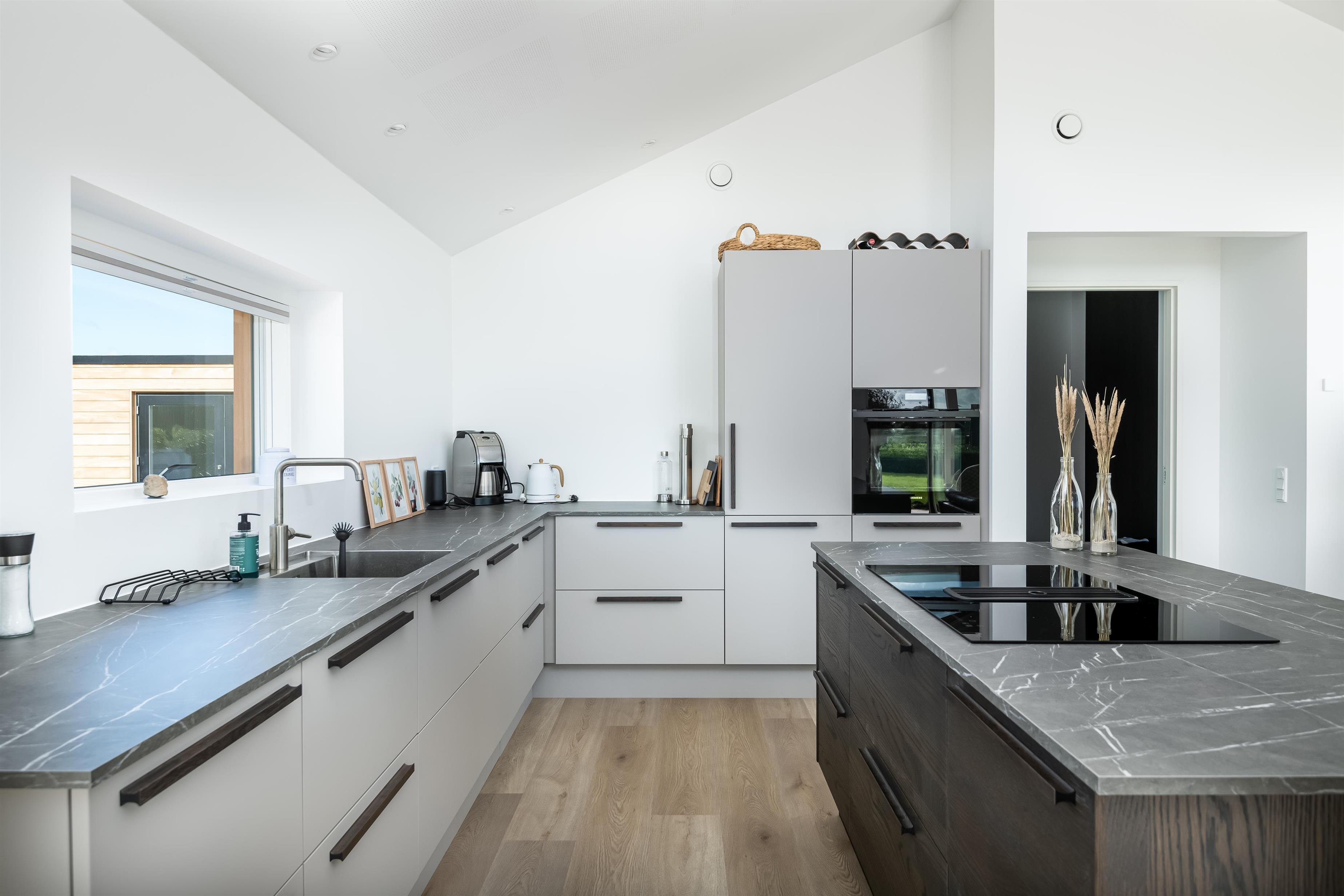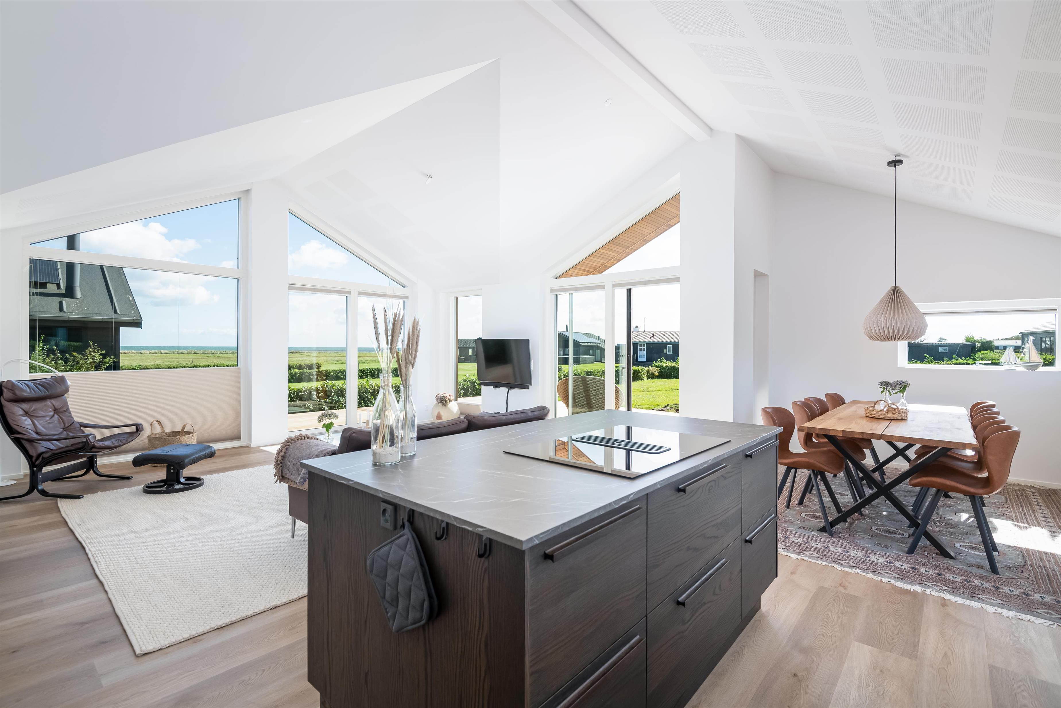 Alrummet er rummeligt, højt til loftet og lyst indrettet, med stort vinduesparti vendt mod havet. Derudover er der sofagruppe og spiseområde i tæt forbindelse med køkkenet og tilhørerende køkken ø, der indbyder til hyggelige timer og god mad. Huset er udstyret med kølefryseskab, opvaskemaskine, vaskemaskine og tørretumbler.