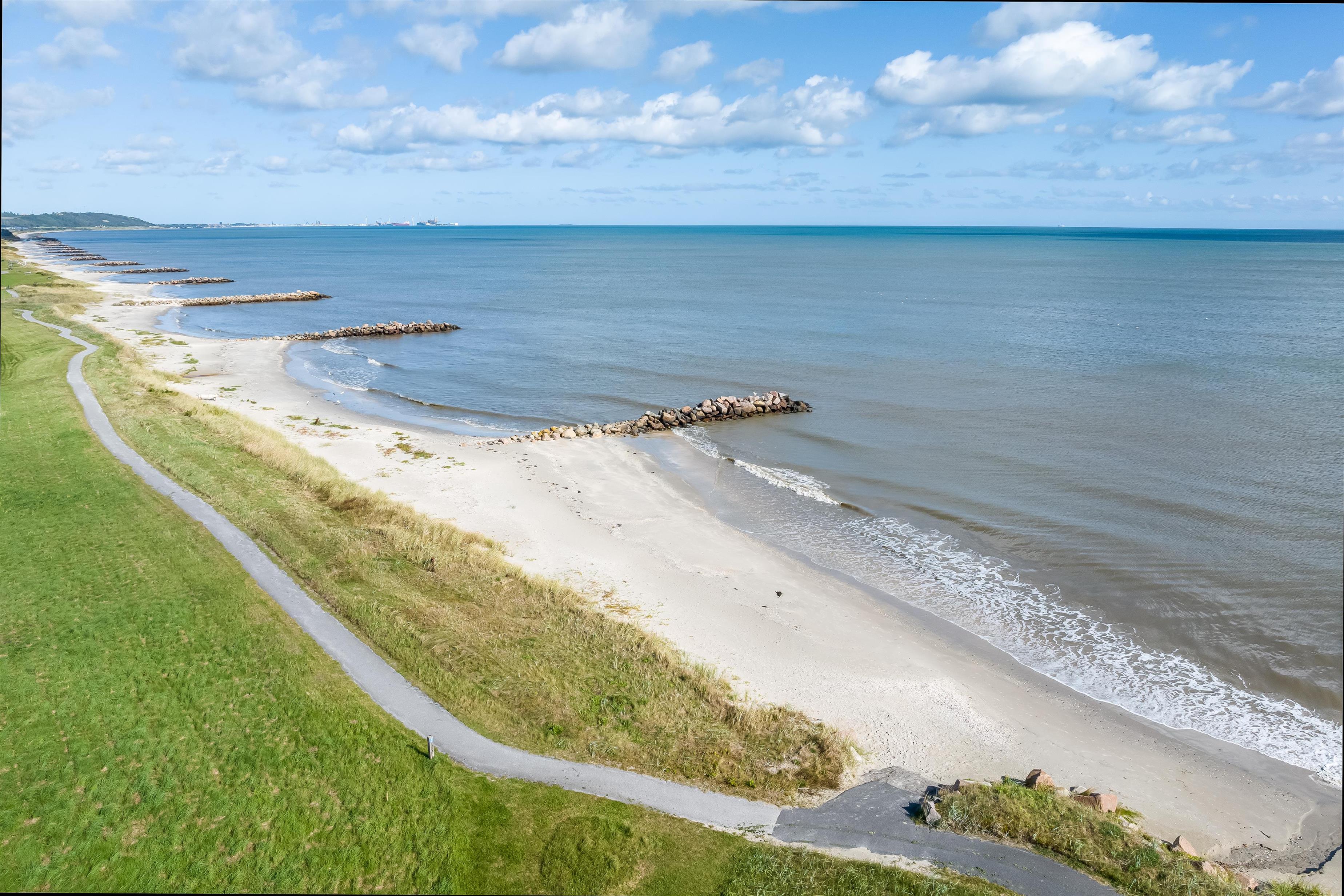 150 meter væk, med direkte sti ligger den betagende badestrand og den idylliske strandpromenade, som snor sig ind til Sæbys livlige lystbådehavn og centrum. Der er derfor rig mulighed for en dukkert inden aftensmad, hvor huset udebruser, gør det nemt at skylde sandet af fødderne.