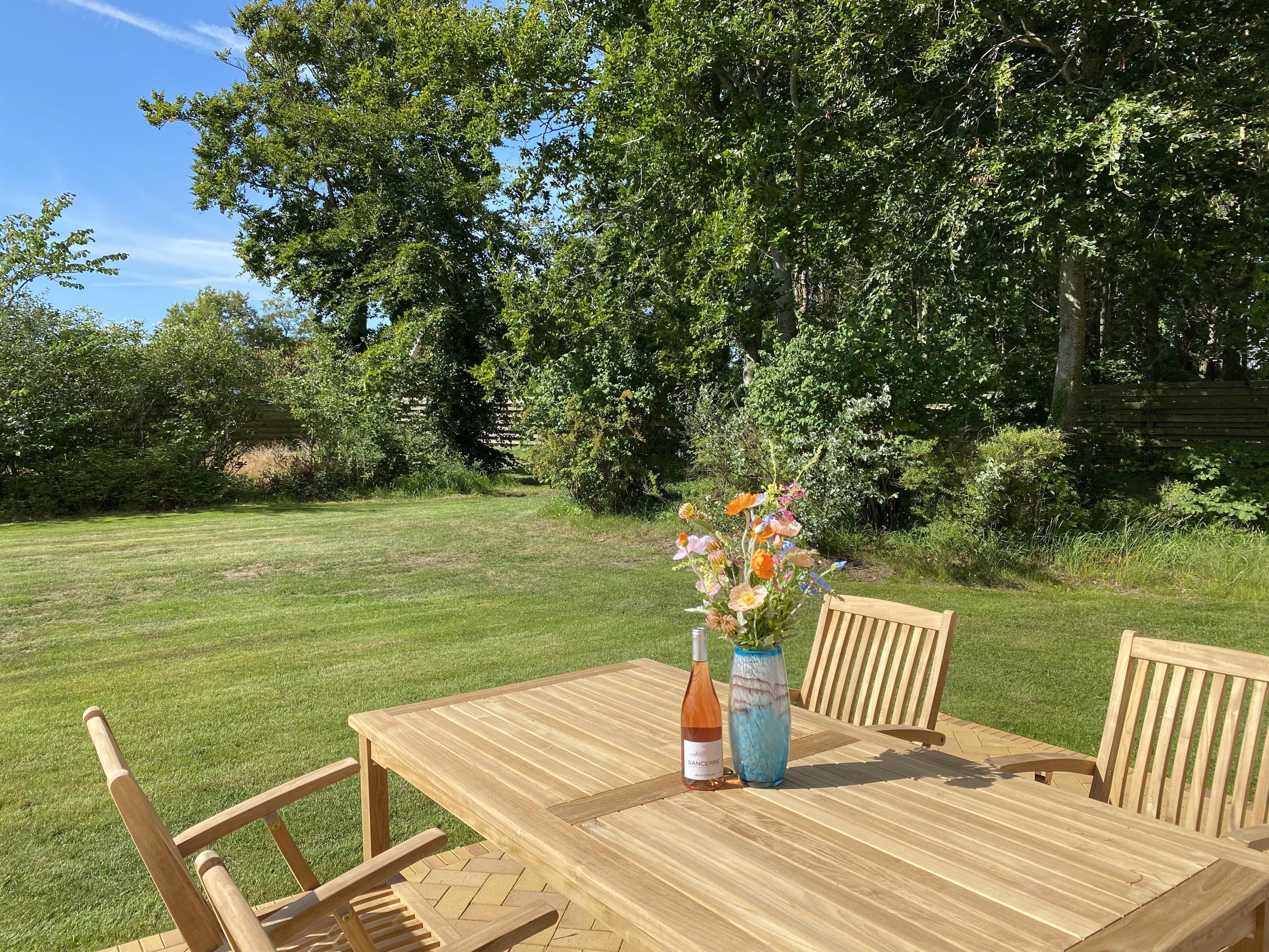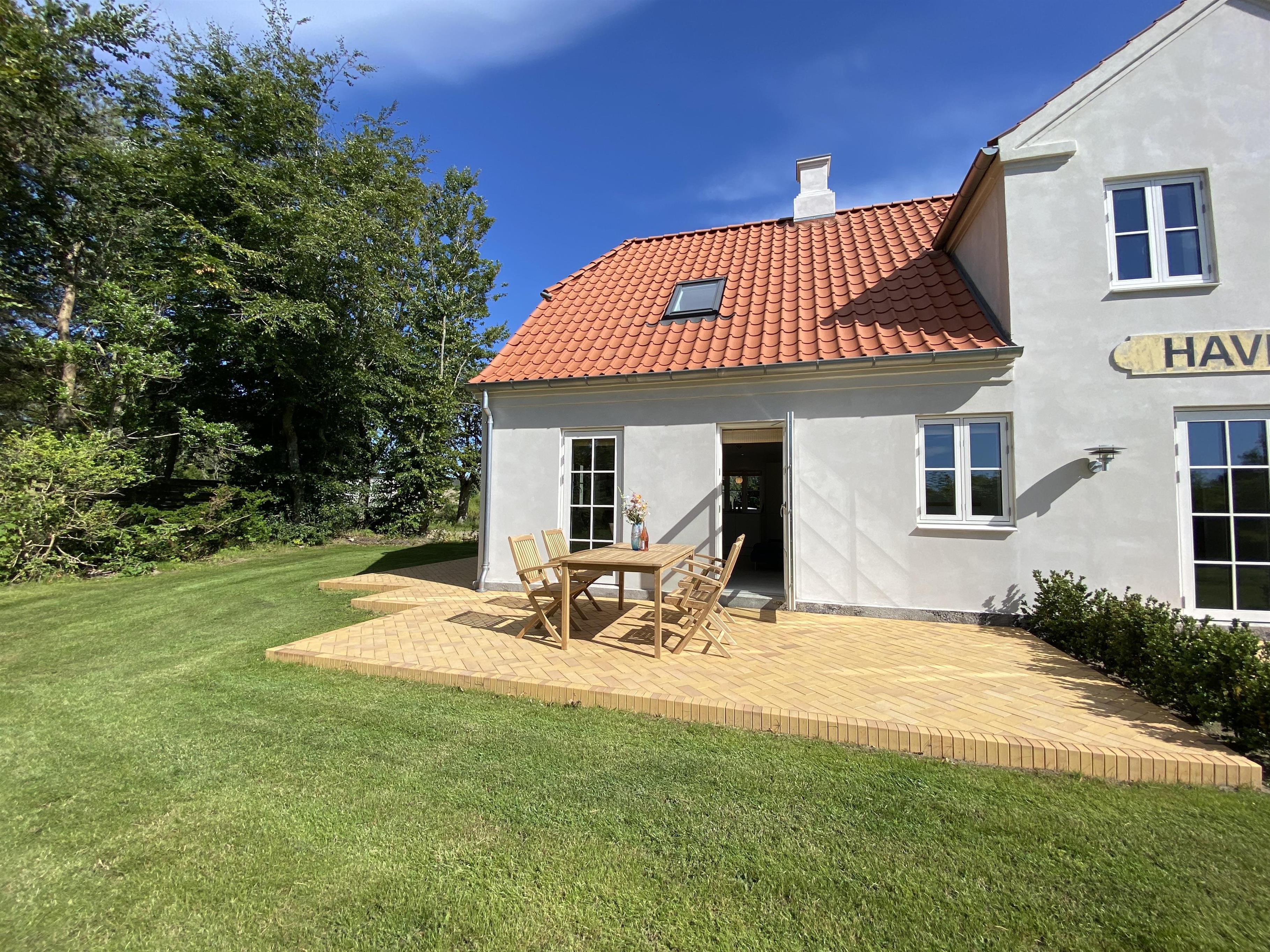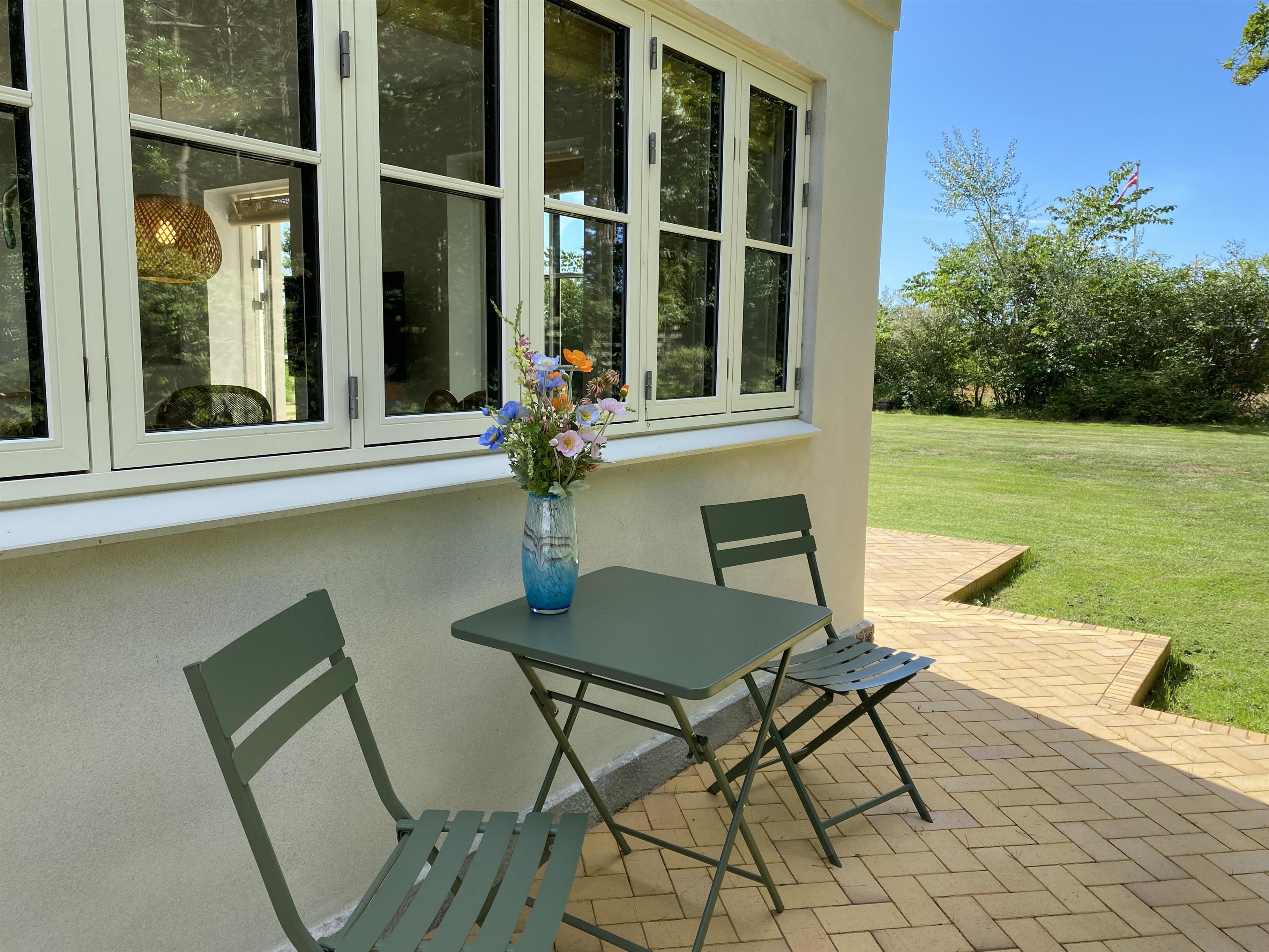 Udendørs er en hyggelig, solrig terrasse mod syd og mod vest, hvor grillen og de lange sommeraftener med ægte dansk hygge kan blive et fast indslag i ferien.